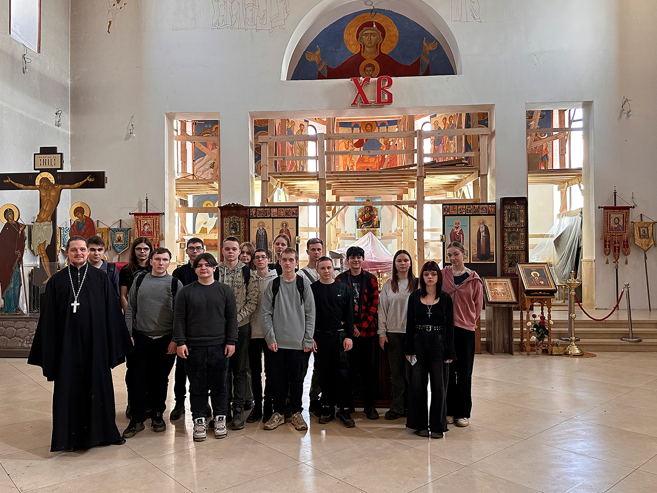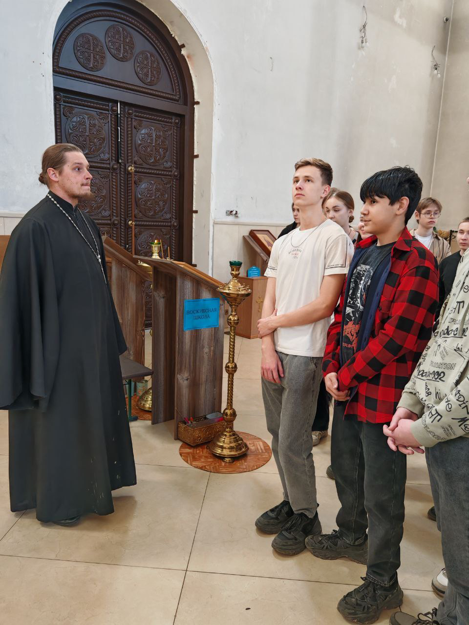 Клирик храма священник Владимир Тарасюк провел экскурсию, показал, как ведется роспись храма, по каким правилам это делается, объяснил порядок расположения сюжетов в росписи и об устройстве клироса. Во время экскурсии учащиеся задавали интересные вопросы, погружаясь в атмосферу веры в Бога и православия.