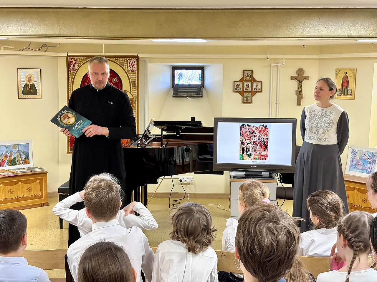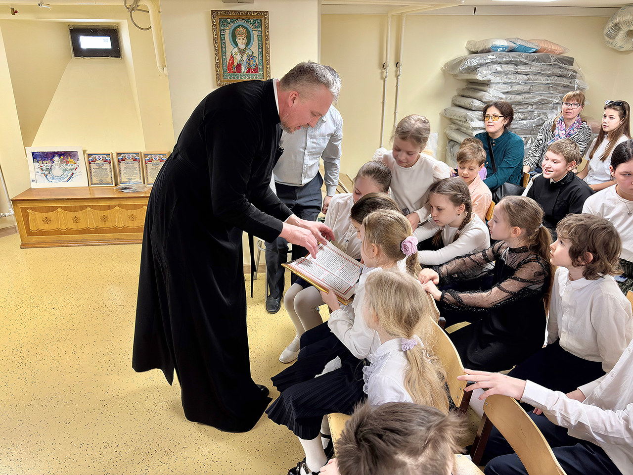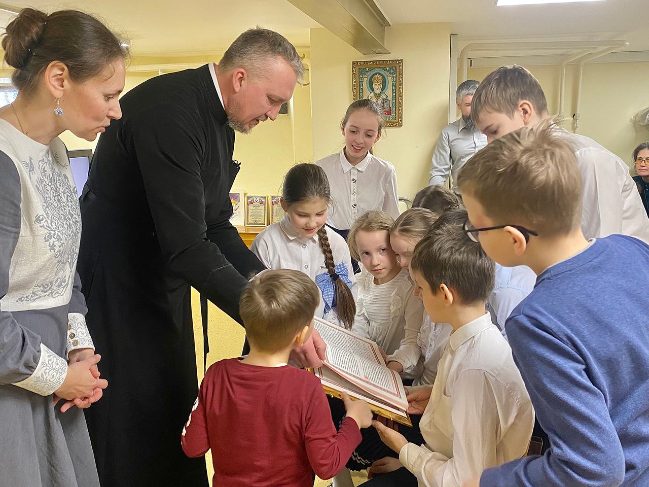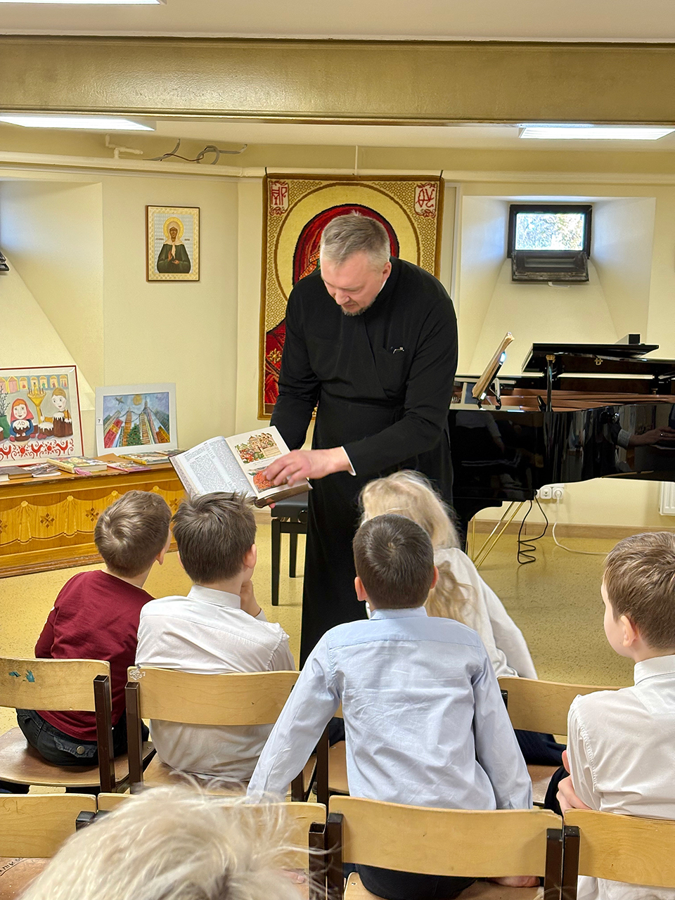 Первым выступил клирик Троицкого собора города Щёлково диакон Димитрий Задорожный, который рассказал детям о Священном Писании, показал издание, иллюстрированное красочными миниатюрами из лицевого свода Ивана Грозного, а также богослужебные Апостол и Евангелие.