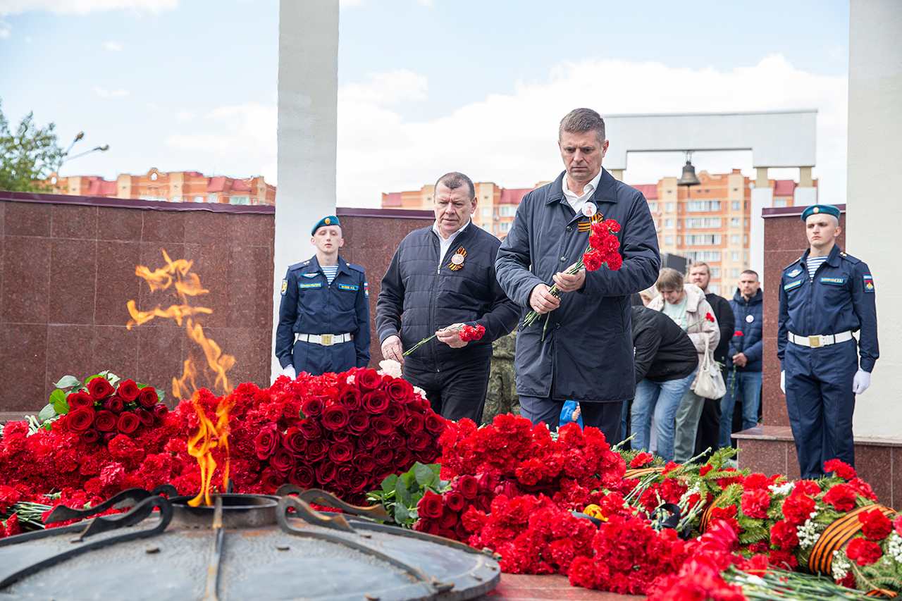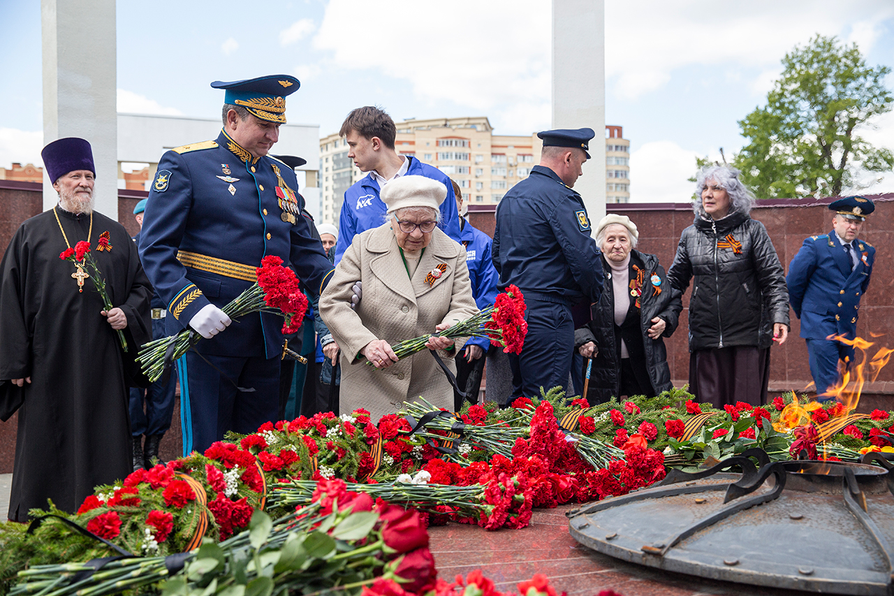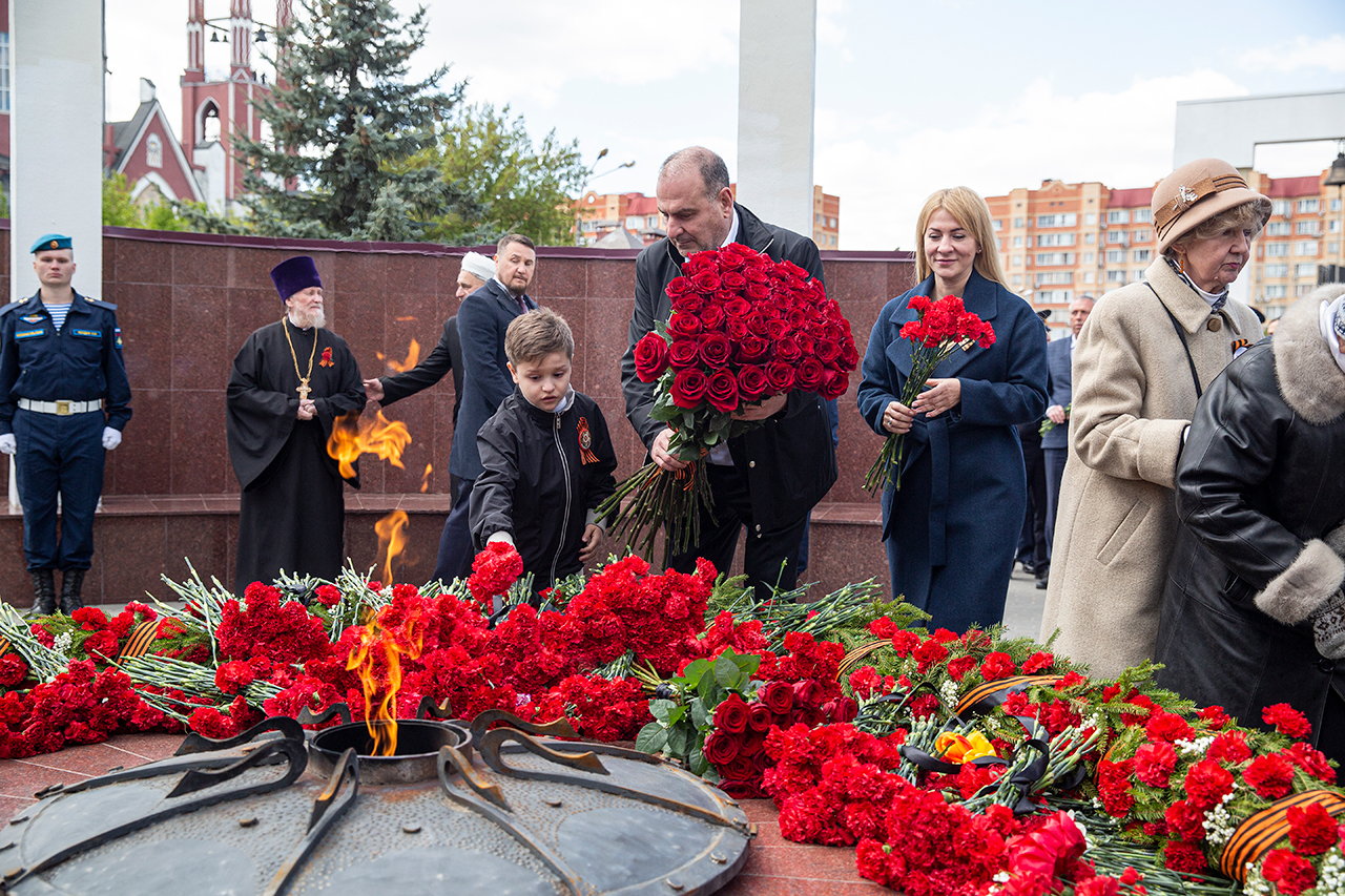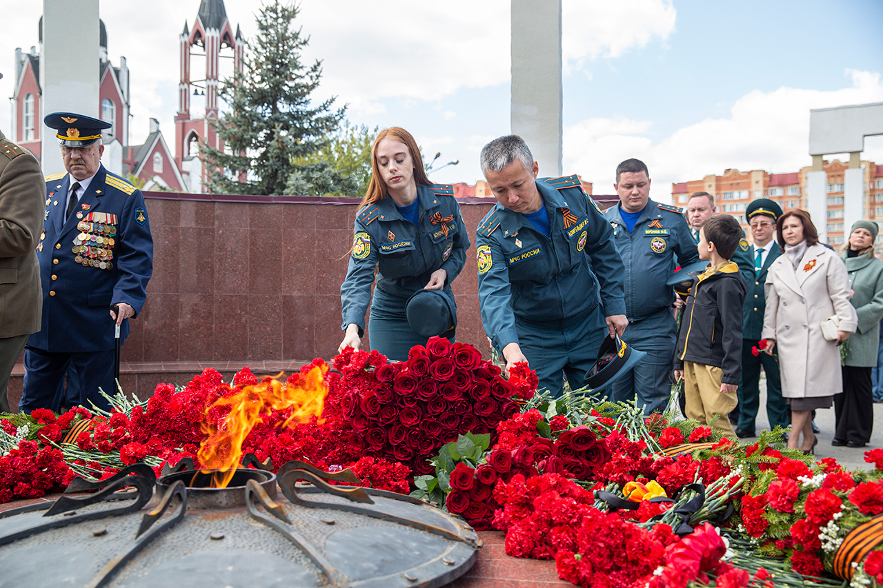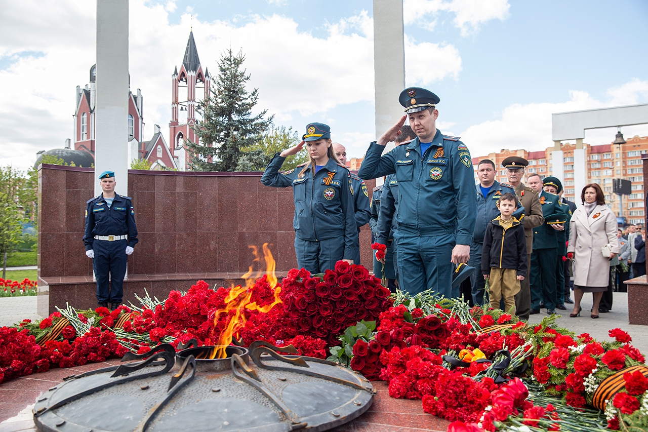 Память всех не вернувшихся с войны почтили минутой молчания. Под колокольный звон Троицкого собора к вечному огню были возложены гирлянды и корзины цветов.