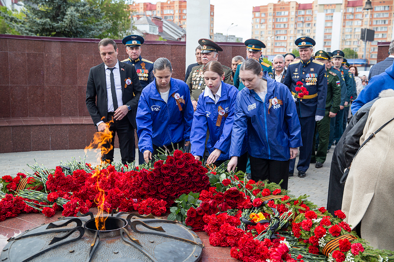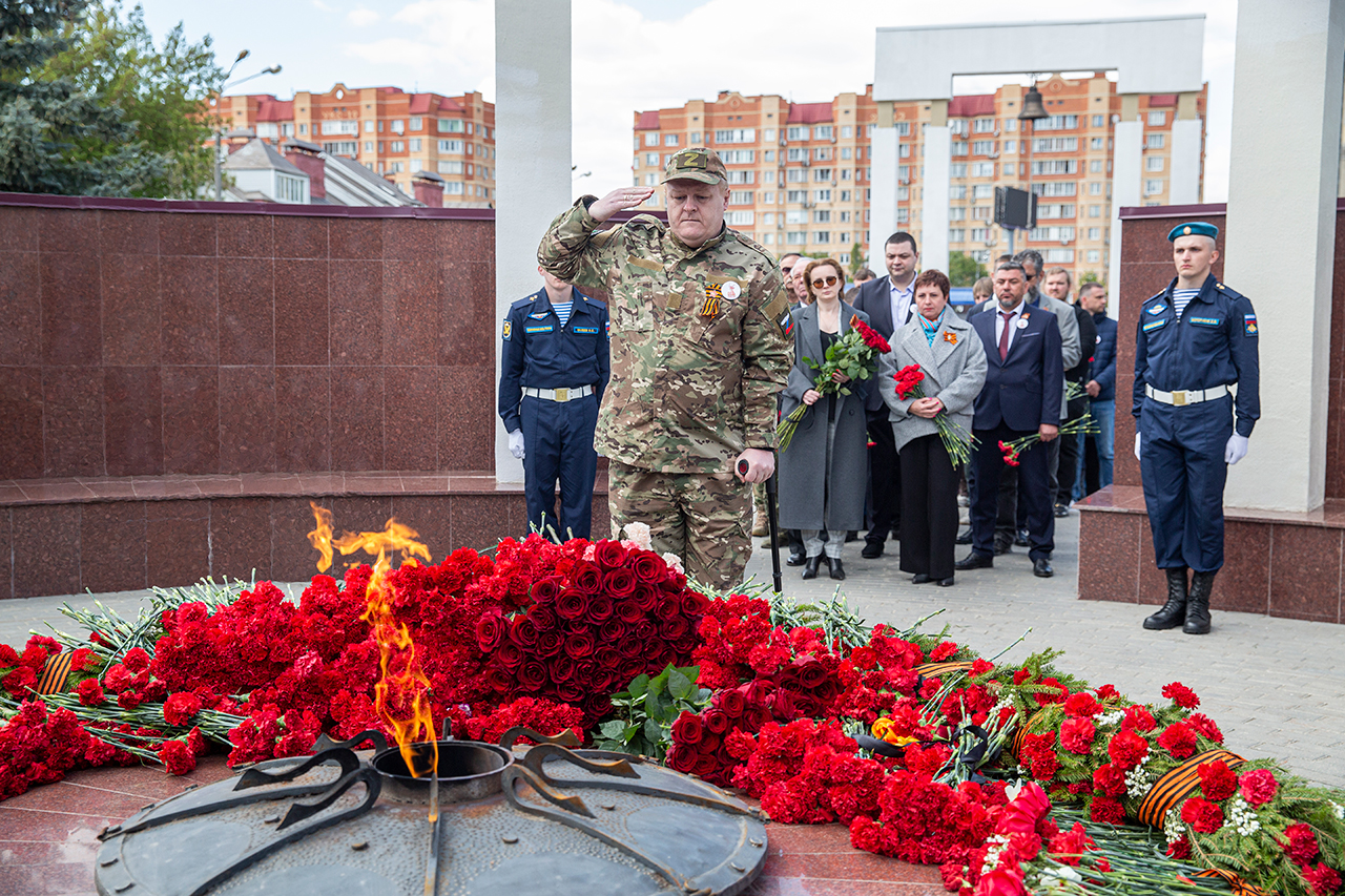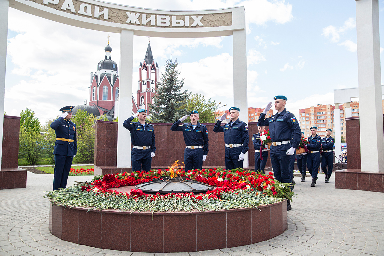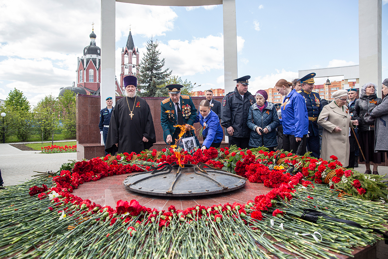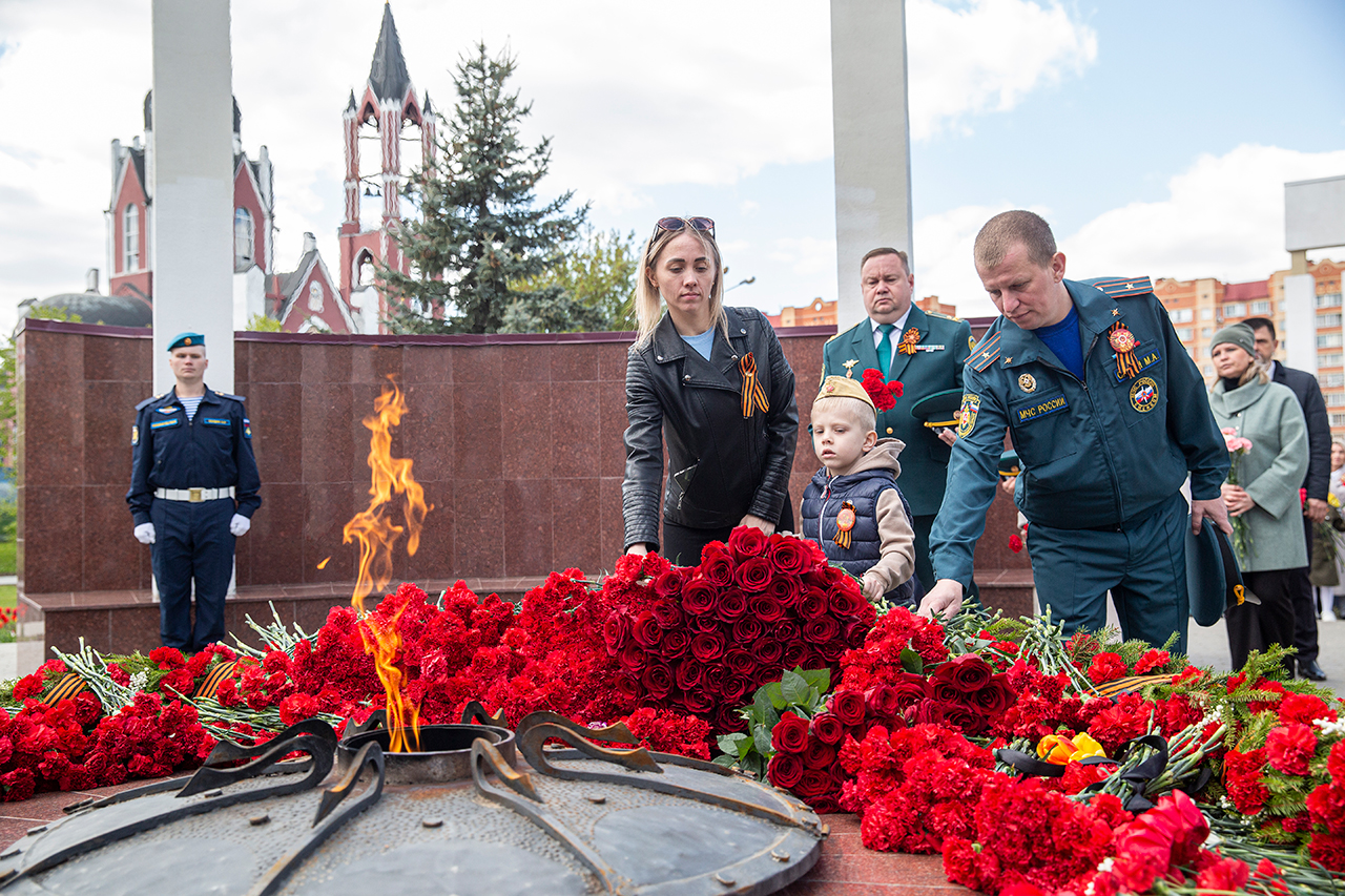 Память всех не вернувшихся с войны почтили минутой молчания. Под колокольный звон Троицкого собора к вечному огню были возложены гирлянды и корзины цветов.