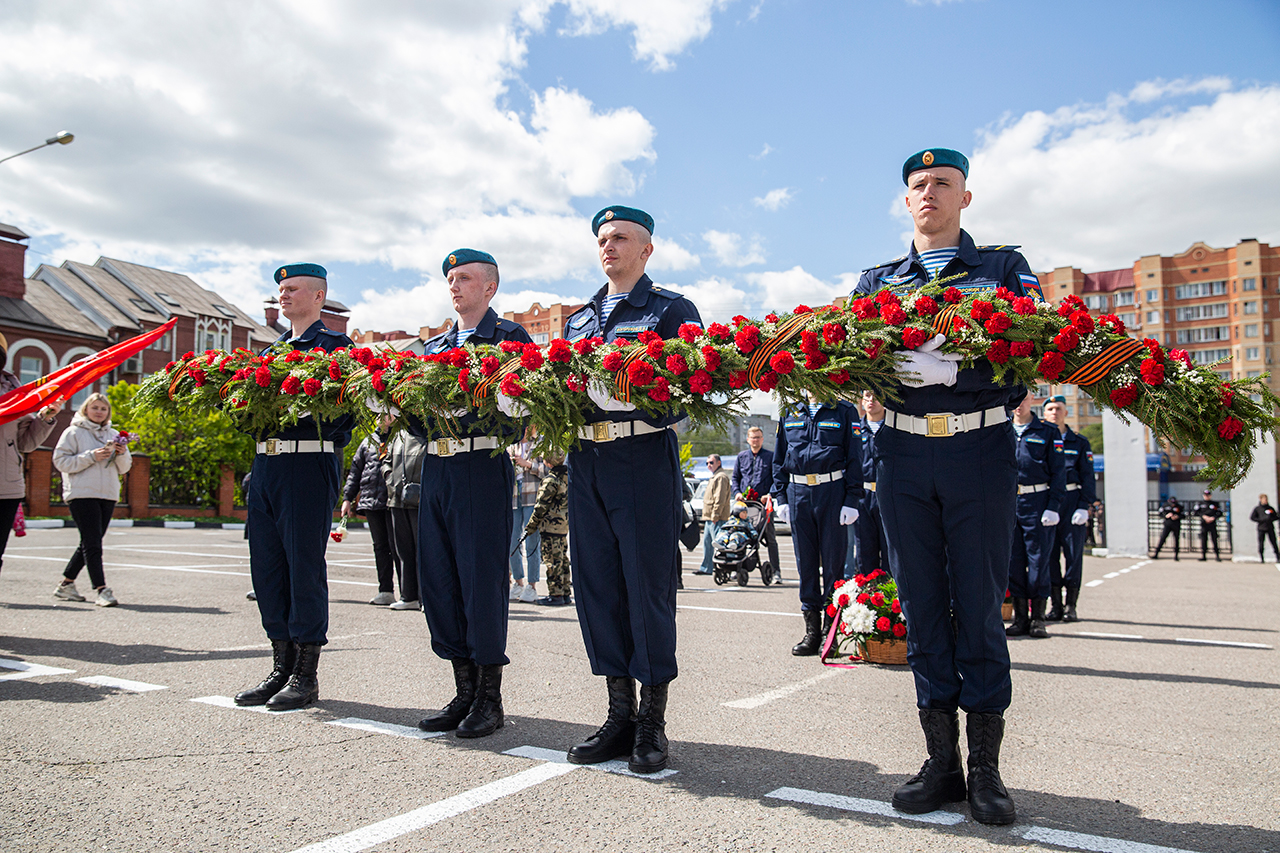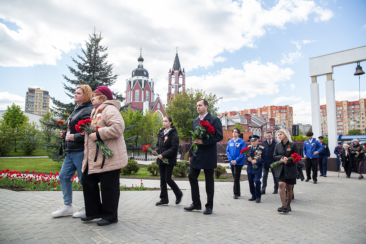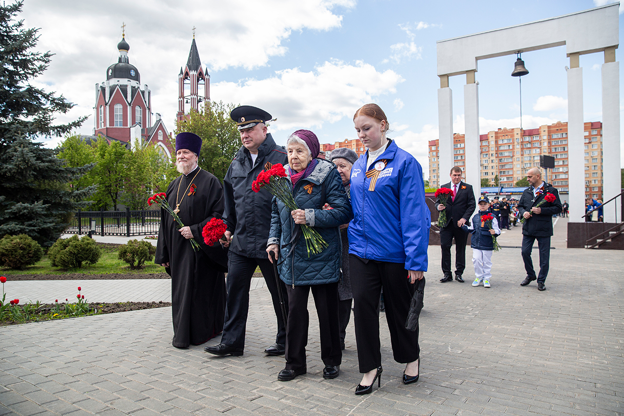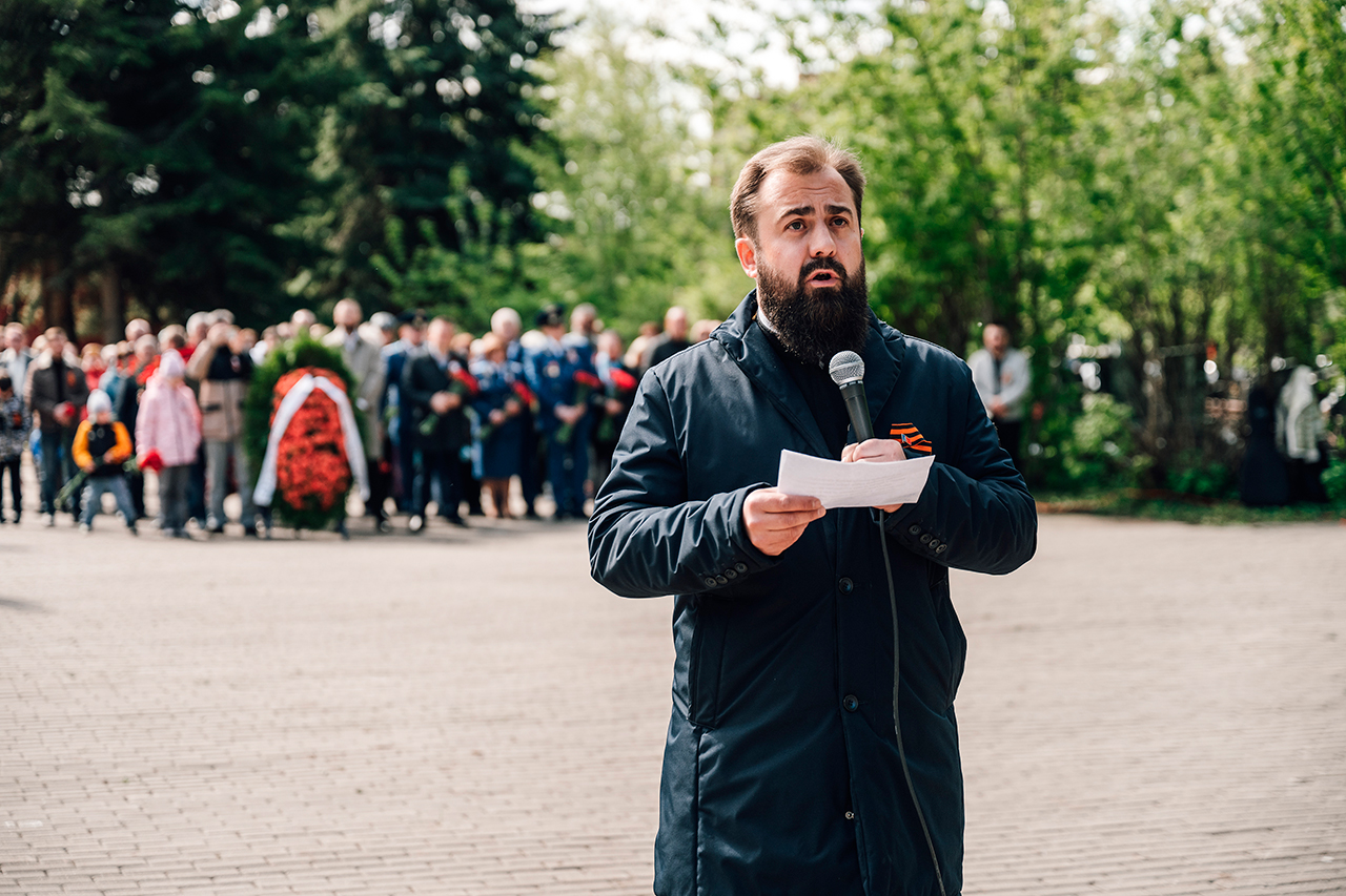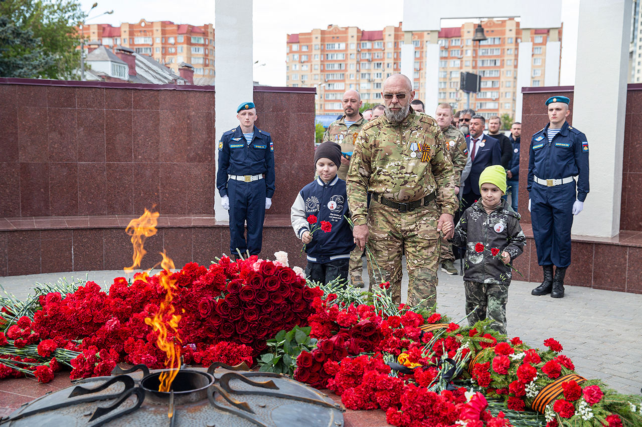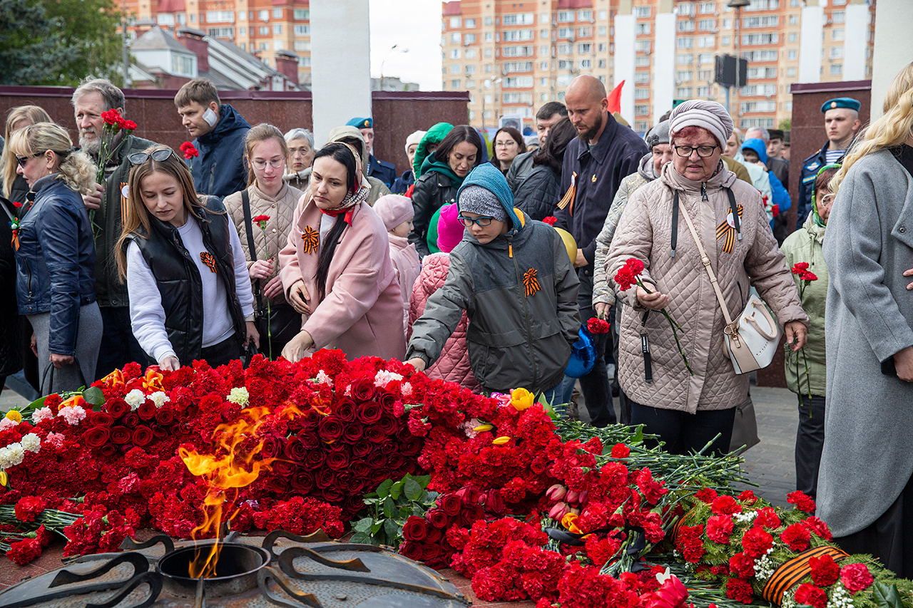 Память всех не вернувшихся с войны почтили минутой молчания. Под колокольный звон Троицкого собора к вечному огню были возложены гирлянды и корзины цветов.