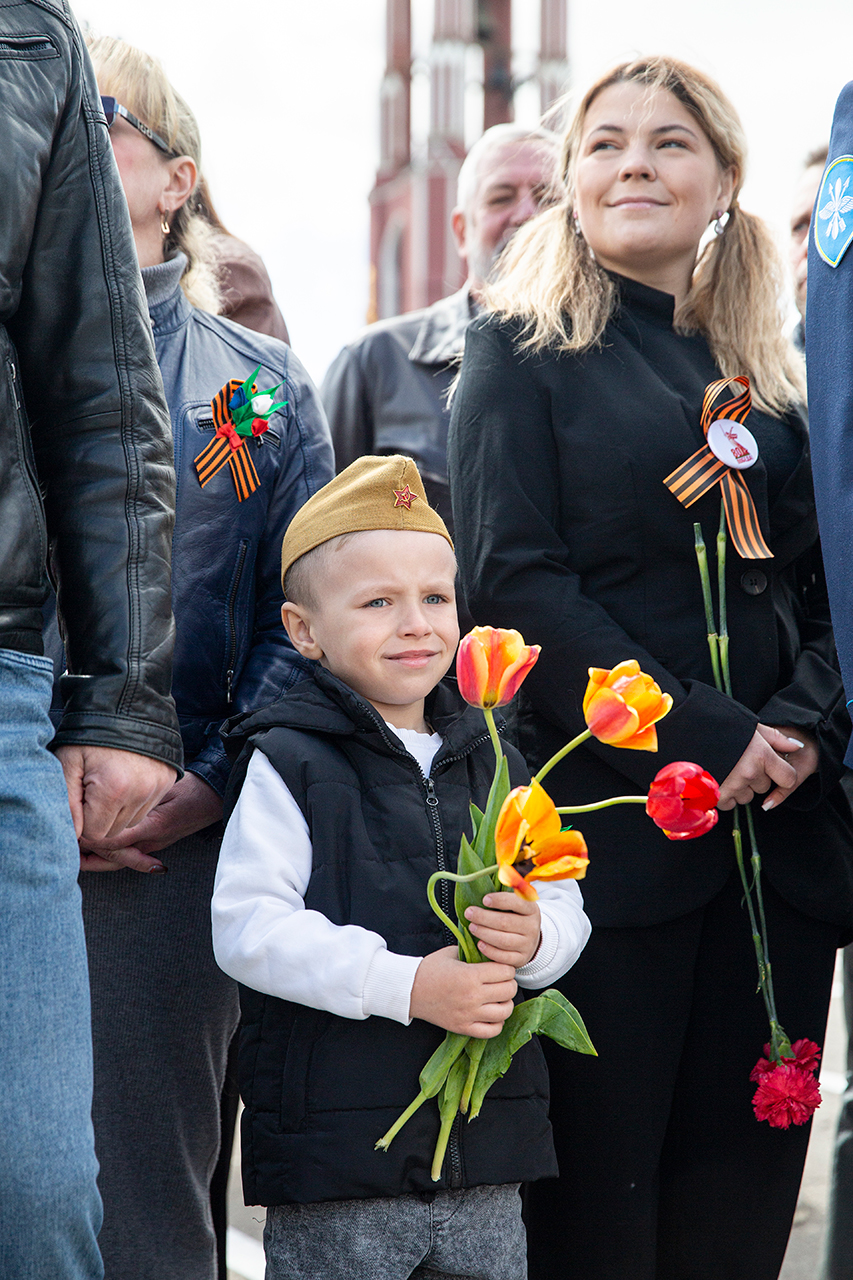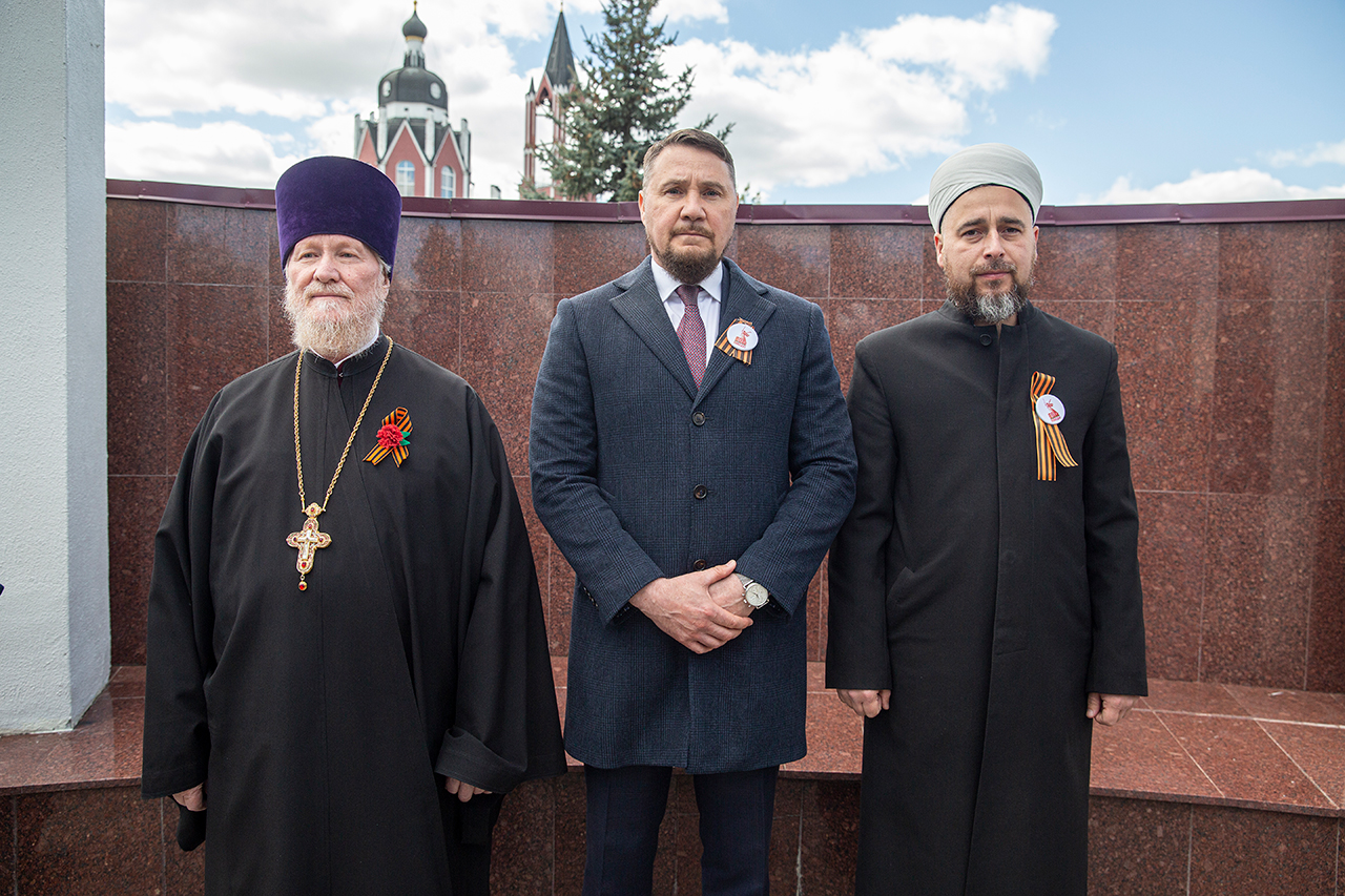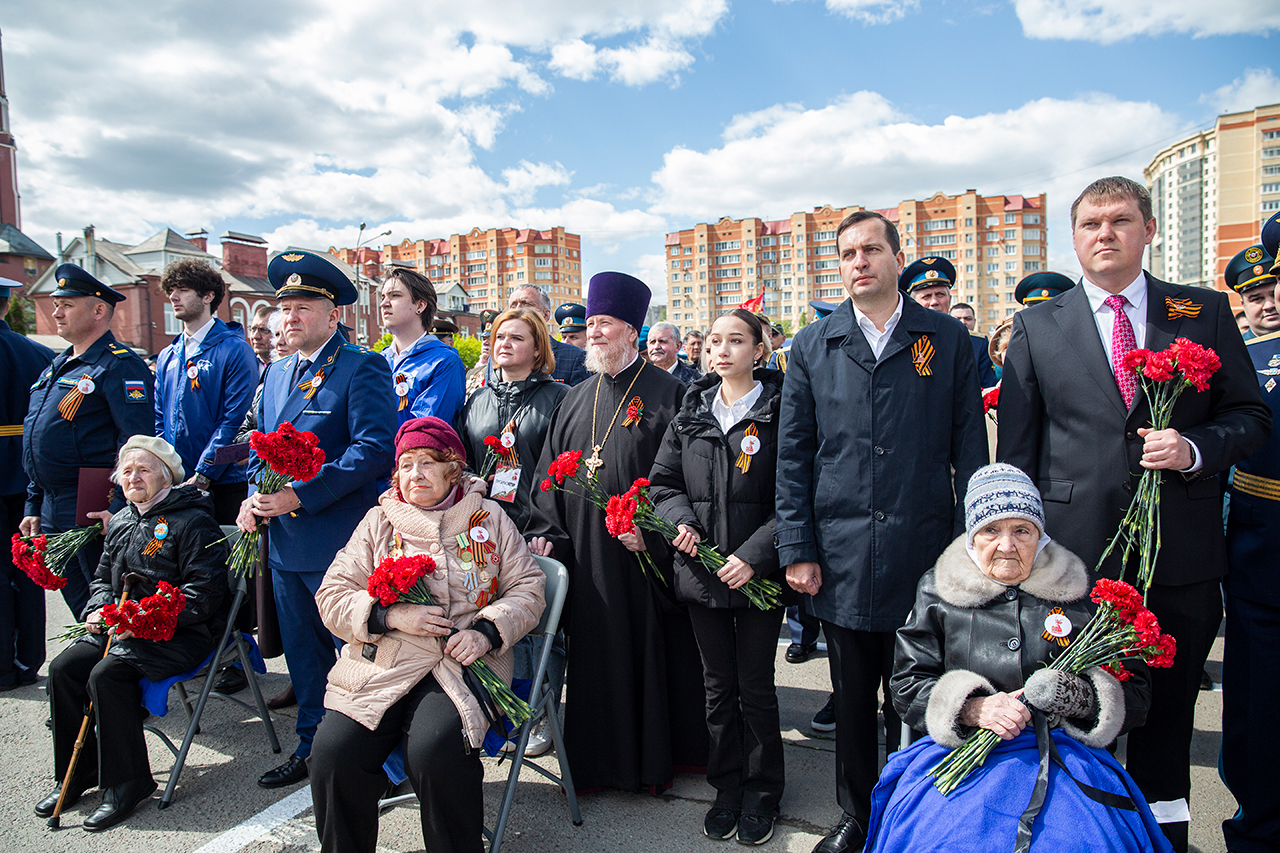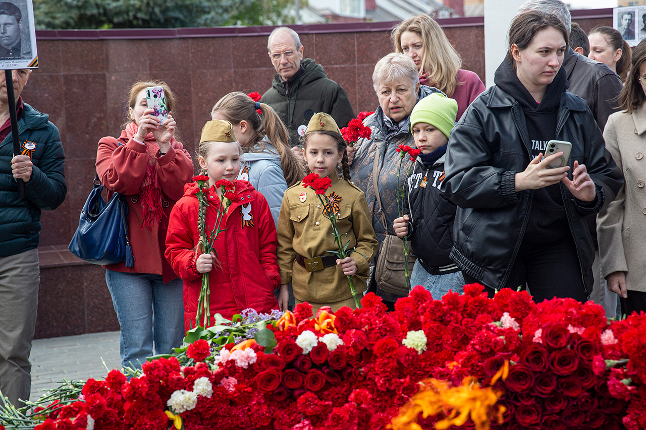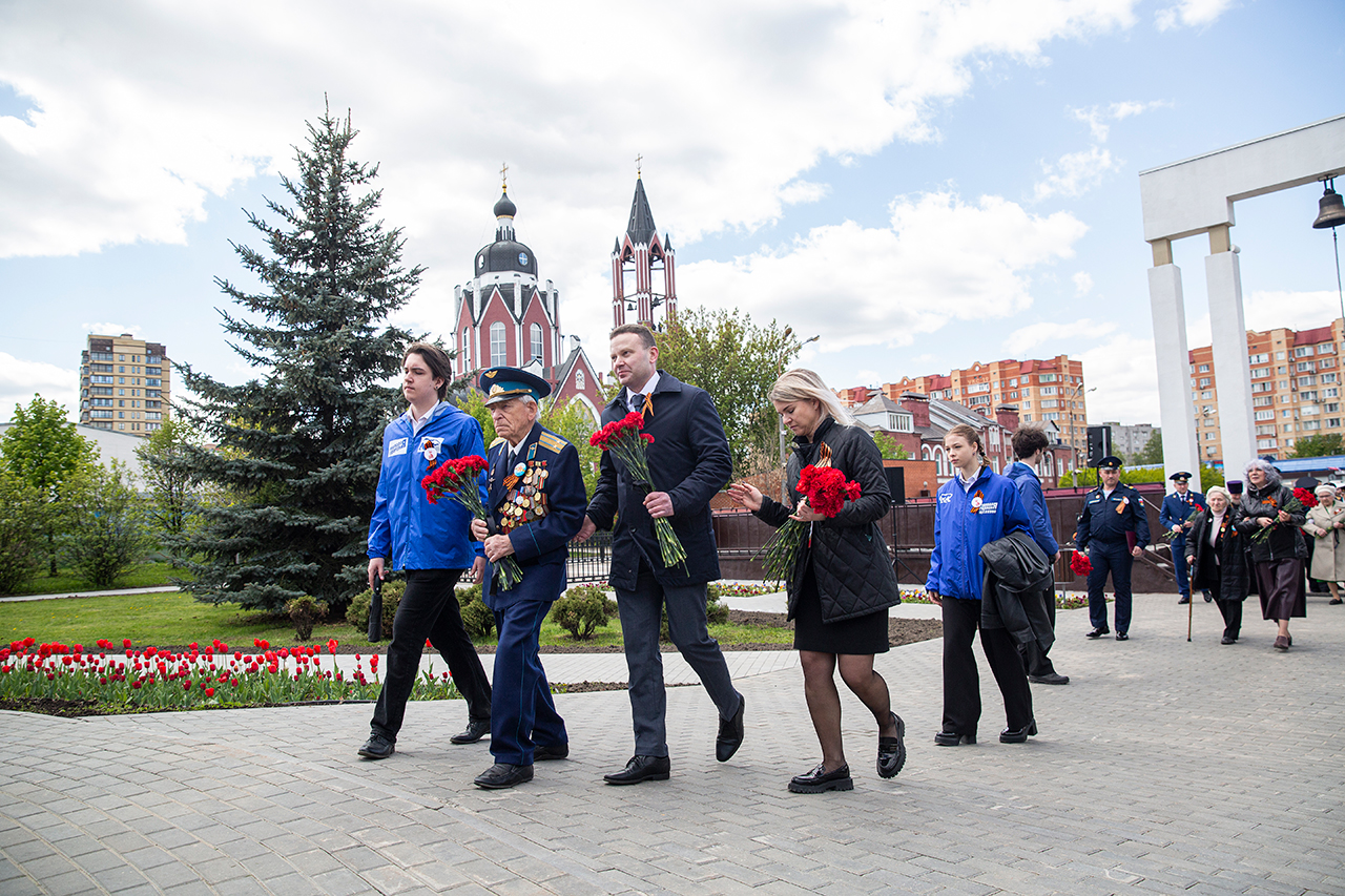 Память всех не вернувшихся с войны почтили минутой молчания. Под колокольный звон Троицкого собора к вечному огню были возложены гирлянды и корзины цветов.