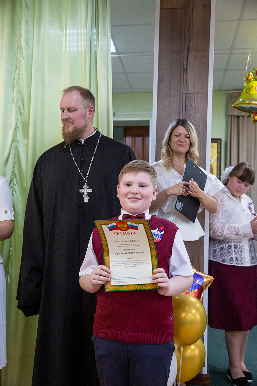 Праздник начался в храме, где после Божественной литургии был отслужен Благодарственный молебен об окончании учебного года. Торжественная часть была посвящена памяти святых равноапостольных Кирилла и Мефодия. Сводный хор гимназии с воодушевлением исполнил гимн «Слава вам, братья!» в честь святых. Программа праздника была насыщенной: это приветствия и поздравления духовника гимназии священника Павла Чекалина, директора Анны Лыгиной, награждения учителей и отличившихся учеников, вручение грамот Балашихинской епархии и Щёлковского благочиния от заместителя благочинного Щёлковского церковного округа священника Дмитрия Третьякова. Трогательные стихи и песни прозвучали в исполнении ребят 4 класса (кл. рук. Е.Г.Алдарова). Тёплые слова благодарности в адрес учителей сказали выпускники 9 и 11 классов (кл. рук О.И.Головлева) и родители. Радостная атмосфера царила в зале, когда ребята показали на экране юмористическую видео зарисовку «Напутствия и советы» для начальной и средней школы. В этот день было много песен (рук. И.И.Илларионова) и танцев (рук. Л.А.Мишина). И, конечно, выпускники исполнили Алексиевский вальс. В финале праздника хор исполнил марш Алексиевских гимназистов «Звонят, звонят колокола».