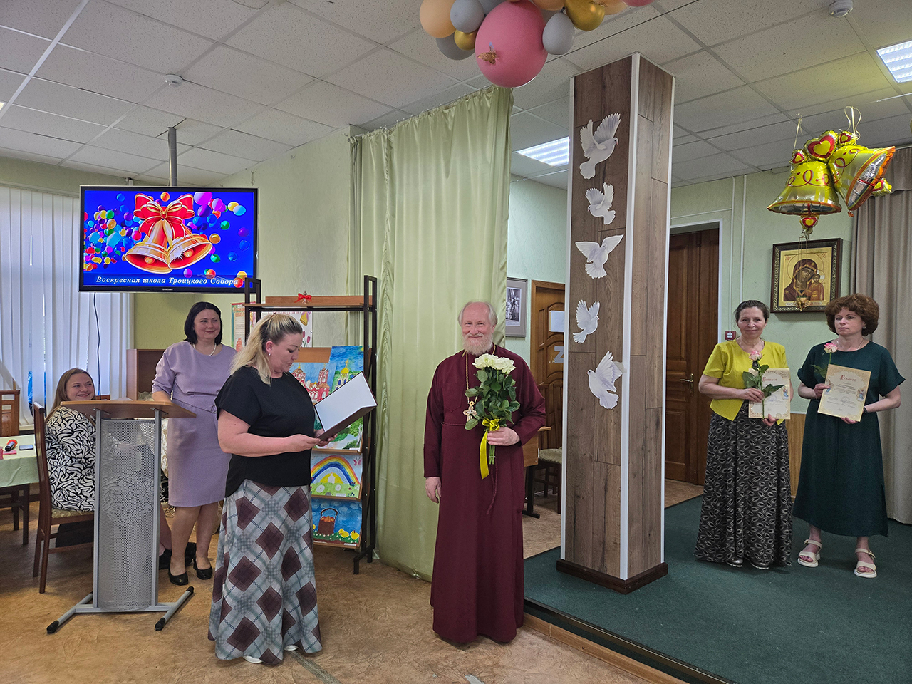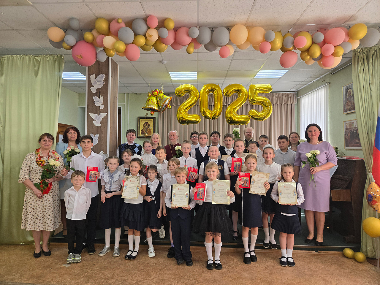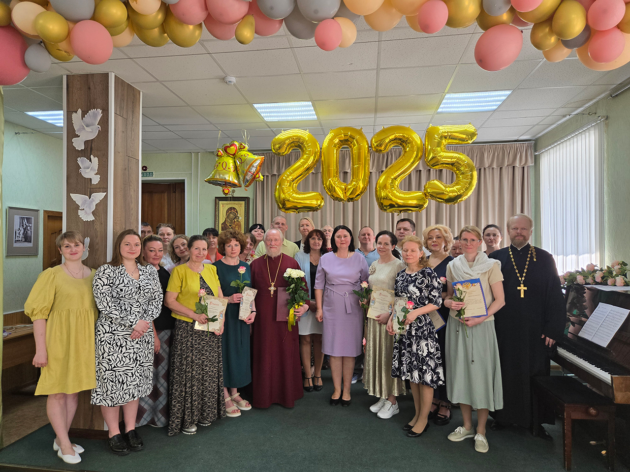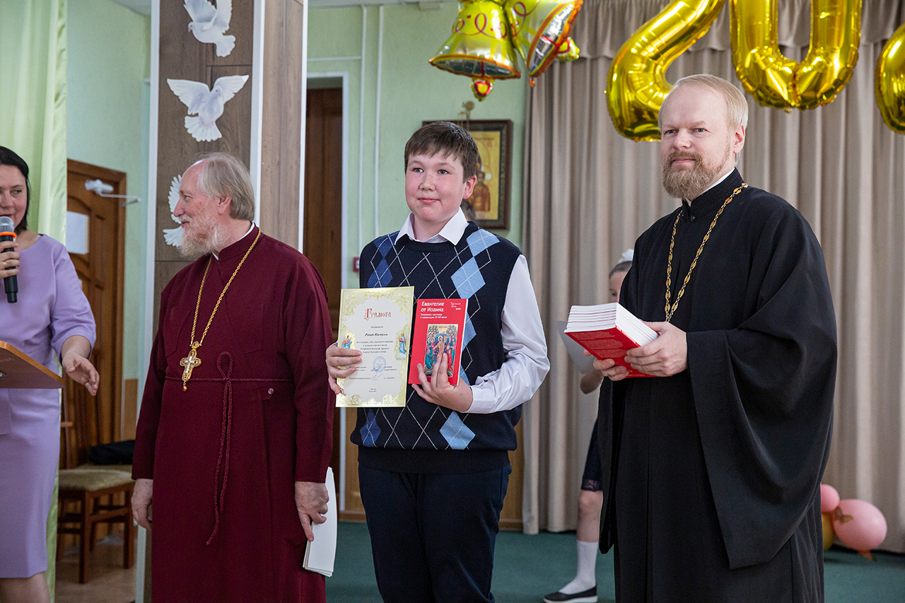После поздней Литургии в конференц-зале благочинный Щёлковского церковного округа протоиерей Андрей Ковальчук обратился к собравшимся с напутственным словом, поблагодарил коллектив воскресной школы за работу в уходящем учебном году, а также вручил воспитанникам и родителям почетные грамоты и благодарственные письма. Директор школы Анна Медведева вместе с преподавателями и священником Димитрием Медведевым поздравили детей с окончанием учебного года, поблагодарили родителей за плодотворное сотрудничество.