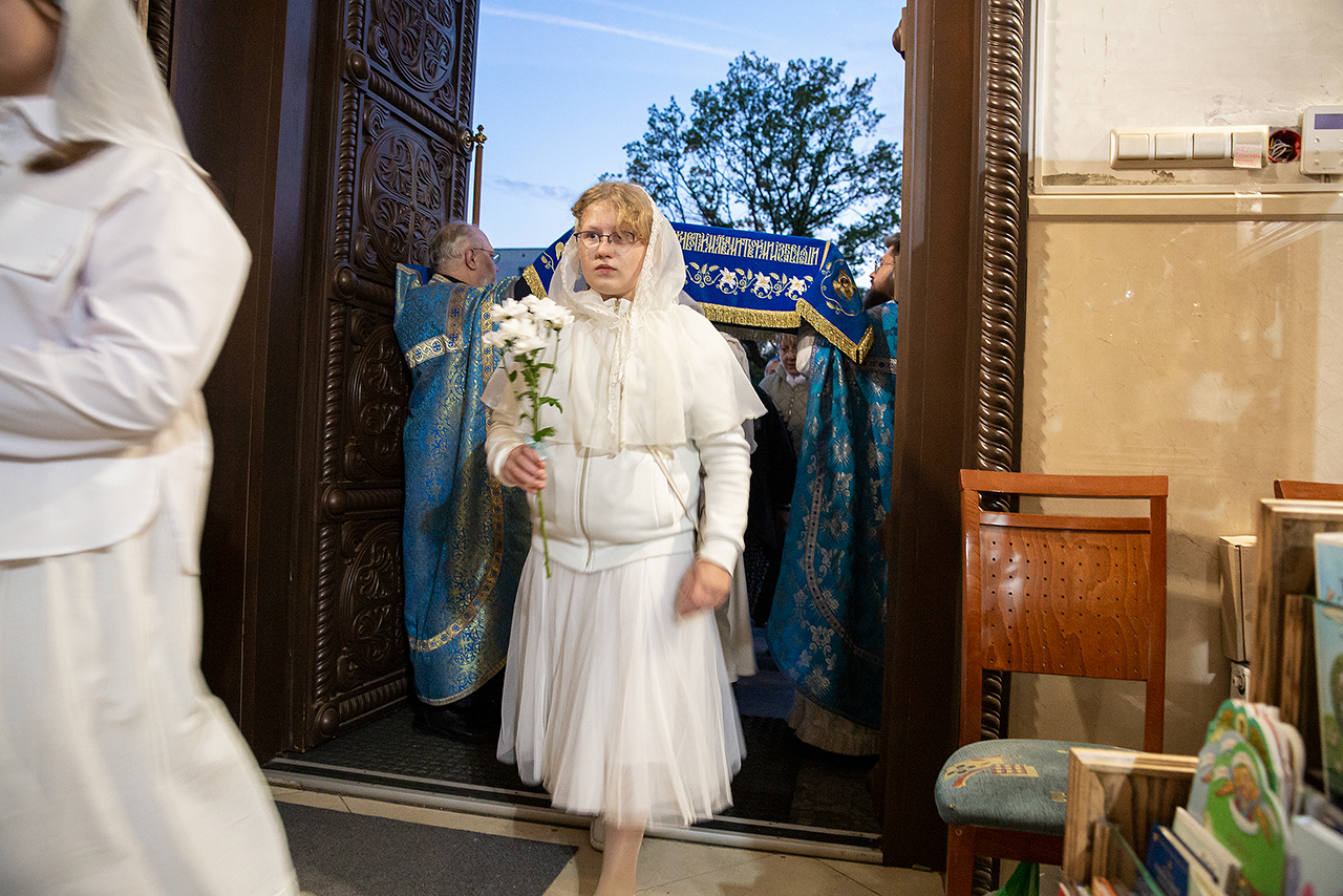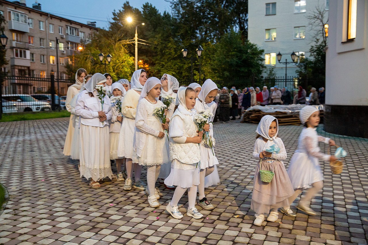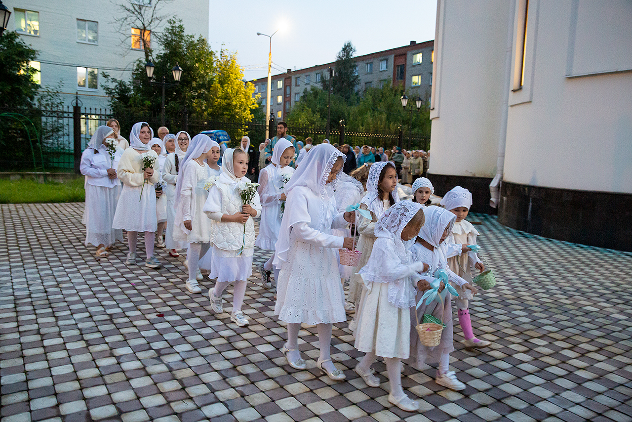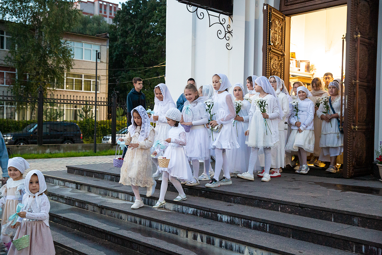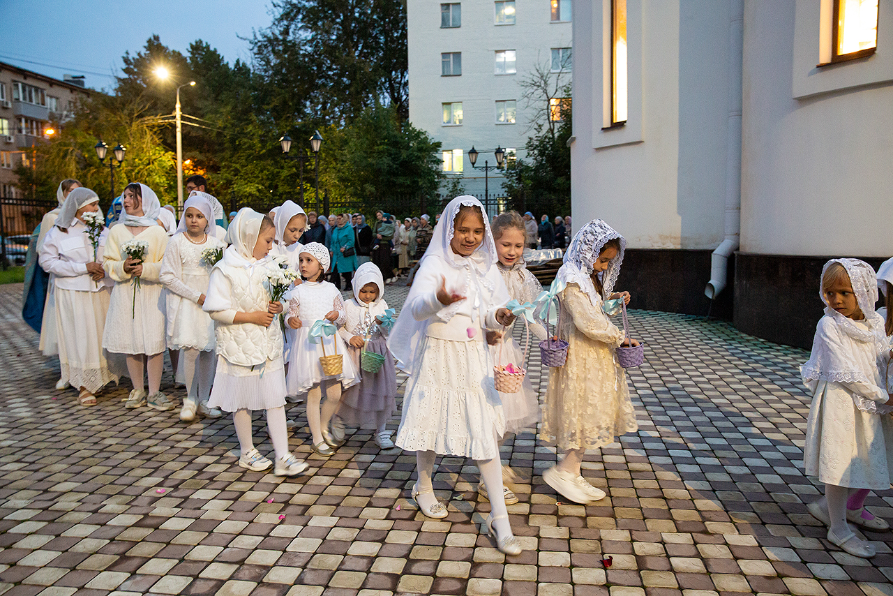 Перед Плащаницей Пресвятой Богородицы в крестном ходе прошли юные прихожанки и воспитанницы воскресной школы, одетые в белые одежды и с цветами в руках. Участие девочек придало торжественность и трогательность крестному ходу.