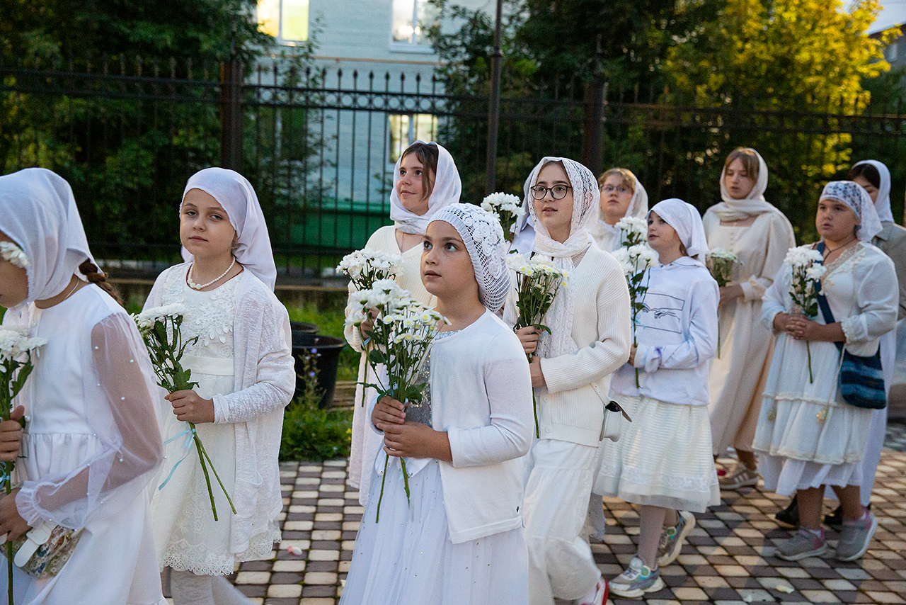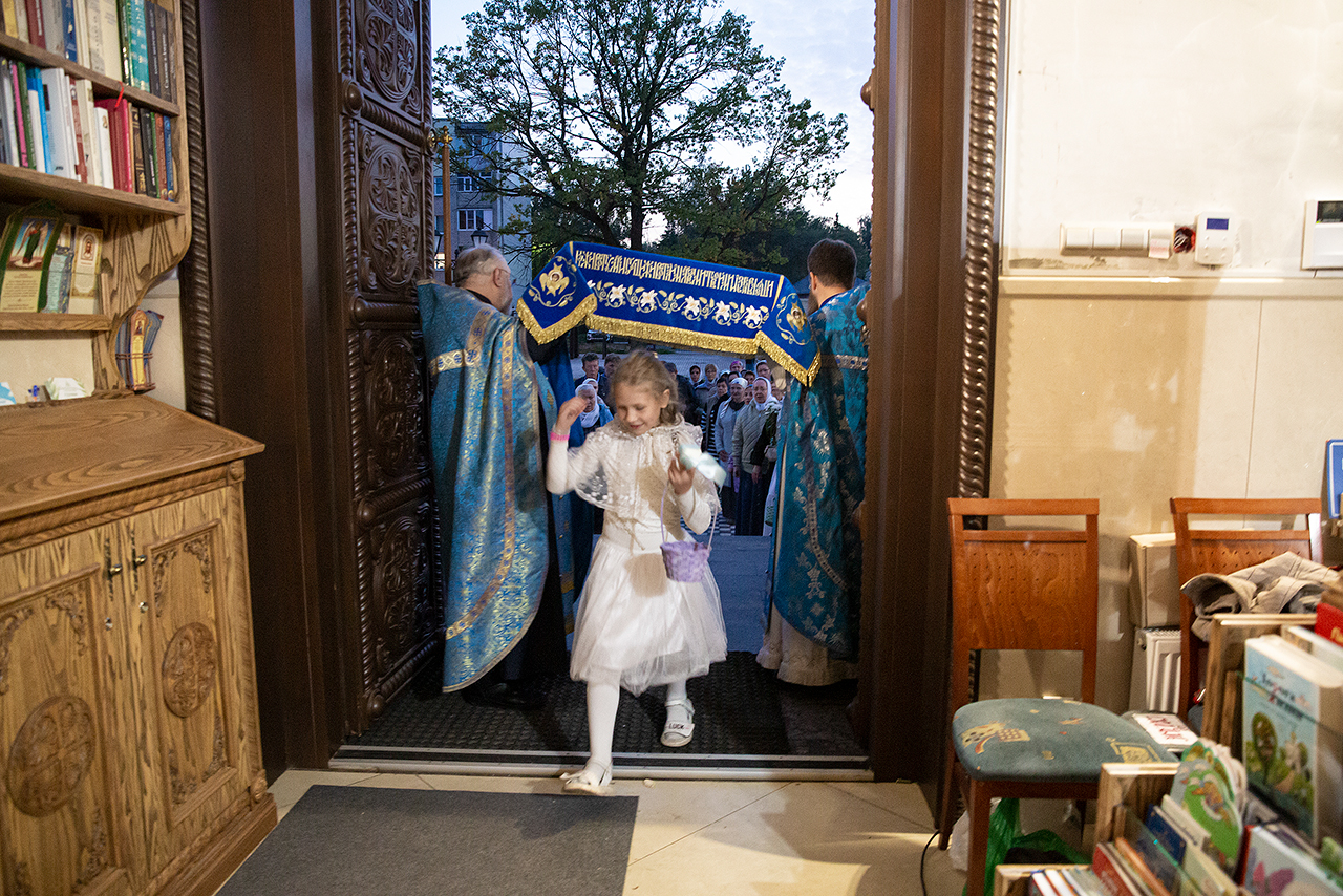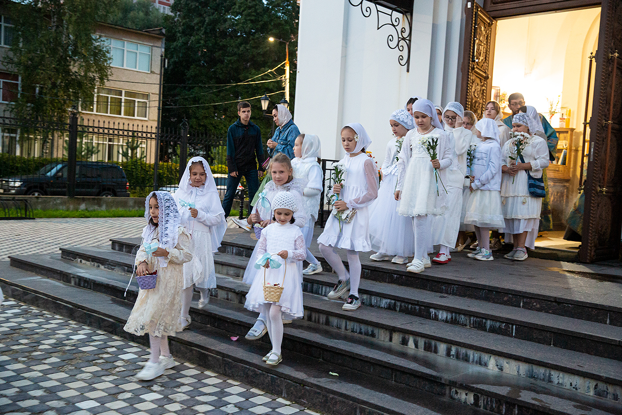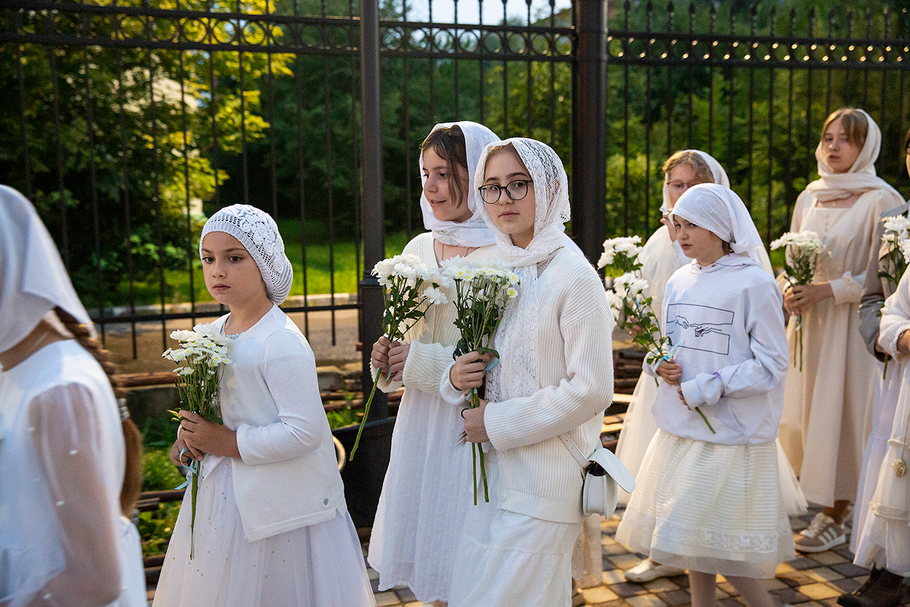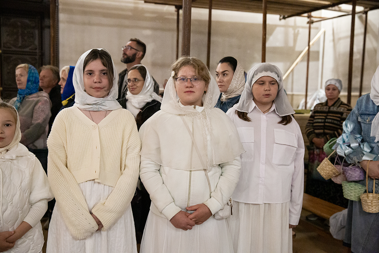 Перед Плащаницей Пресвятой Богородицы в крестном ходе прошли юные прихожанки и воспитанницы воскресной школы, одетые в белые одежды и с цветами в руках. Участие девочек придало торжественность и трогательность крестному ходу.