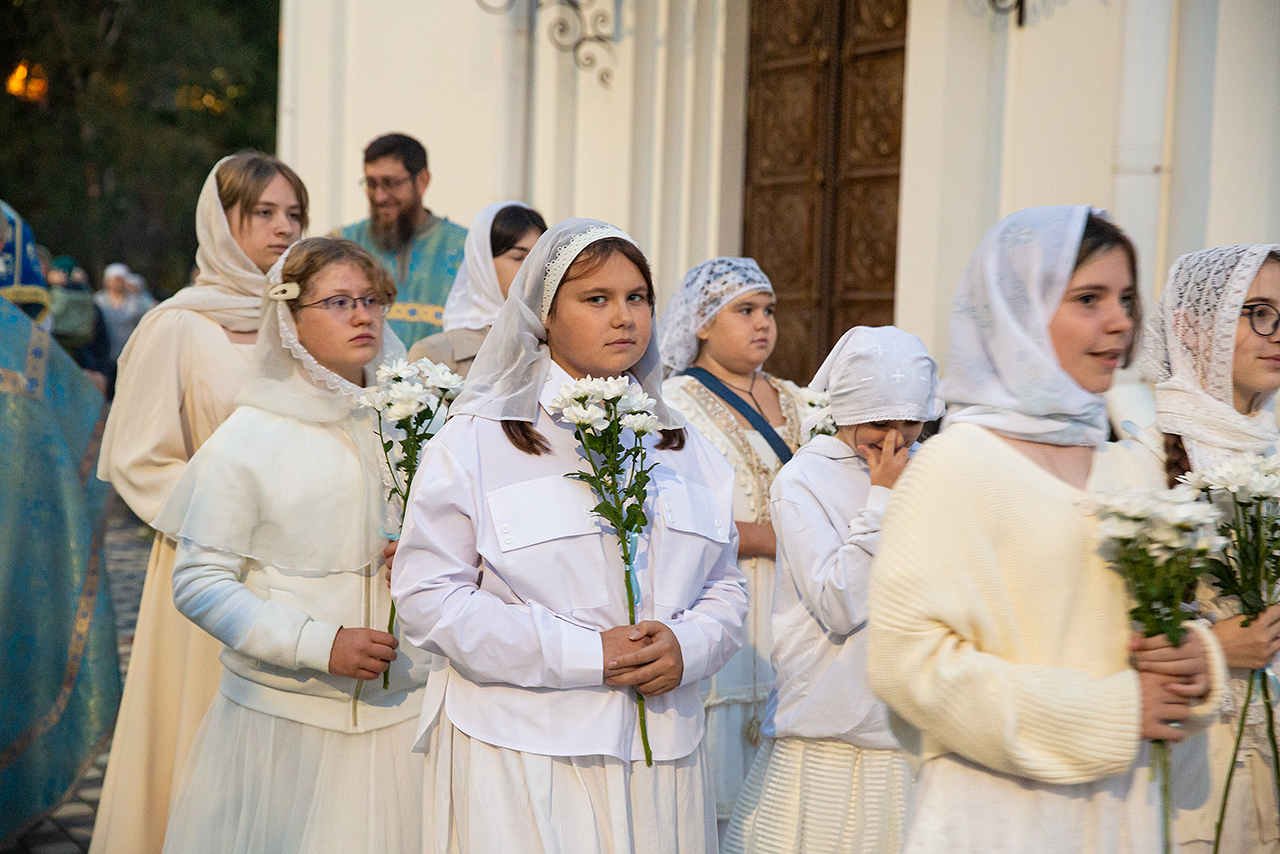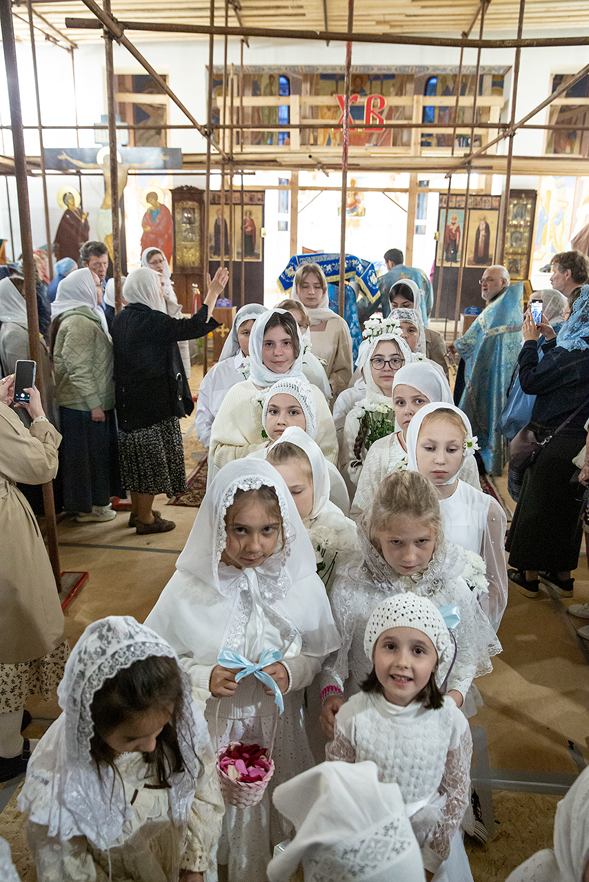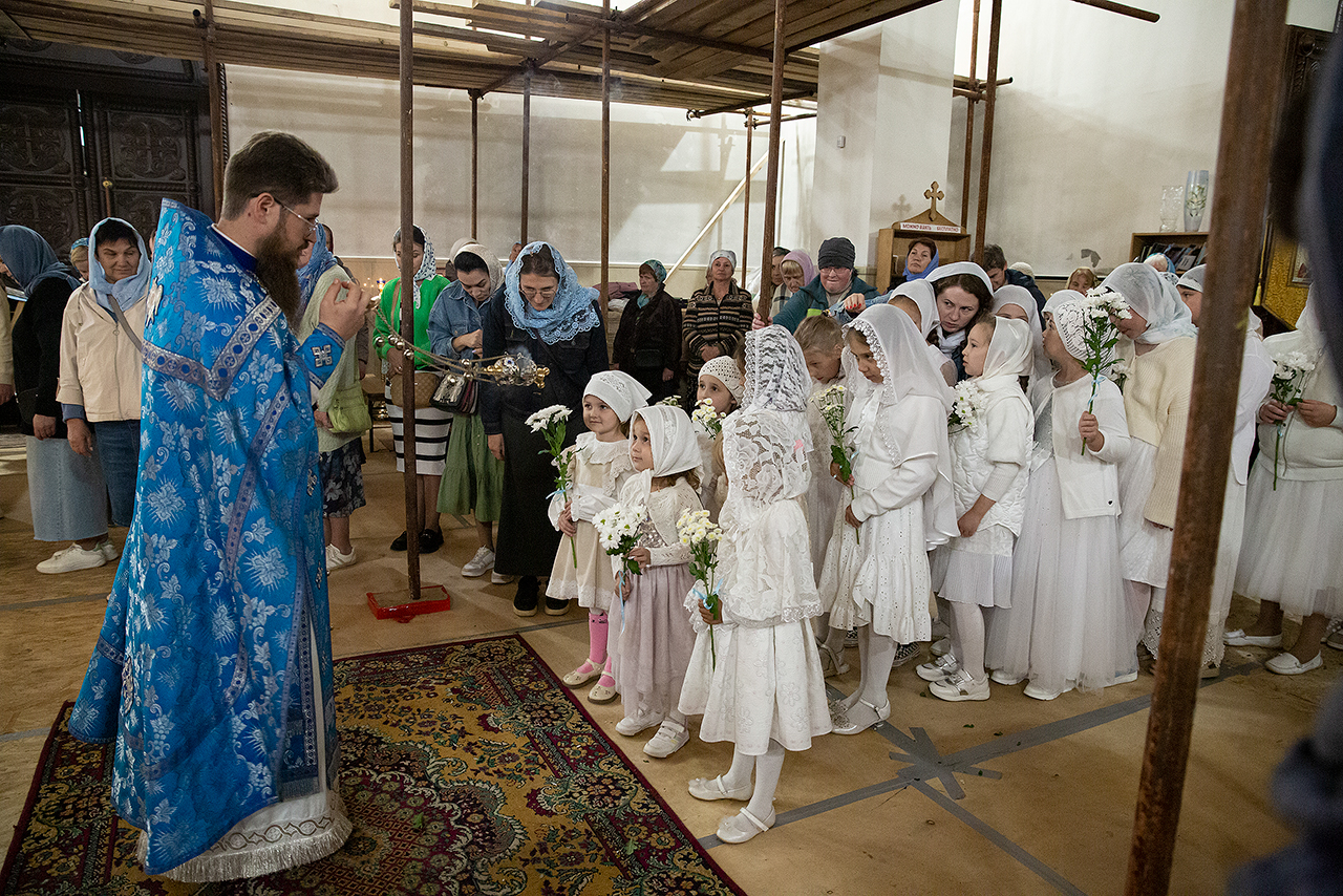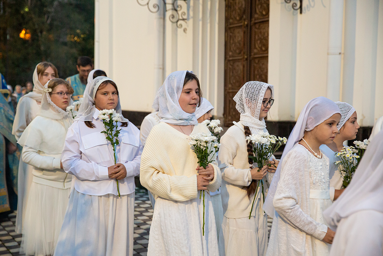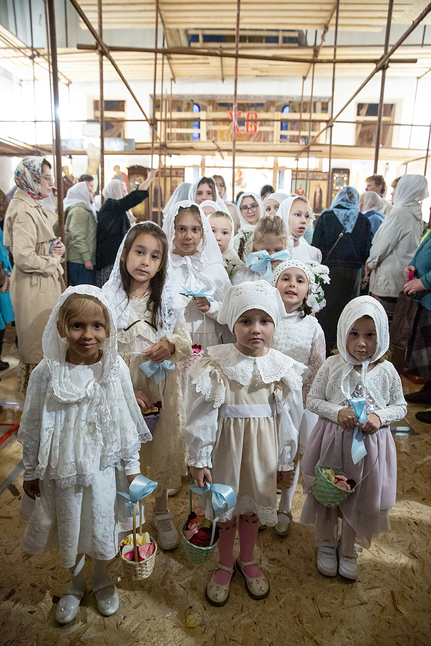 Перед Плащаницей Пресвятой Богородицы в крестном ходе прошли юные прихожанки и воспитанницы воскресной школы, одетые в белые одежды и с цветами в руках. Участие девочек придало торжественность и трогательность крестному ходу.