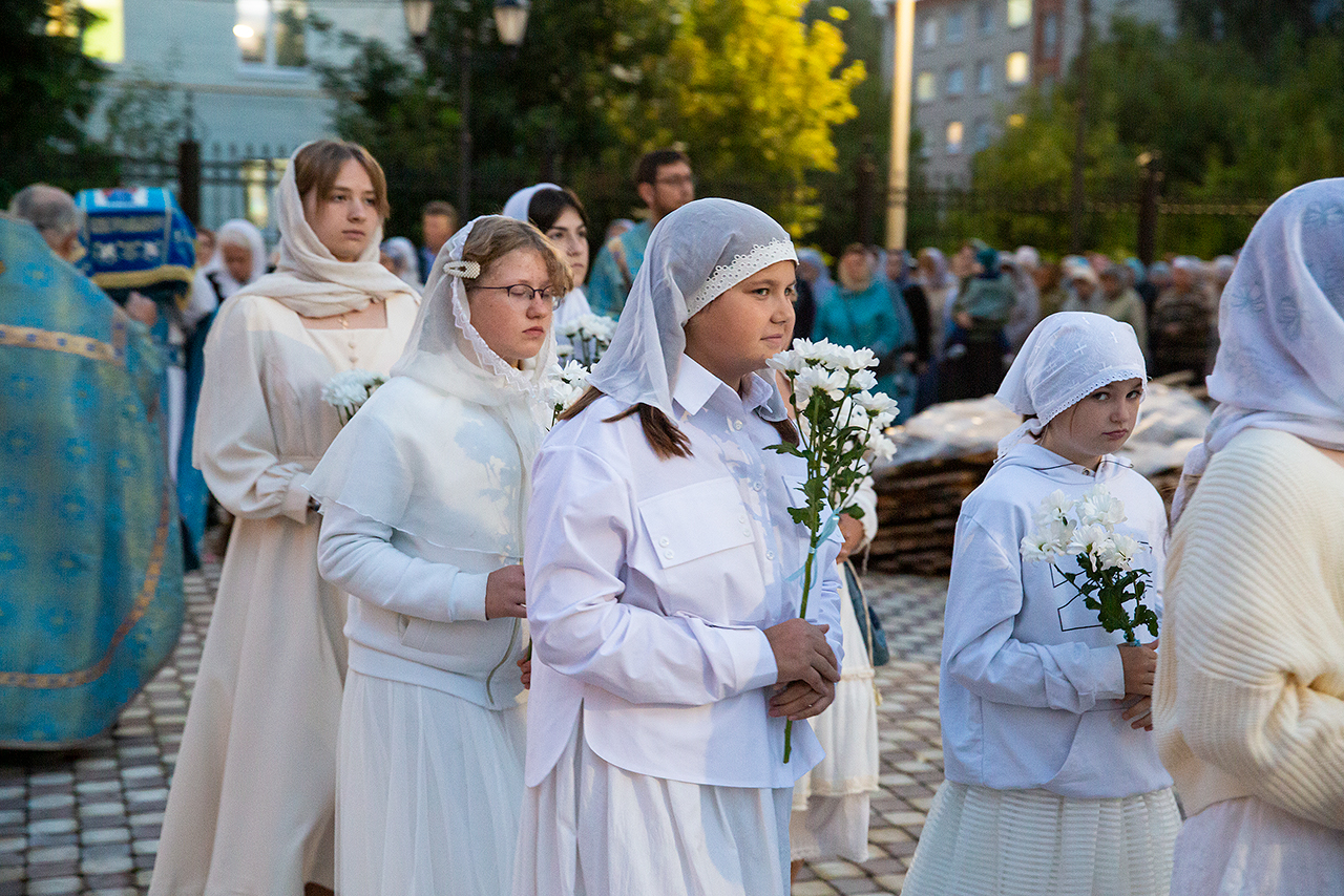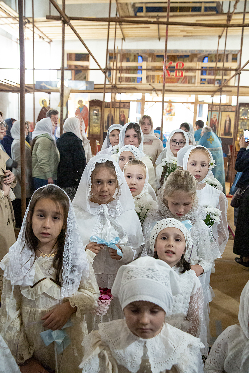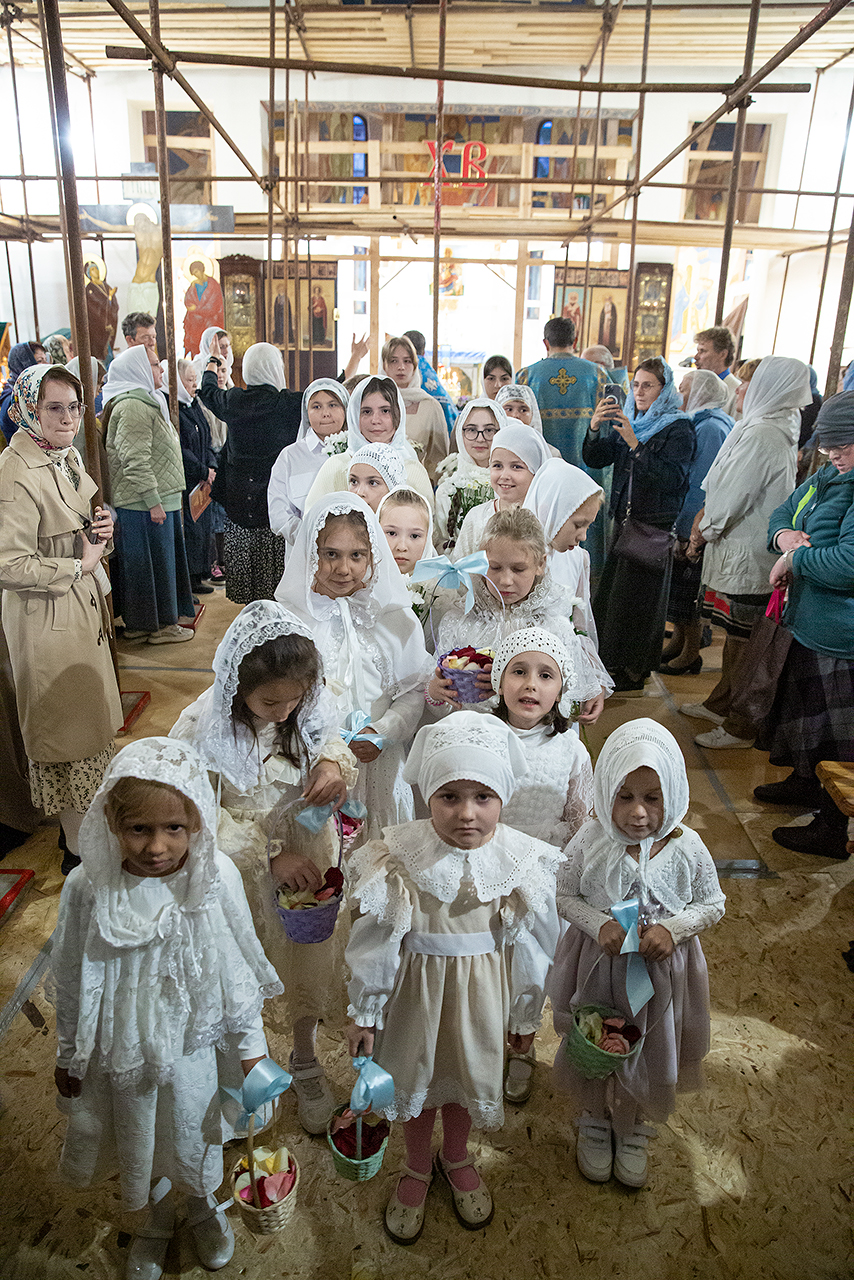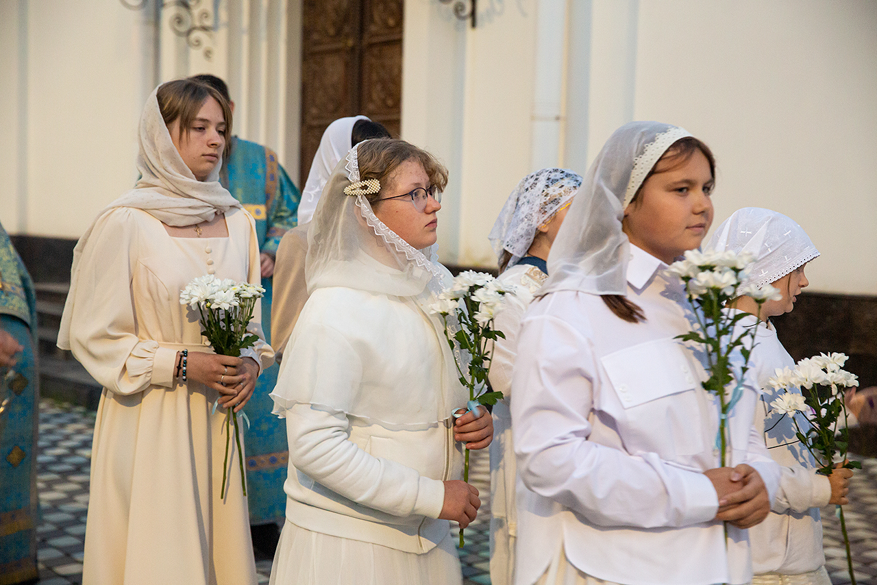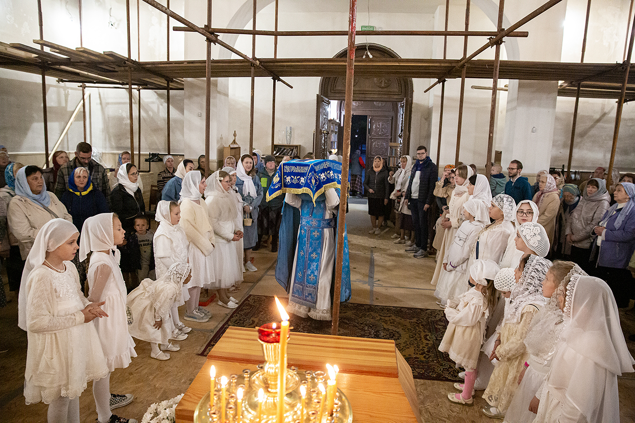 Перед Плащаницей Пресвятой Богородицы в крестном ходе прошли юные прихожанки и воспитанницы воскресной школы, одетые в белые одежды и с цветами в руках. Участие девочек придало торжественность и трогательность крестному ходу.