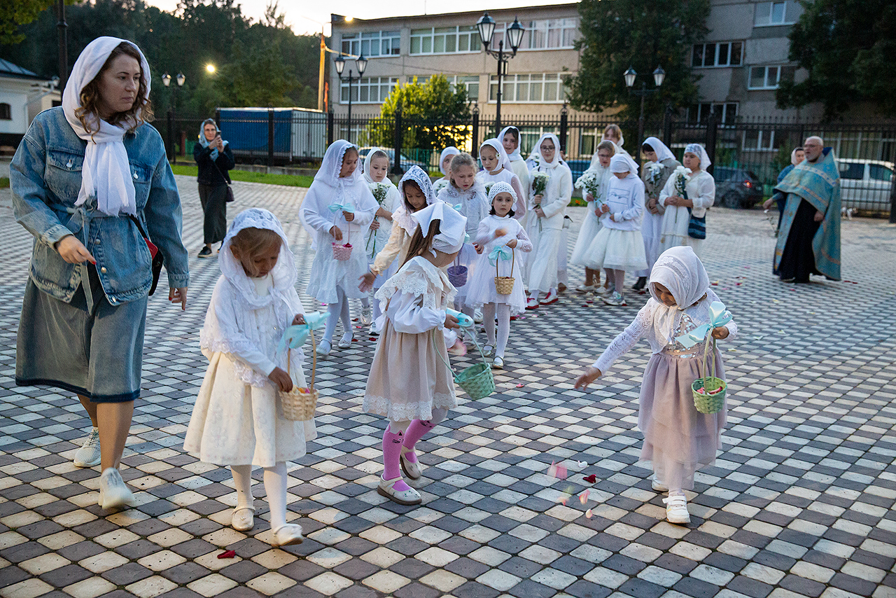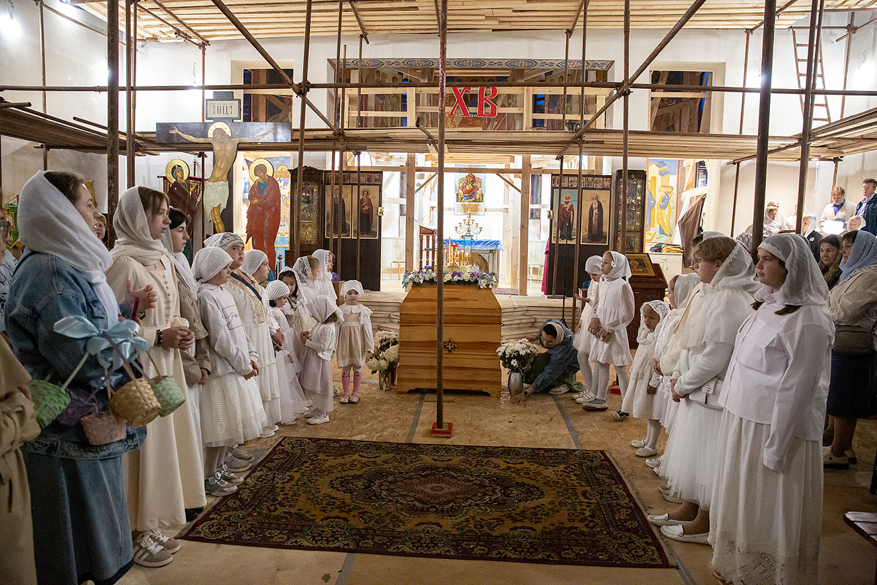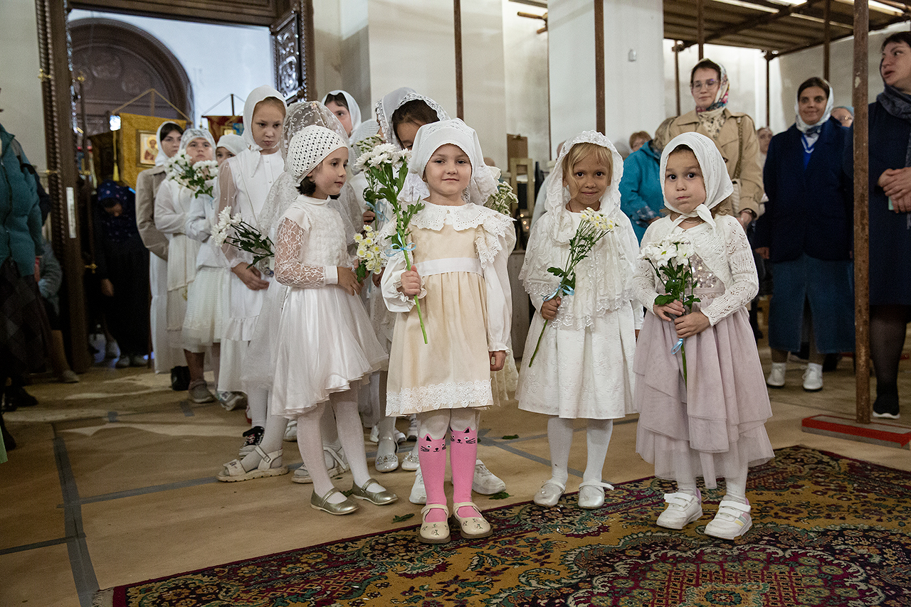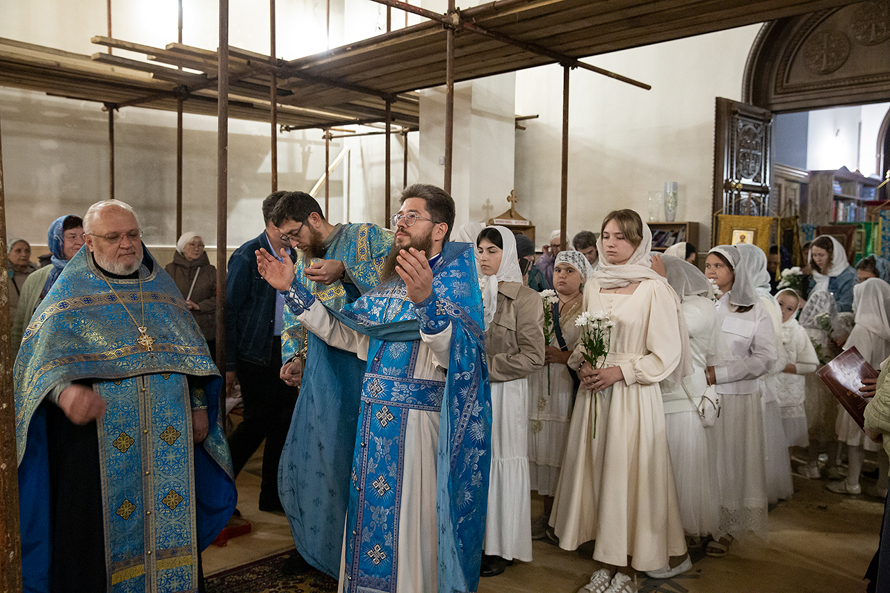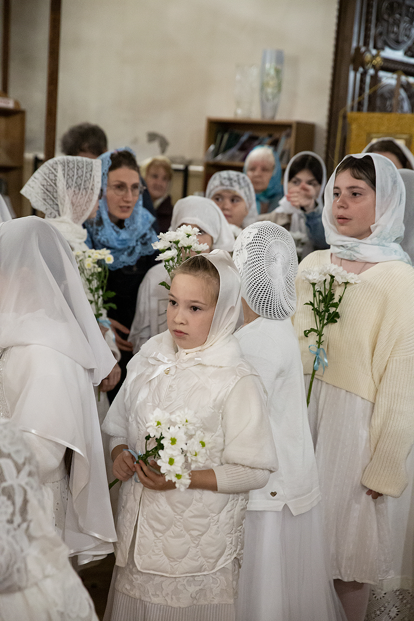 Перед Плащаницей Пресвятой Богородицы в крестном ходе прошли юные прихожанки и воспитанницы воскресной школы, одетые в белые одежды и с цветами в руках. Участие девочек придало торжественность и трогательность крестному ходу.