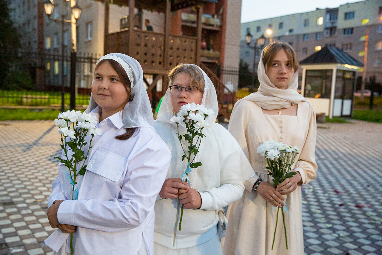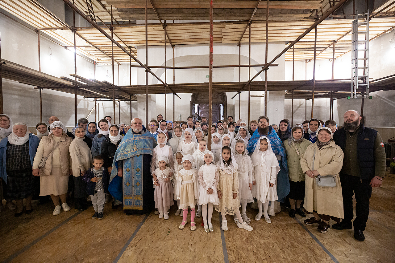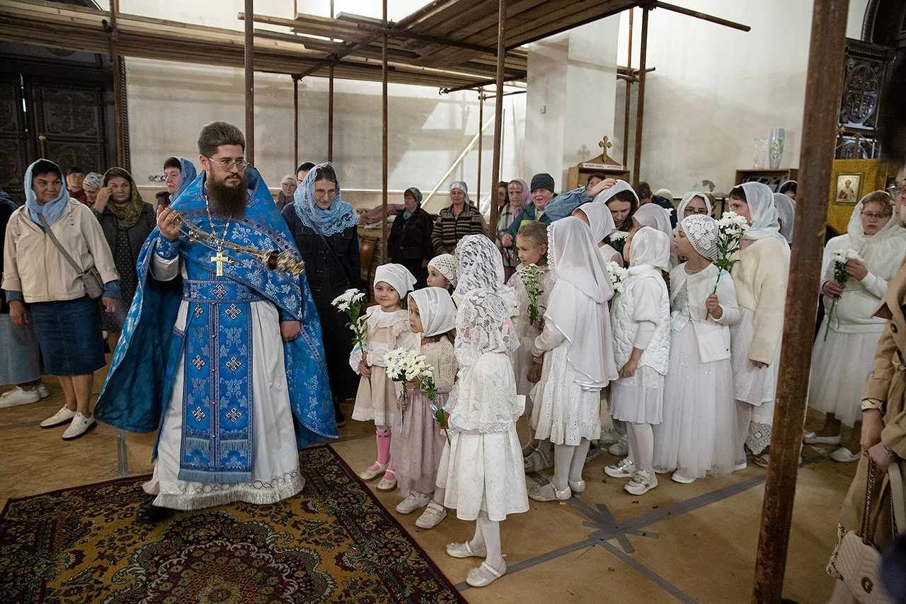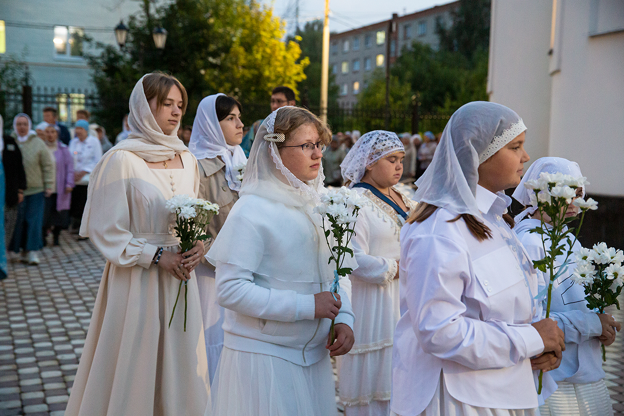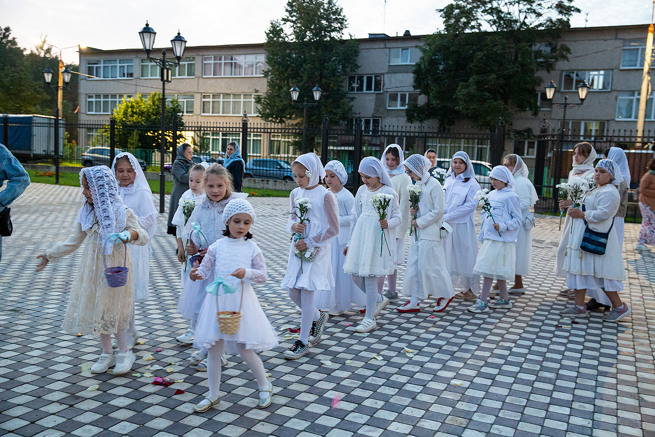 Перед Плащаницей Пресвятой Богородицы в крестном ходе прошли юные прихожанки и воспитанницы воскресной школы, одетые в белые одежды и с цветами в руках. Участие девочек придало торжественность и трогательность крестному ходу.