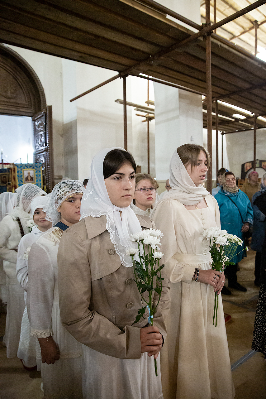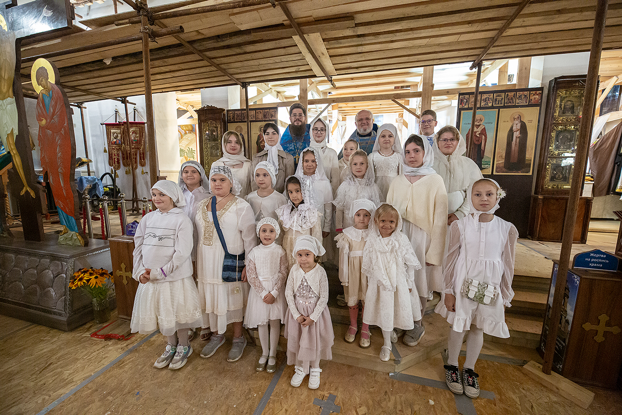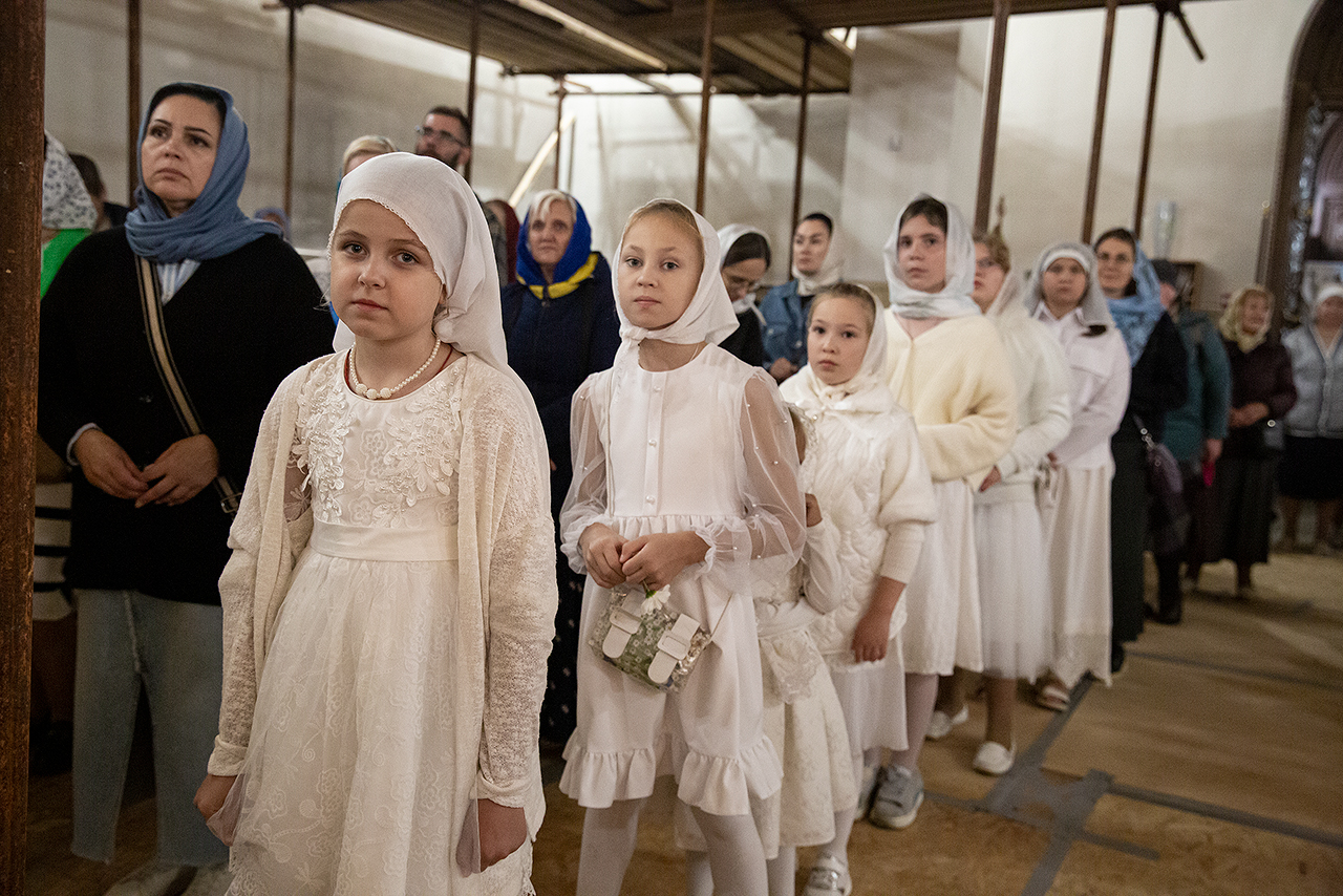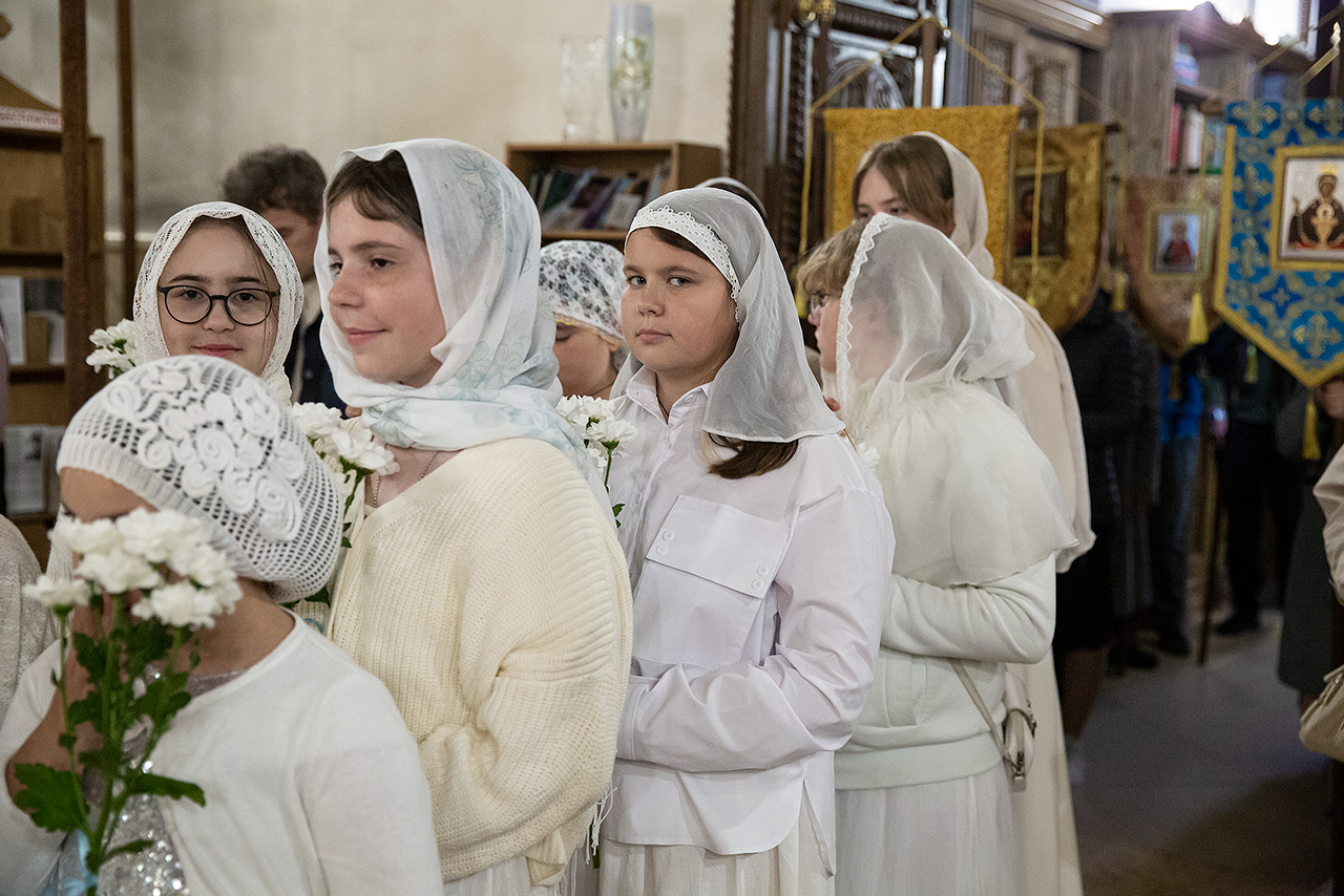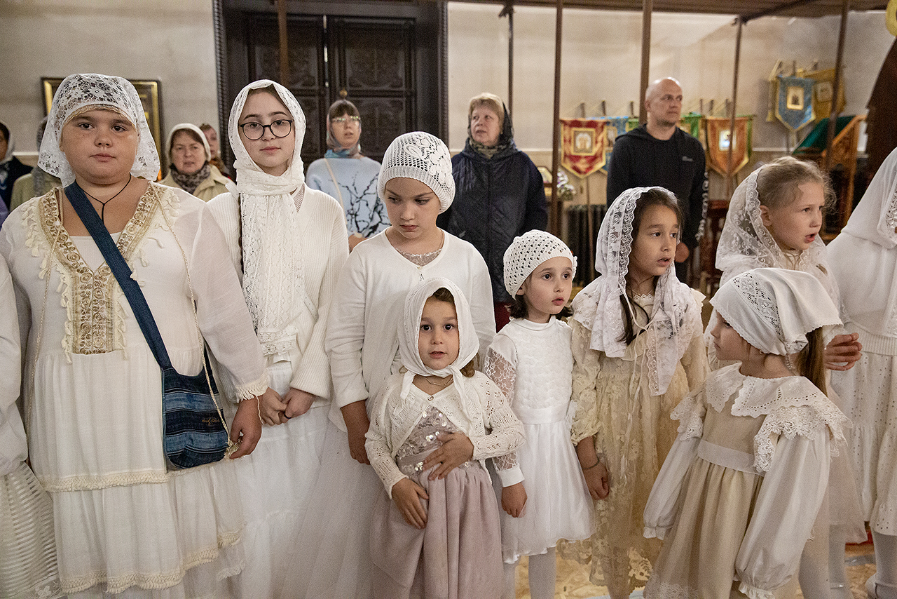 Перед Плащаницей Пресвятой Богородицы в крестном ходе прошли юные прихожанки и воспитанницы воскресной школы, одетые в белые одежды и с цветами в руках. Участие девочек придало торжественность и трогательность крестному ходу.