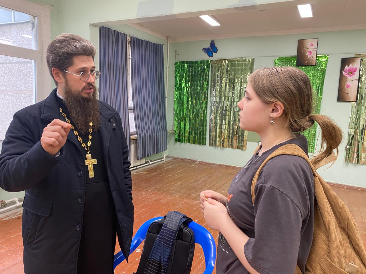 11 ноября, в рамках Московских областных Рождественских образовательных чтений «Просвещение и нравственность: формирование личности и вызовы времени», старшеклассники школы № 5 города Фрязино встретились с настоятелем Державного храма Наукограда священником Димитрием Трятьяковым.