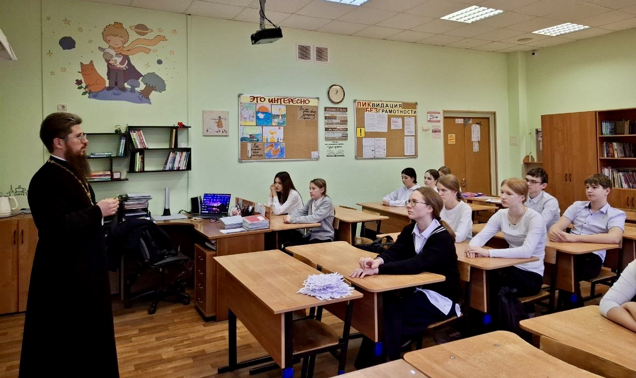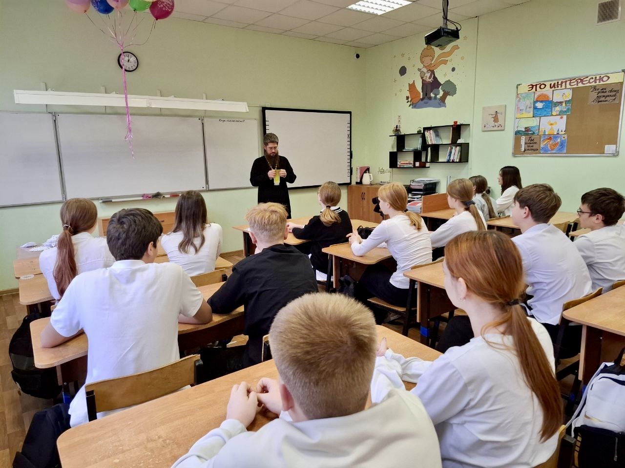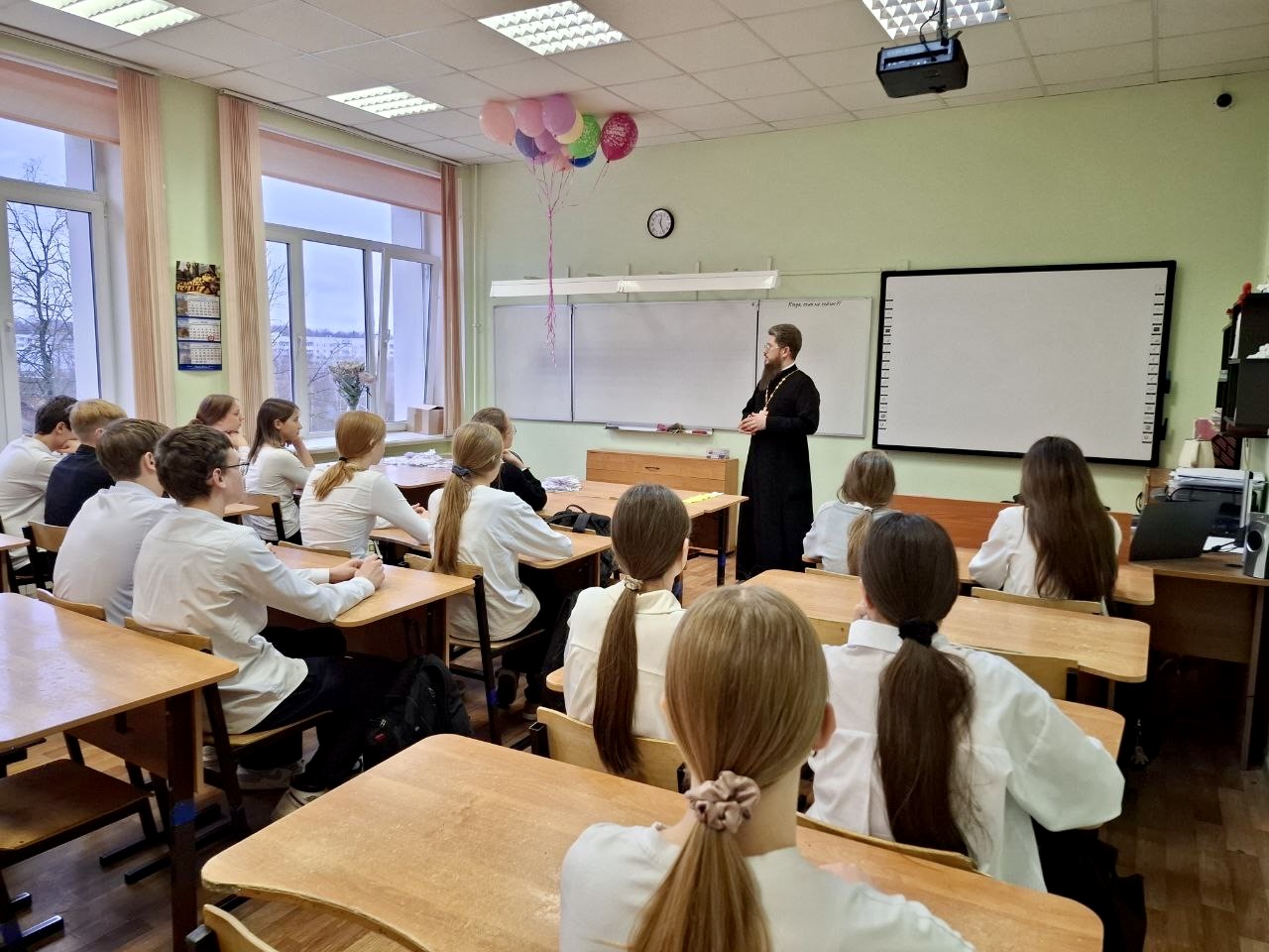 28 ноября, в рамках Рождественских образовательных чтений, в 8б классе школы №3 города Фрязино состоялась встреча «Сто вопросов к батюшке» с настоятелем Державного храма Наукограда священником Димитрием Третьяковым.