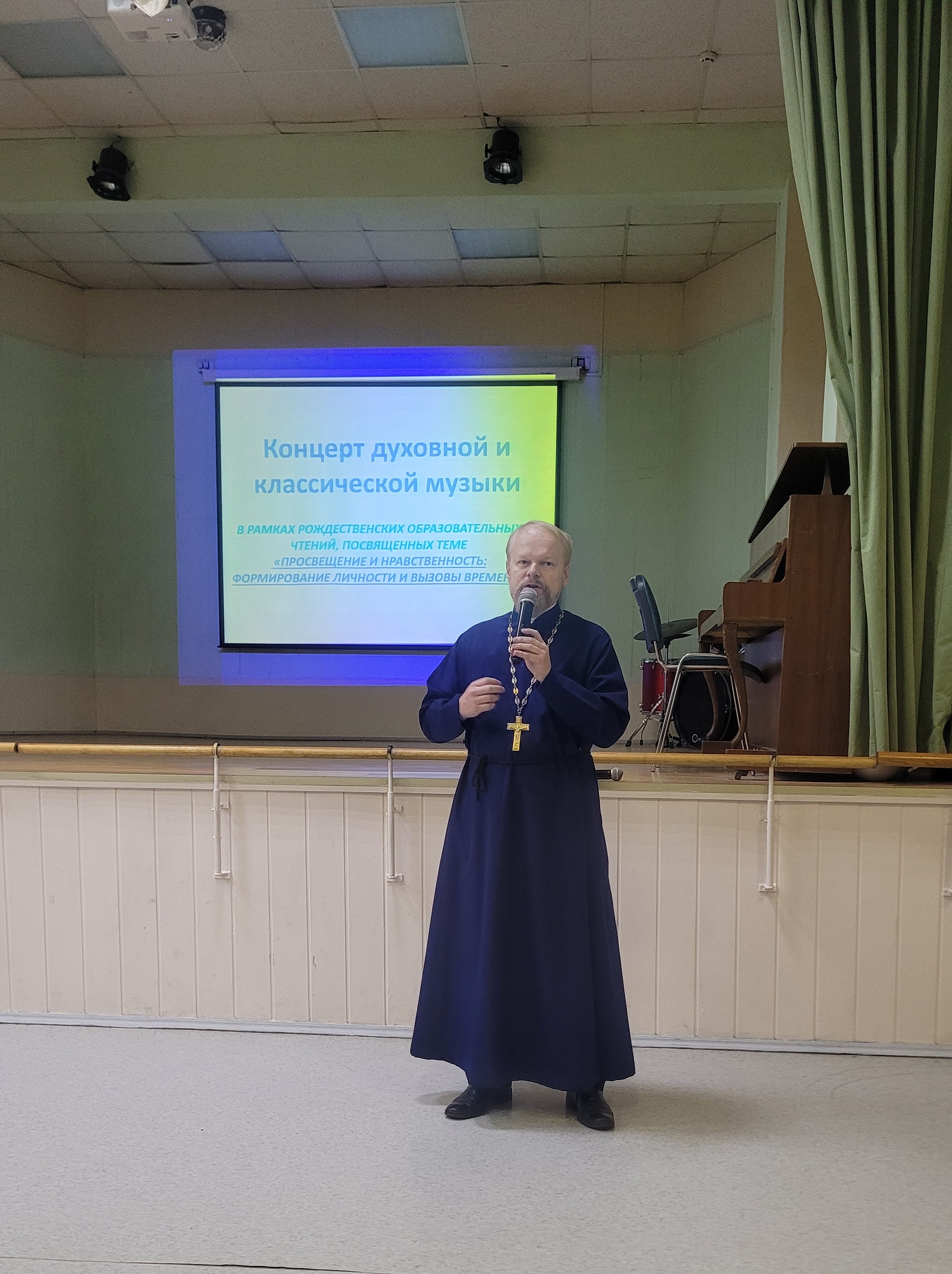 Со словами приветствия к собравшимся обратились директор гимназии Анжела Николаевна Терентьева и клирик Троицкого собора города Щёлково священник Димитрий Медведев, рассказавший о празднике Рождества Христова и исполнивший на фортепиано Адажио из балета «Щелкунчик» П.И.Чайковского.