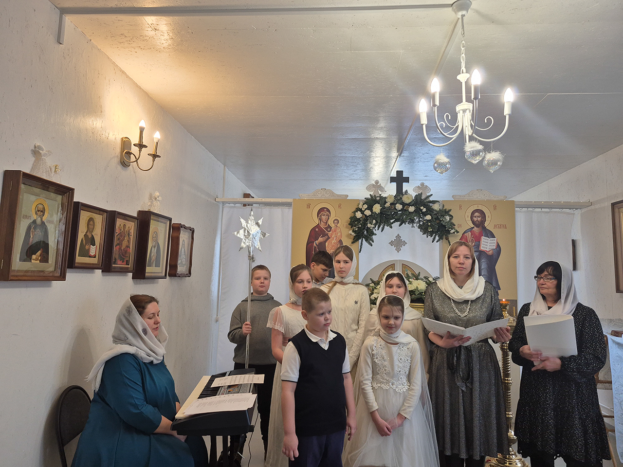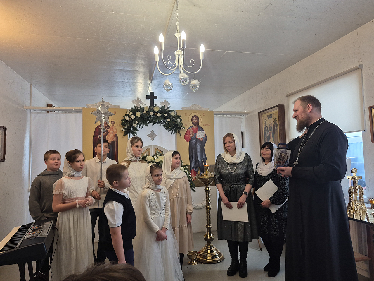 Учащиеся воскресной школы, под руководством учителя пения Ирины Александровны Савельевой, выступили перед прихожанами со стихами и песнями посвящёнными Рождеству Христову! Несколько песнопений также были исполнены хором храма. Праздник получился очень душевным и искренним. Прихожане смогли ощутить настоящую светлую радость рождественских дней, а юные артисты, поделившиеся этой радостью, получили рождественские подарки!