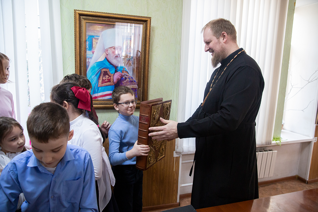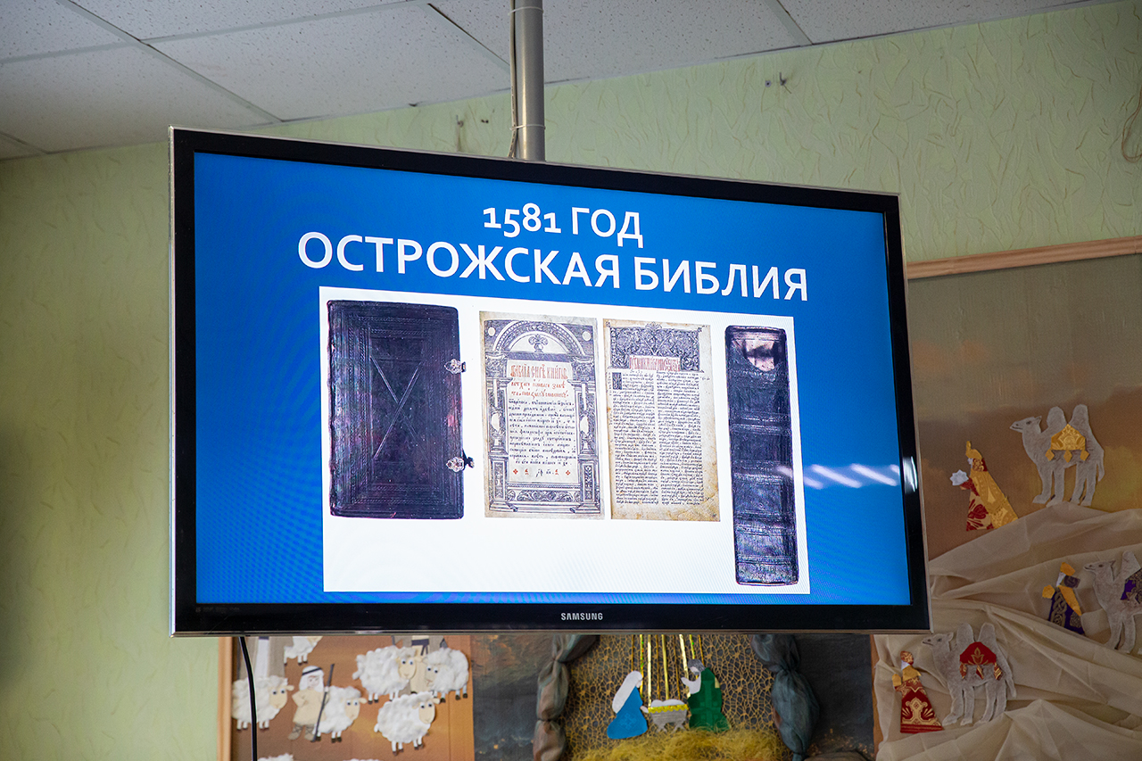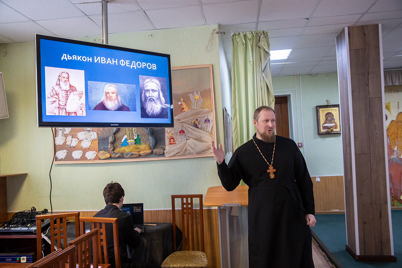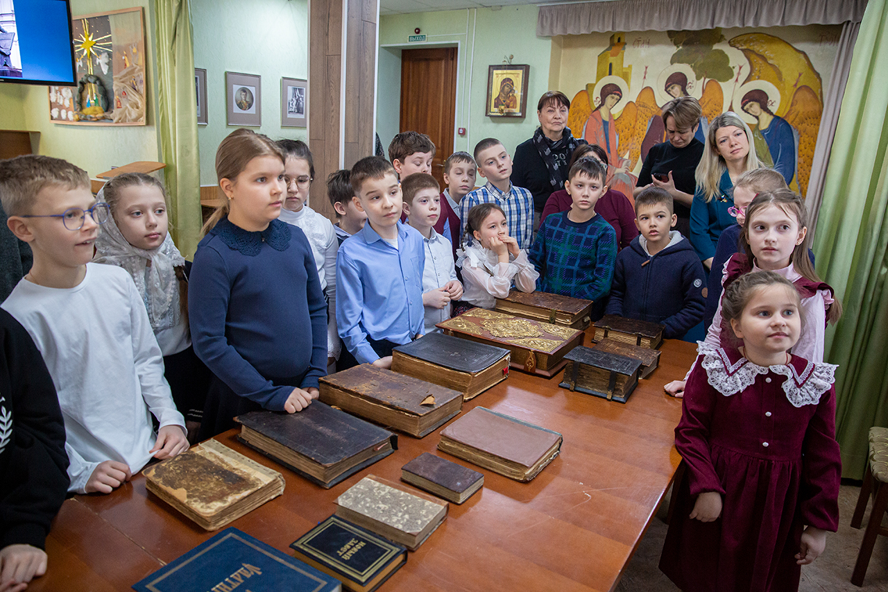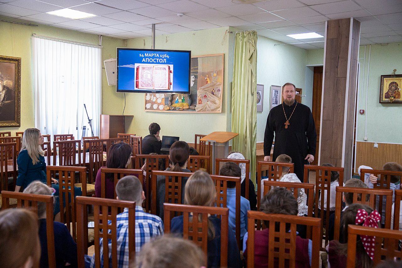Духовник гимназии, священник Павел Чекалин, рассказал ребятам об истории книгопечатания, жизни и трудах дьякона Ивана Федорова. Затем миссионер и старший алтарник Троицкого собора, член союза писателей России, Валерий Полянкин, в стиле древнерусских былин под аккомпанемент гуслей, рассказал собравшимся об издании Острожской Библии. А завершилось занятие знакомством гимназистов с современными и древними изданиями церковных книг. Конечно, особый интерес и радость ребят вызвали богослужебные книги XVIII-XIX веков.