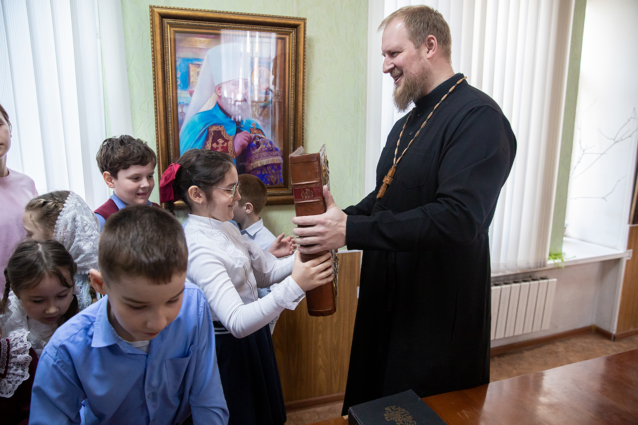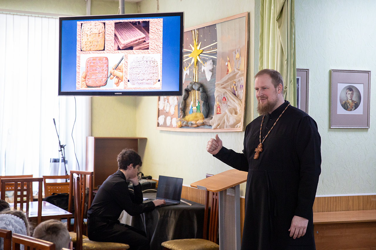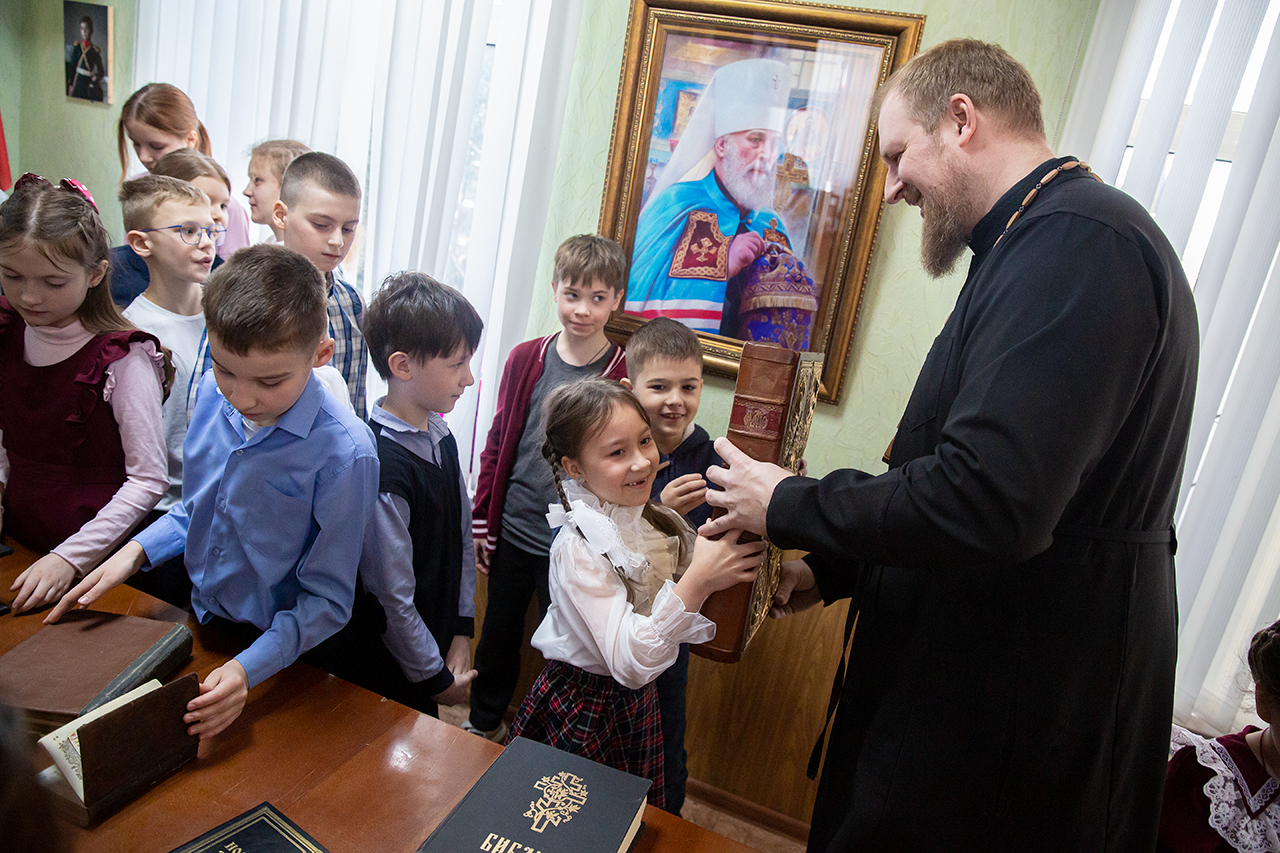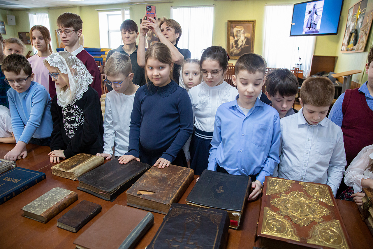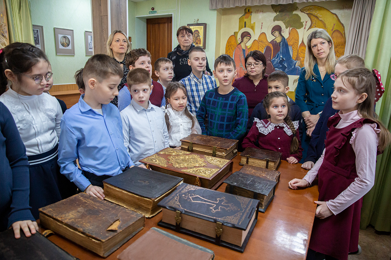 Духовник гимназии, священник Павел Чекалин, рассказал ребятам об истории книгопечатания, жизни и трудах дьякона Ивана Федорова. Затем миссионер и старший алтарник Троицкого собора, член союза писателей России, Валерий Полянкин, в стиле древнерусских былин под аккомпанемент гуслей, рассказал собравшимся об издании Острожской Библии. А завершилось занятие знакомством гимназистов с современными и древними изданиями церковных книг. Конечно, особый интерес и радость ребят вызвали богослужебные книги XVIII-XIX веков.
