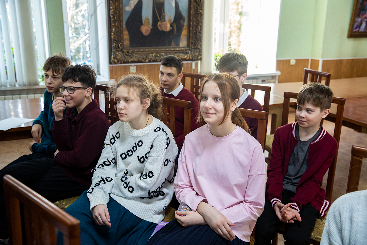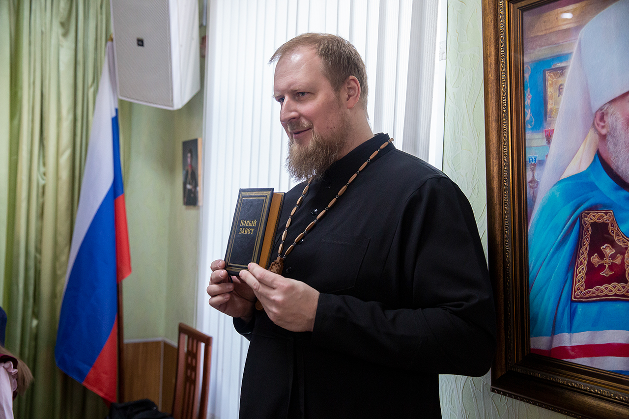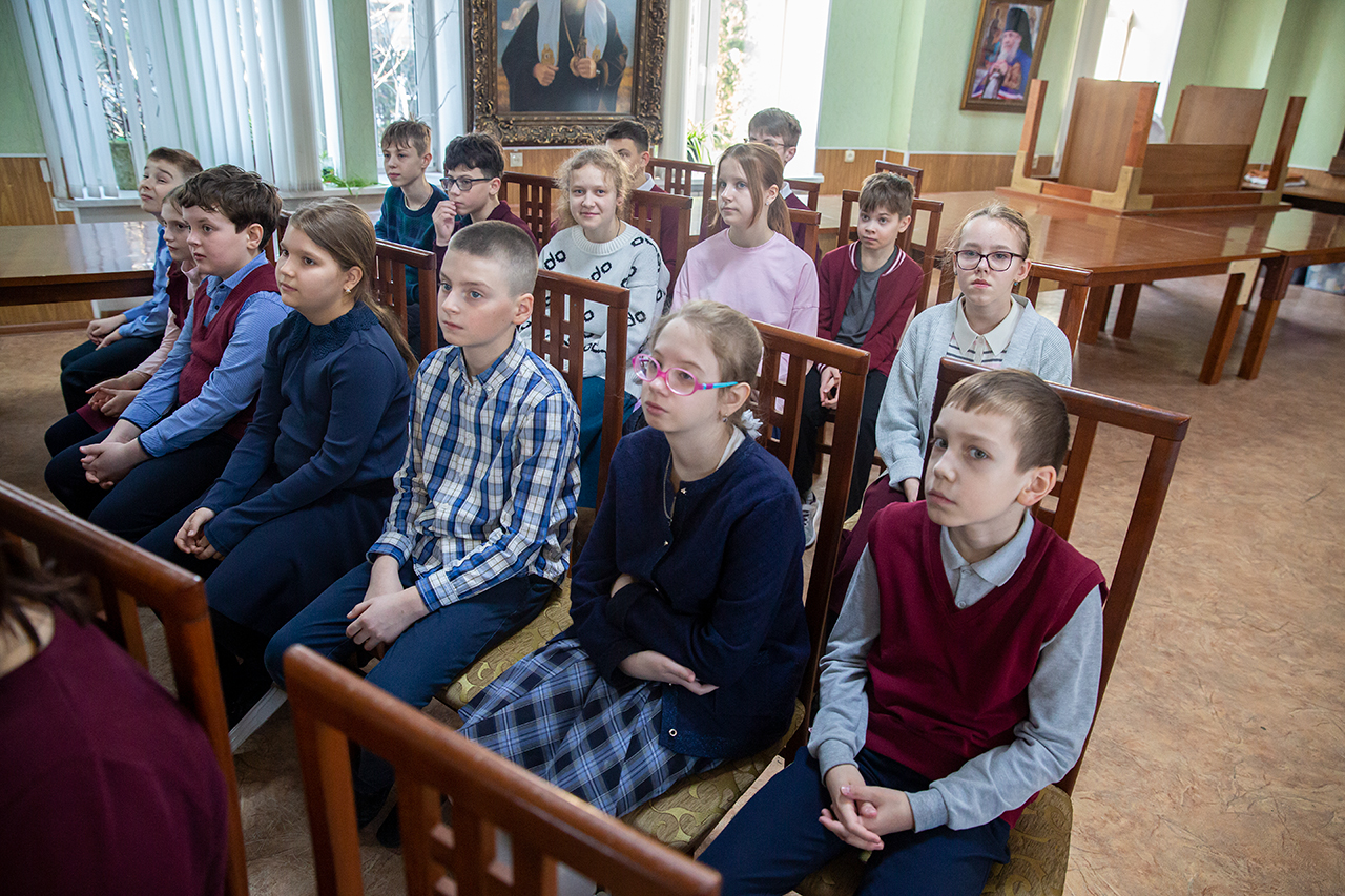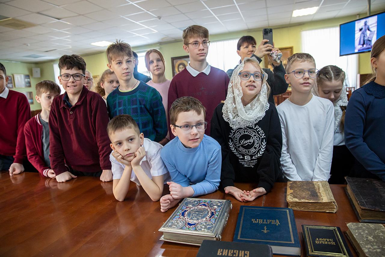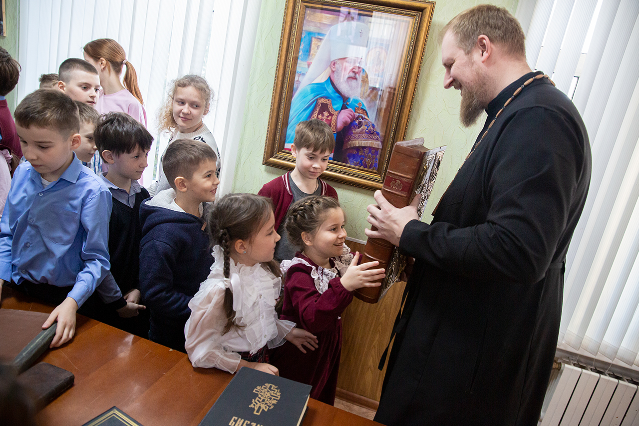 Духовник гимназии, священник Павел Чекалин, рассказал ребятам об истории книгопечатания, жизни и трудах дьякона Ивана Федорова. Затем миссионер и старший алтарник Троицкого собора, член союза писателей России, Валерий Полянкин, в стиле древнерусских былин под аккомпанемент гуслей, рассказал собравшимся об издании Острожской Библии. А завершилось занятие знакомством гимназистов с современными и древними изданиями церковных книг. Конечно, особый интерес и радость ребят вызвали богослужебные книги XVIII-XIX веков.