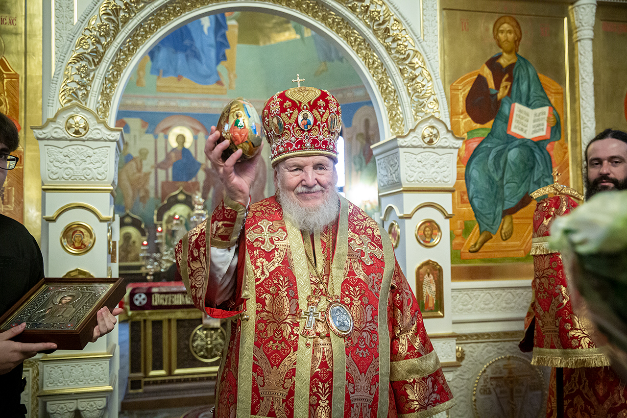 По окончании Литургии было совершено праздничное славление, после чего благочинный отец Андрей поблагодарил Владыку за визит и совместную молитву, и на память о богослужении преподнёс икону Спасителя и пасхальное яйцо.