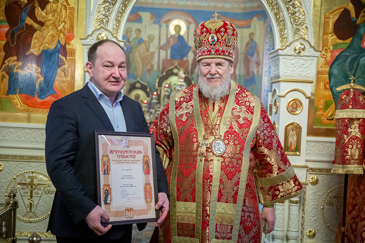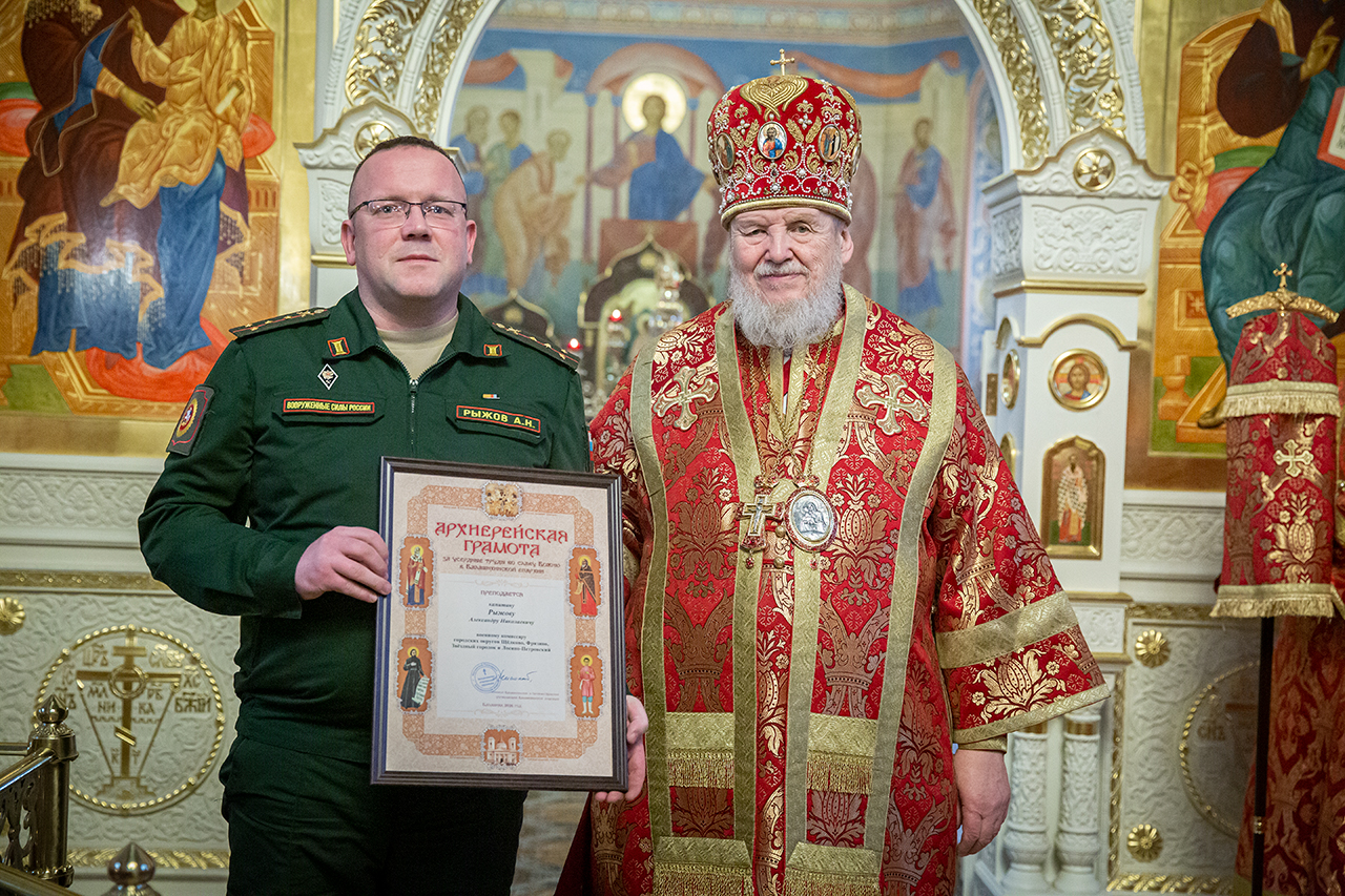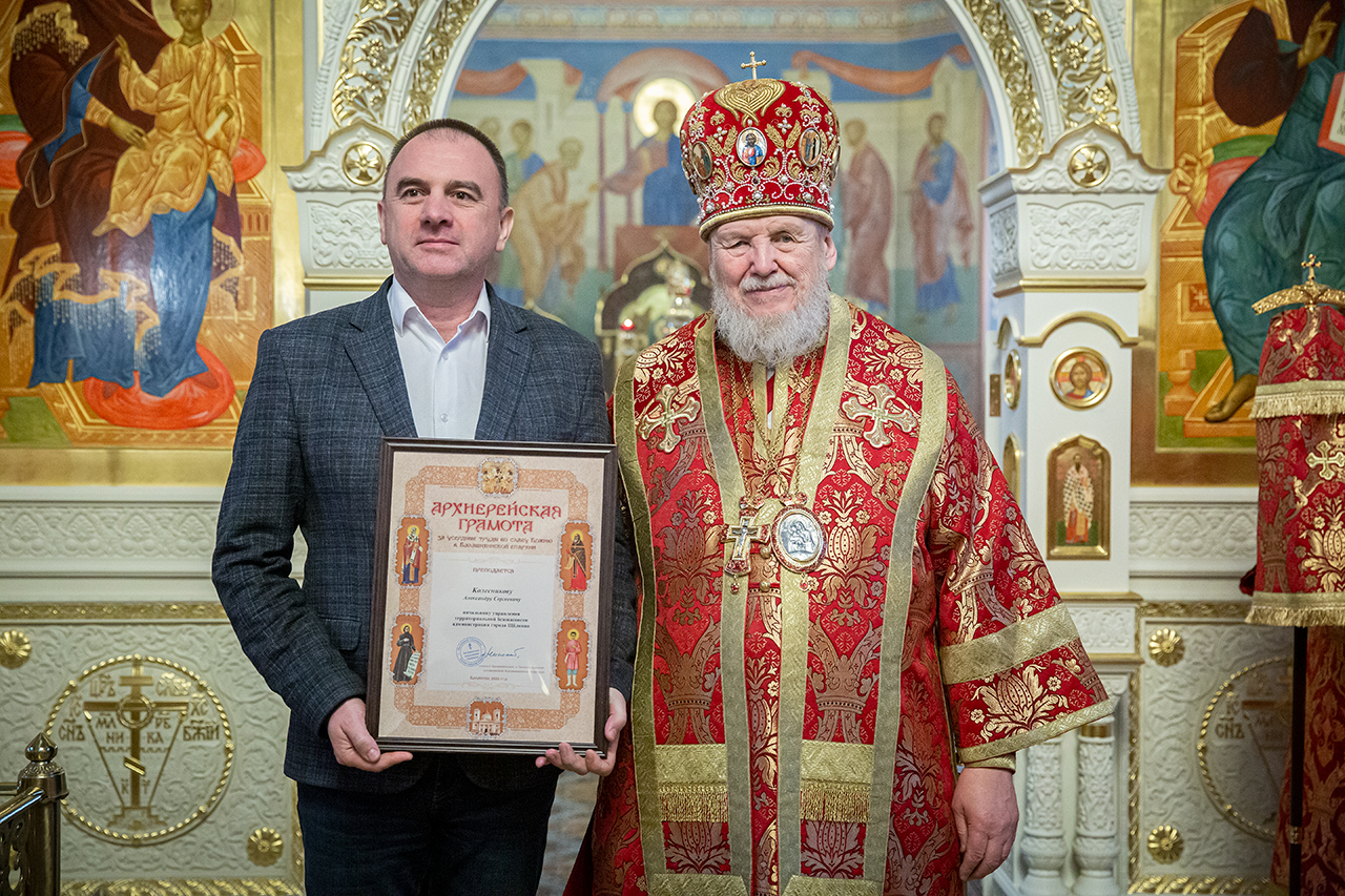 Затем Его Преосвященство обратился к духовенству и молящимся с архипастырским словом и вручил грамоты Балашихинской епархии начальнику управления территориальной безопасности Администрации города Щёлково Александру Сергеевичу Колесникову, советнику Главы городского округа Щёлково по вопросам безопасности и противодействию коррупции Андрею Геннадьевичу Сальникову и военному комиссару городских округов Щёлково, Фрязино, Звёздный городок и Лосино-Петровский, капитану Александру Николаевичу Рыжову.