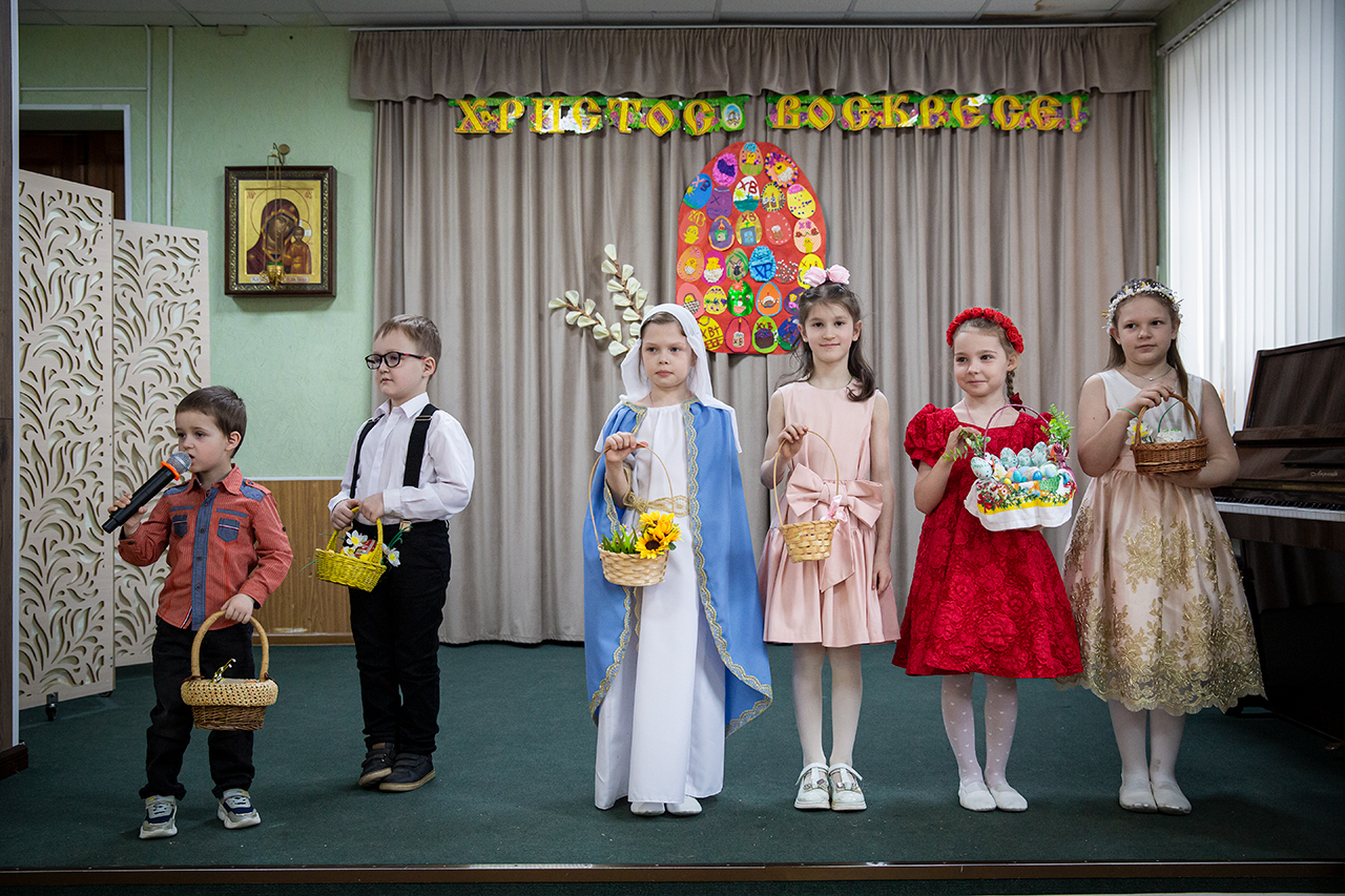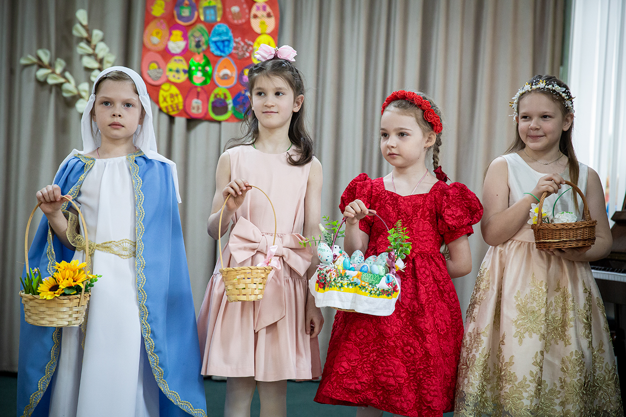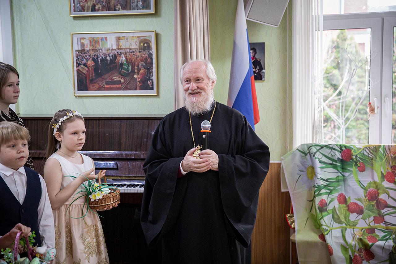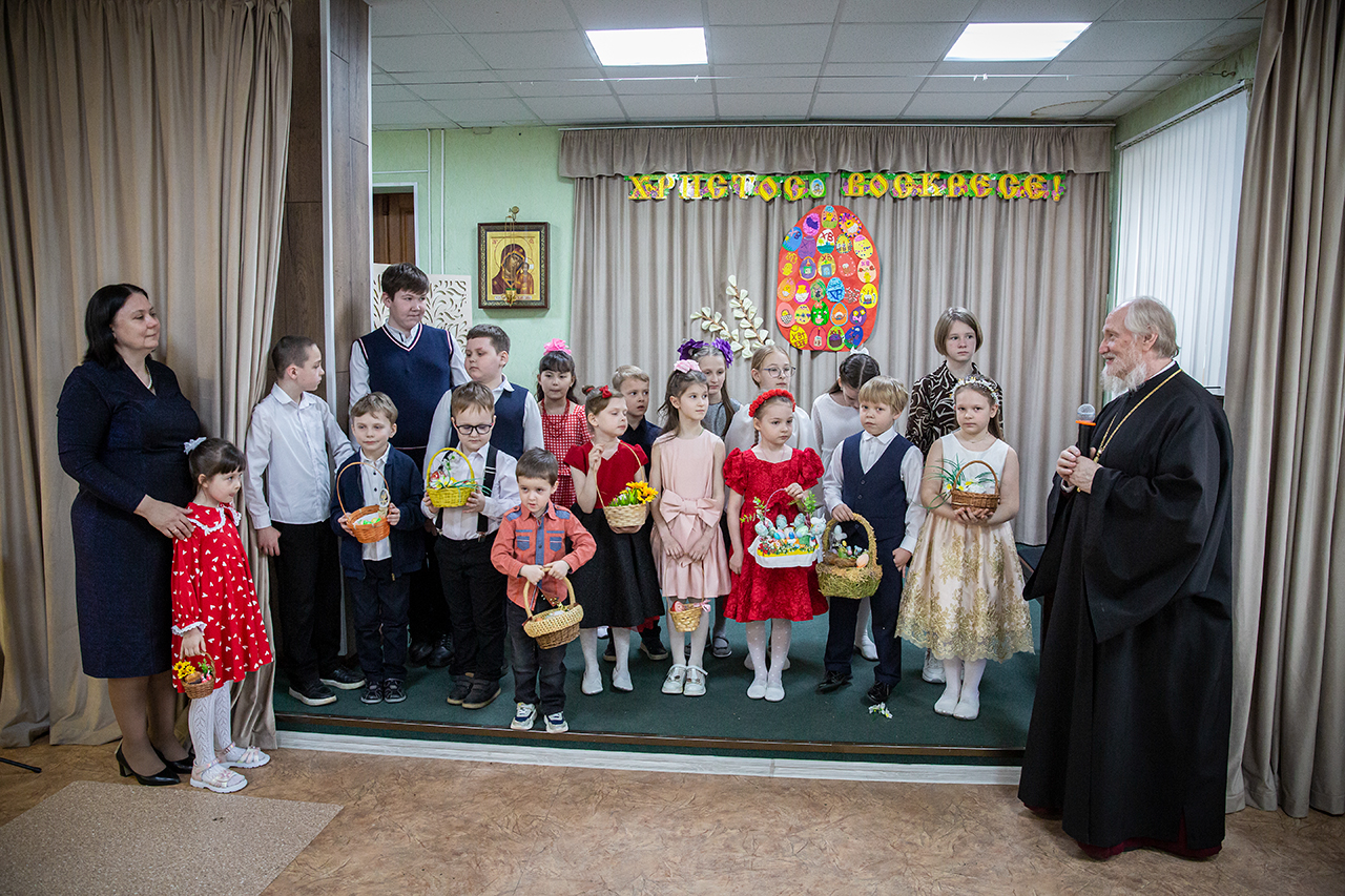 После участия детей в Божественной Литургии, на которой ребята старшей группы пели в составе клиросного хора, в конференц-зале состоялся праздничный концерт. Программа выступлений включала сценки «Встреча Марии Магдалины с императором Тиберием», «Ключи от рая», исполнение «Вальса цветов», песен, чтение стихов.