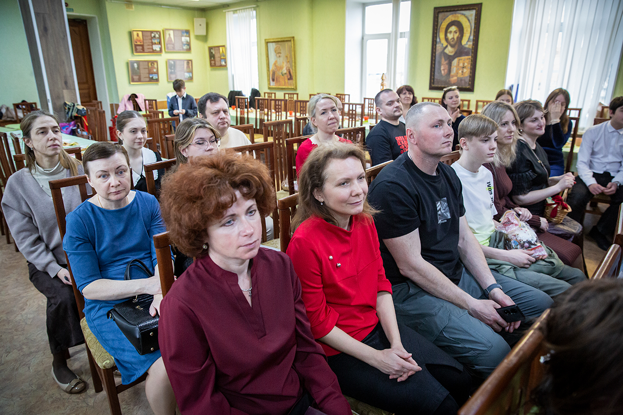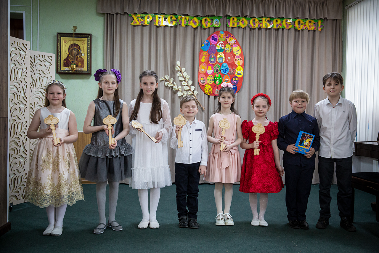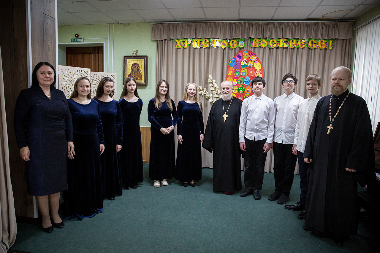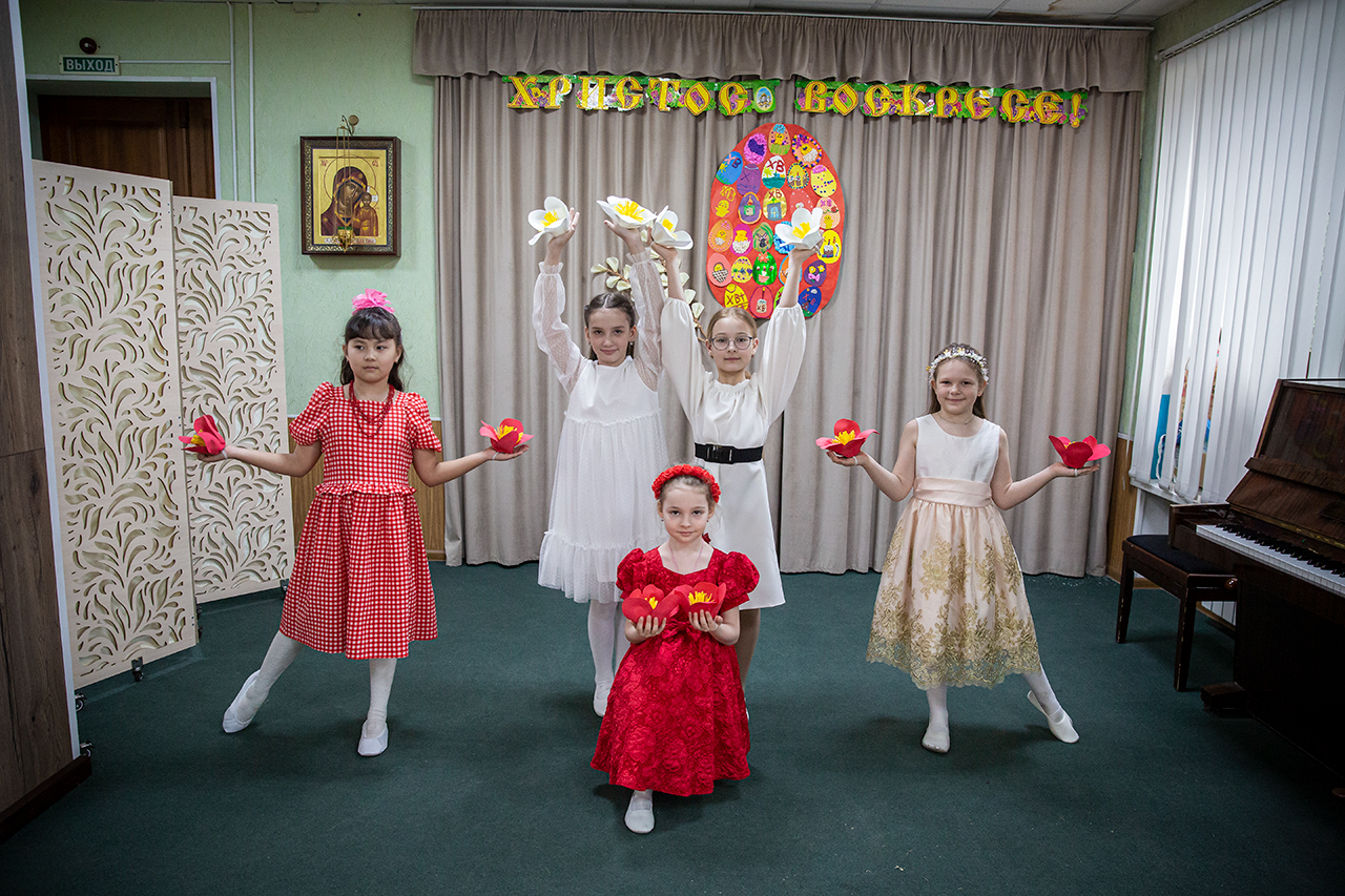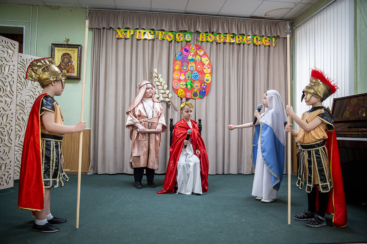 После участия детей в Божественной Литургии, на которой ребята старшей группы пели в составе клиросного хора, в конференц-зале состоялся праздничный концерт. Программа выступлений включала сценки «Встреча Марии Магдалины с императором Тиберием», «Ключи от рая», исполнение «Вальса цветов», песен, чтение стихов.