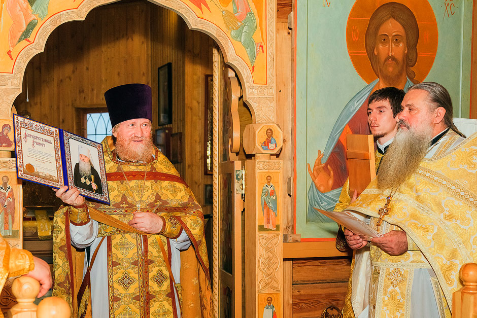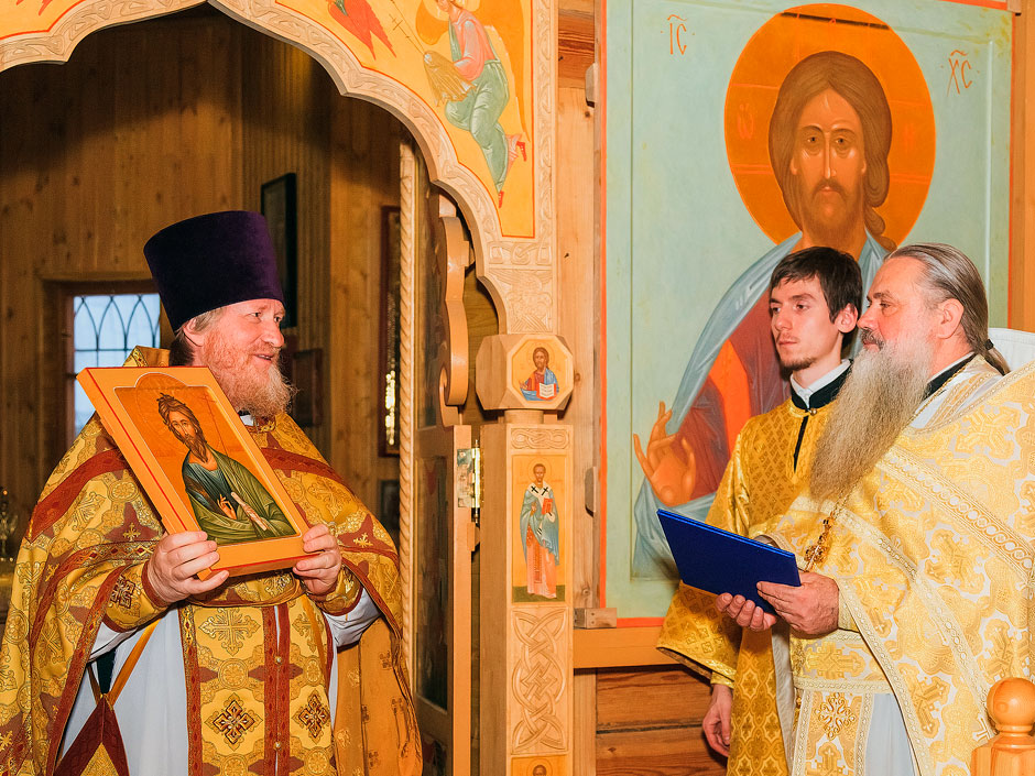За многолетнее жертвенное служение Матери Церкви прот. Андрей Ковальчук вручил прот. Виктору Догадаеву Благодарственную грамоту Правящего Архиерея Московской епархии митрополита Крутицкого и Коломенского Ювеналия, а также икону апостола Андрея Первозванного.