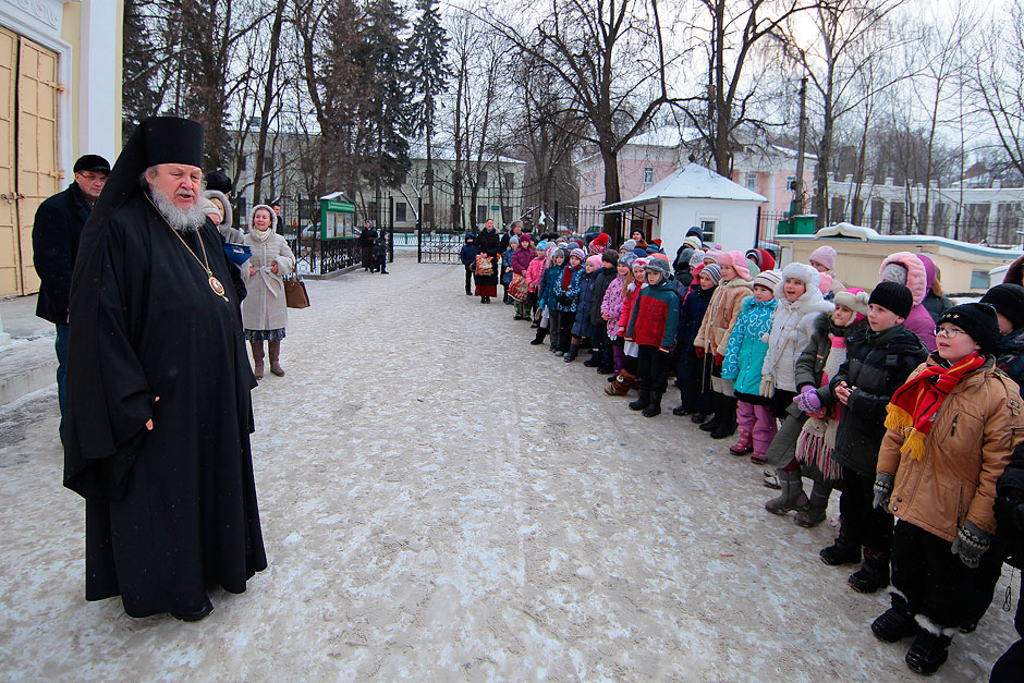 После литургии на улице перед храмом ребята дружно общались и фотографировались. Владыка Николай благословлял детей и шутливо расспрашивал их про учебу.