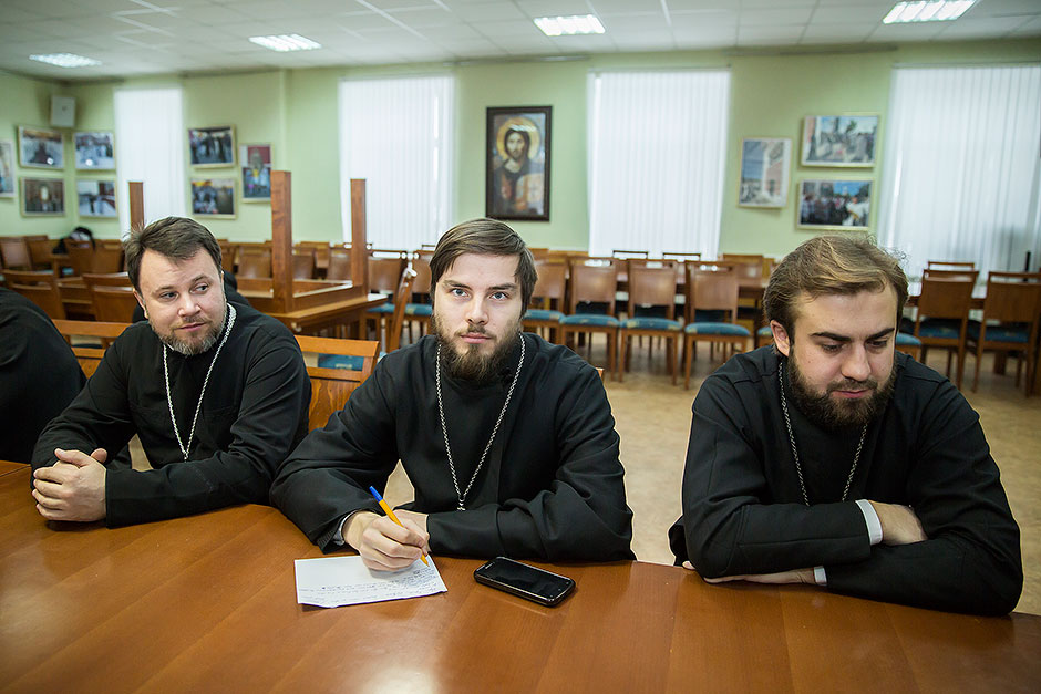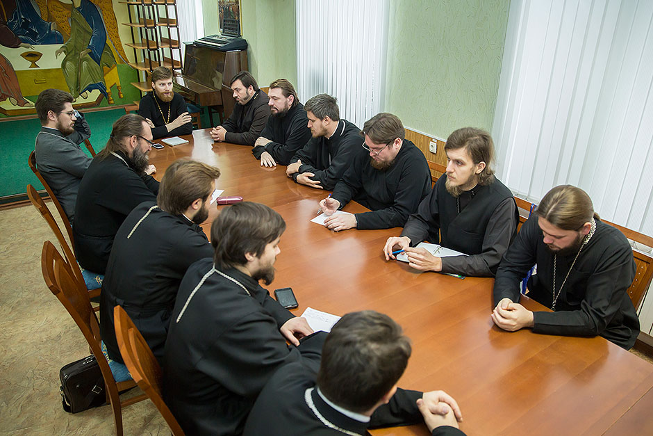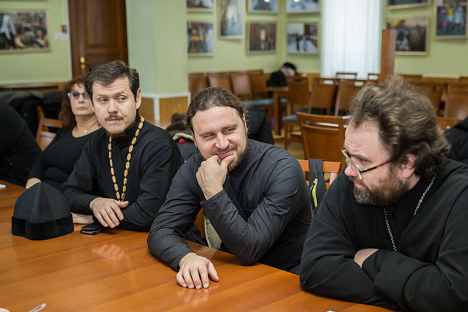 Своим опытом работы со школьниками поделились настоятель храма блж. Ксении Петербургской д. Медвежьи Озера священник Сергий Ковальчук и настоятель Державного храма г. Фрязино священник Димитрий Поповский. Духовенству и педагогам духовно-нравственных дисциплин были даны рекомендации и обсуждена методика подобных бесед, а также порядок окормления близлежащих учебных учреждений.