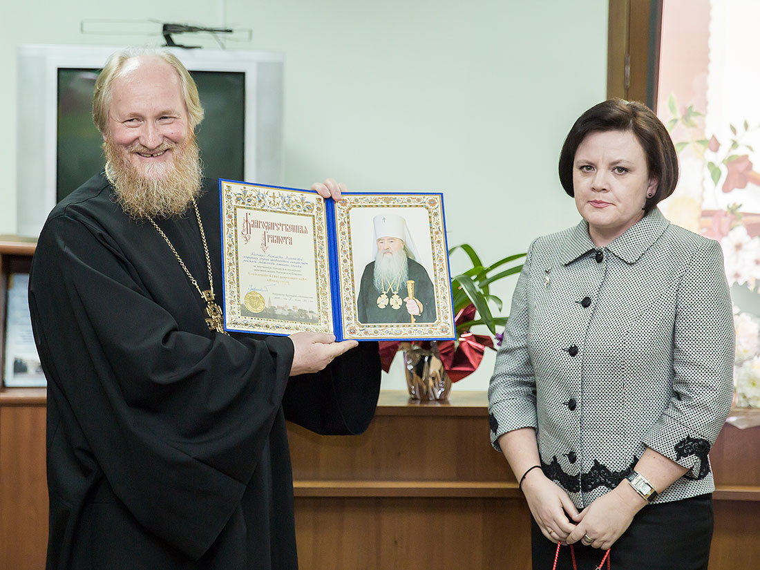 Юбилейный вечер получился теплым и домашним, отец Андрей поблагодарил сотрудников библиотеки за многолетний усердный труд и преподнес заведующей сектором духовной литературы Т.В. Воронковой Благодарственную грамоту митрополита Крутицкого и Коломенского Ювеналия.