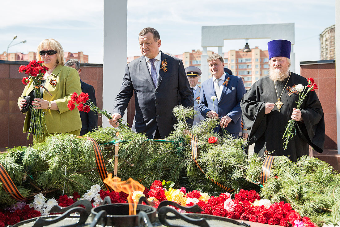 После богослужения священнослужители Щелковского благочиния приняли участие в торжественных митингах у Мемориалов погибшим воинам. Благочинный церквей Щелковского округа возложил цветы к Вечному огню на Аллее Памяти и участвовал в районном празднование Дня Победы. Со словами приветствия и поздравления к ветеранам и всем собравшимся обратилась Глава Щелковского муниципального района Н.В. Суровцева: «Дорогие щелковчане! 70 лет Победы, семидесятую весну встречает наш народ. И сегодня мы собираемся для того, чтобы сказать спасибо участникам Великой Отечественной войны за то, что сегодня мы можем жить – надеяться – верить. В этот день мы благодарим и тружеников тыла, помогавших приблизить этот радостный день. В каждом городе, в каждом селе есть частичка нашего сердца – Вечный огонь, Обелиск павшим солдатам, и мы приходим туда, чтобы помнить, чтобы жить, чтобы быть достойными наших героических отцов и дедов».