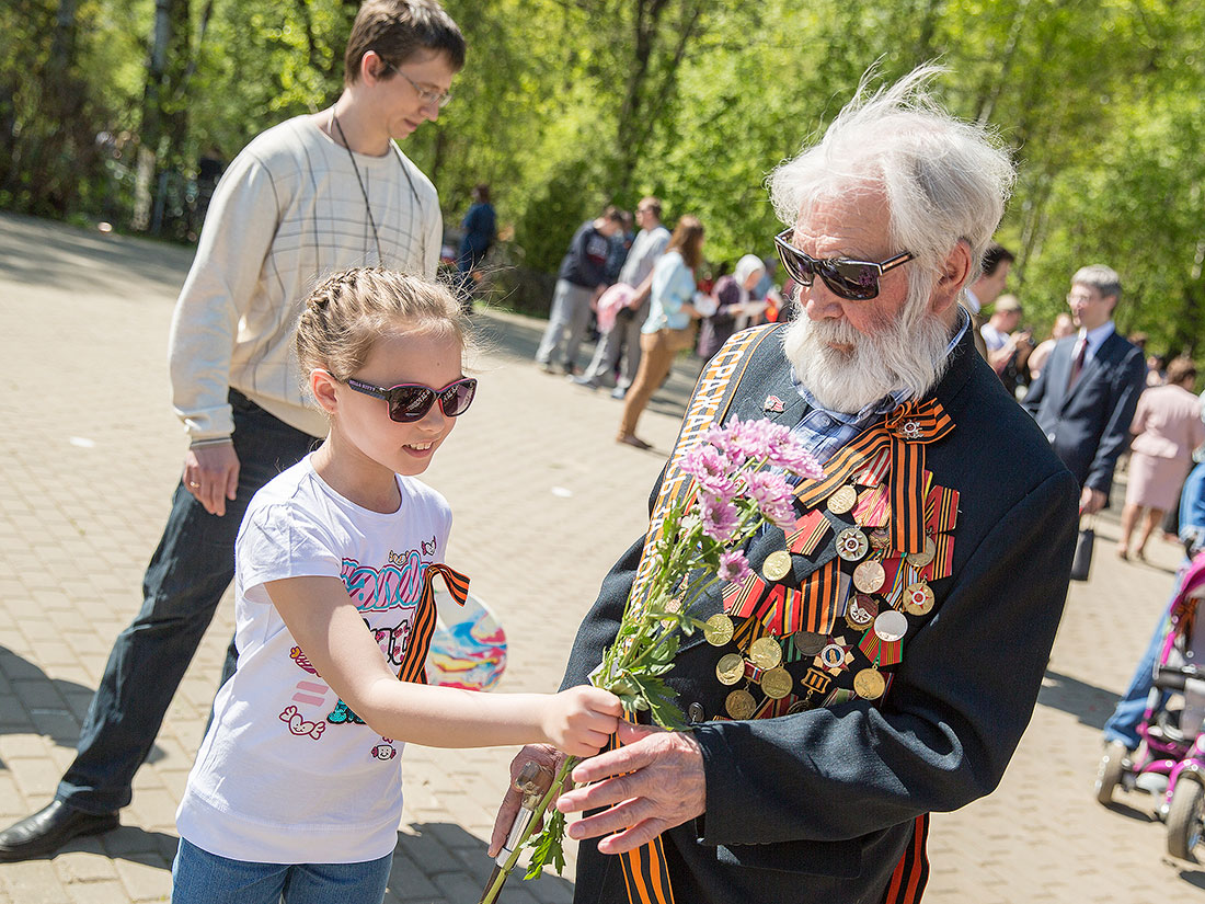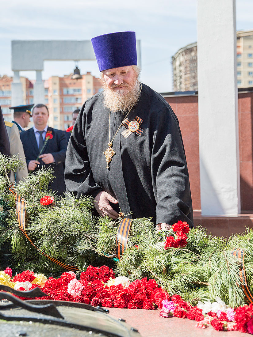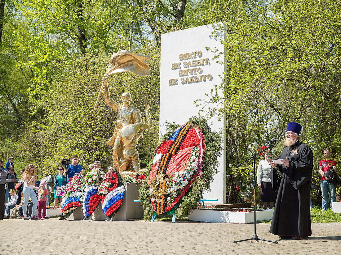 Вслед за Главой района выступил летчик-фронтовик, генерал-майор авиации Виктор Николаевич Свинцов. Ветеранов поздравляло молодое поколение – юноши и девушки читали стихи и говорили слова благодарности. Память всех не вернувшихся с войны почтили минутой молчания, к Вечному огню были возложены гирлянды и корзины цветов, парадным строем прошли военнослужащие. Далее представители Администрации Щелковского муниципального района, общественных организаций и предприятий района, духовенство Щелковского благочиния приняли участие в мероприятиях у Мемориала на Гребенской горе. Благочинный церквей Щелковского округа протоиерей Андрей Ковальчук поздравил горожан с всенародным праздником: «Дорогие ветераны, дорогие щелковчане! Глава государства Иосиф Сталин обратился к народу 3 июля 1941 года с посланием. «Товарищи! Граждане!» - начал он свою речь. И вдруг прозвучало совсем неофициальное, христианское обращение - «братья и сестры». «Товарищи! Граждане! Братья и сестры! Бойцы нашей армии и флота! К вам обращаюсь я, друзья мои!» Русская Православная Церковь встретила Великую Отечественную войну в очень тяжелых условиях. К 1939 году во всей России осталось лишь около ста соборных и приходских храмов, почти все священноначалие находилось в ссылках и лагерях.