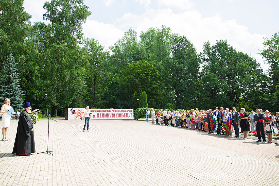 С зажженными свечами щелковчане прошли по предрассветному городу к Мемориалу памяти на Пролетарском проспекте, где к Вечному огню возложили цветы и гирлянды. Клирик Серафимо-Саровского храма г. Щелково священник Виталий Крикота отслужил заупокойную литию. Затем с театрализованной постановкой выступили артисты Щелковского драматического театра под руководством Светланы Погодиной.