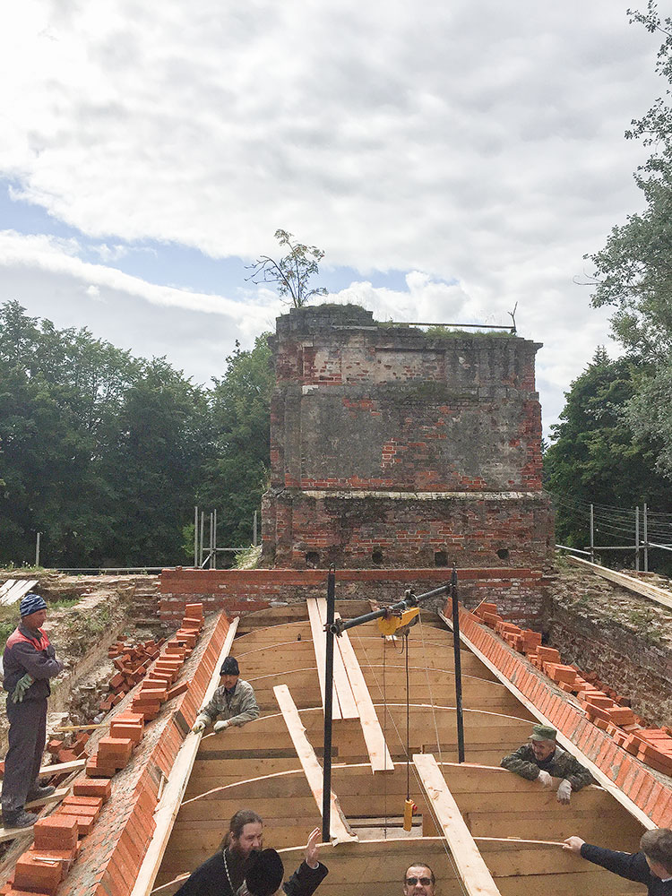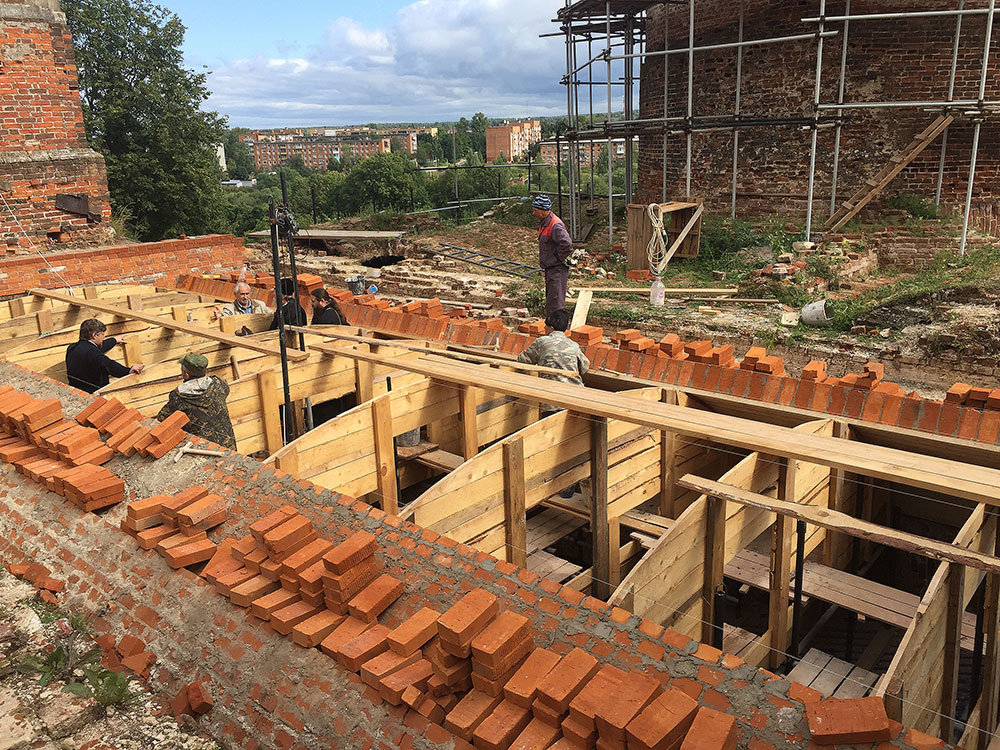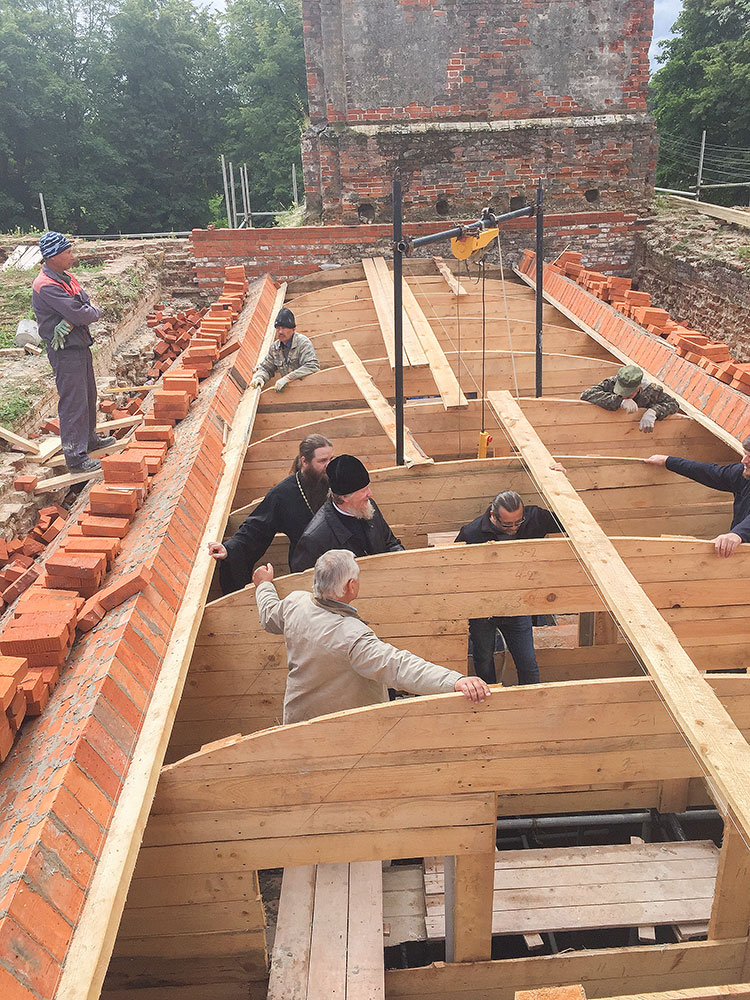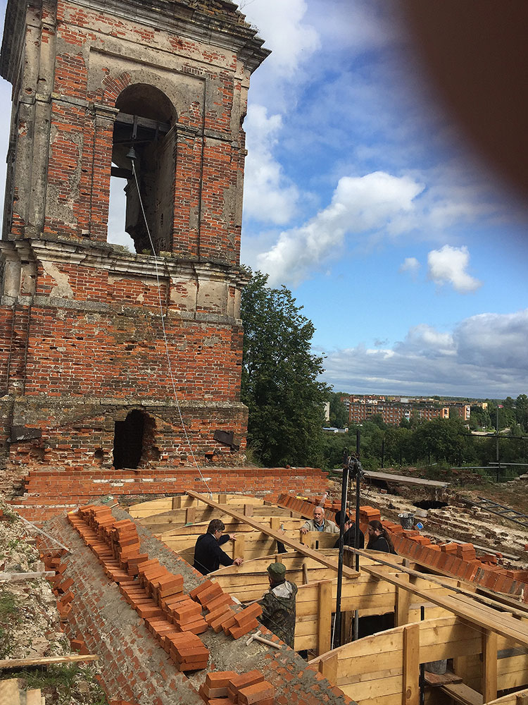 Противоаварийные, восстановительные и проектные работы по Знаменскому храму ведутся ещё с зимы этого года. На сегодняшний день сделано уже немало. На 60% произведена вычинка наружных и внутренних стен храма, расчищены оставшиеся своды, отреставрирован купол и барабан храма, делается большой свод над трапезной частью храма, подведено электричество и многое другое. И конечно все это время ведутся проектно-изыскательные работы. Сегодня благочинными было задано много вопросов главному архитектору и всё сводилось к скорейшей выдаче чертежей карнизов храма для того, чтобы можно было укладывать белокаменные блоки, чертежей главки, шара и креста храма и самое главное, так как близится зима, чертежей крыши храма. Совещание было результативное. Через неделю должны быть чертежи, так как эта работа архитекторами уже ведётся.