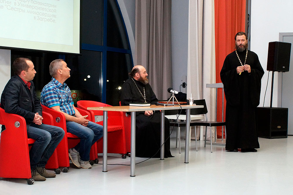 Священник Антоний Сенько представил презентацию, раскрывающую методику помощи зависимым в Семейных клубах трезвости и историей создания и развития Семейных клубов трезвости в мире и России.