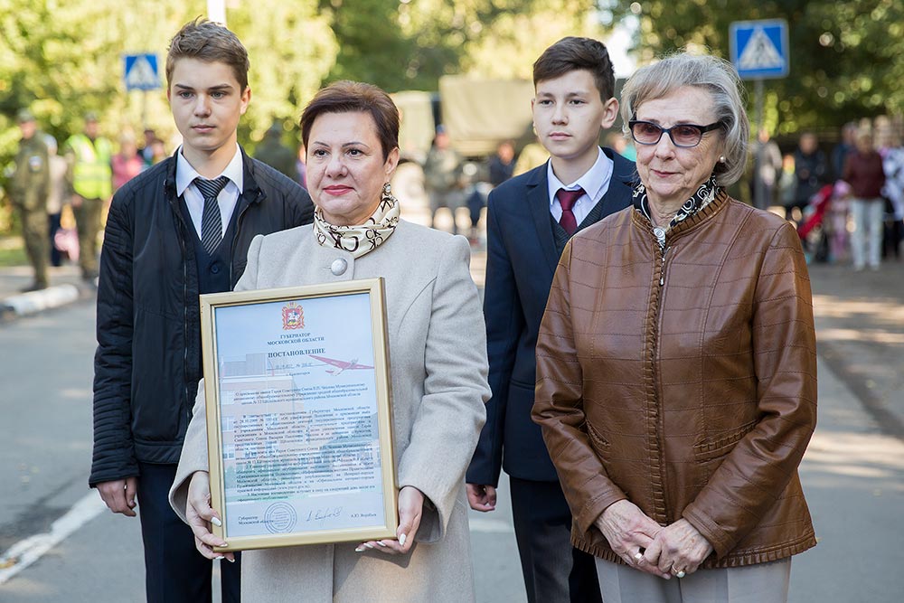 Во время торжественной части был зачитан указ губернатора Московской области Андрея Воробьёва о присвоении щёлковской школе № 12 имени Валерия Павловича Чкалова. Постановление об этом директору школы вручила дочь легендарного лётчика.