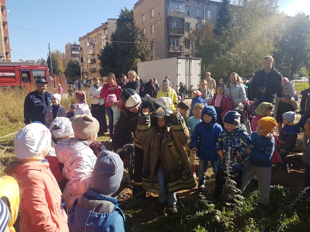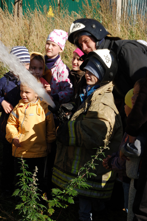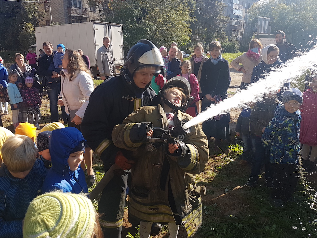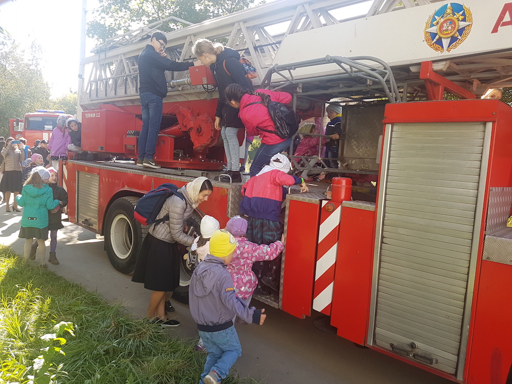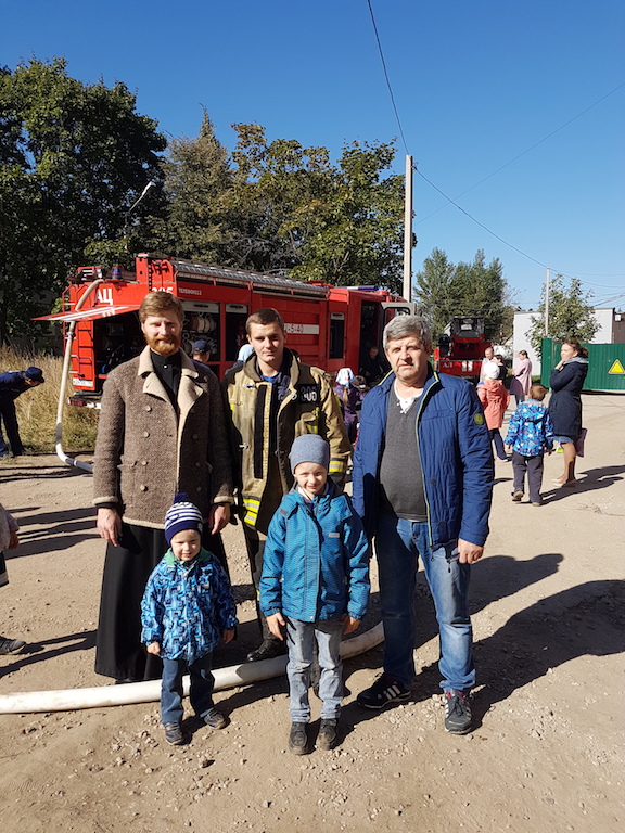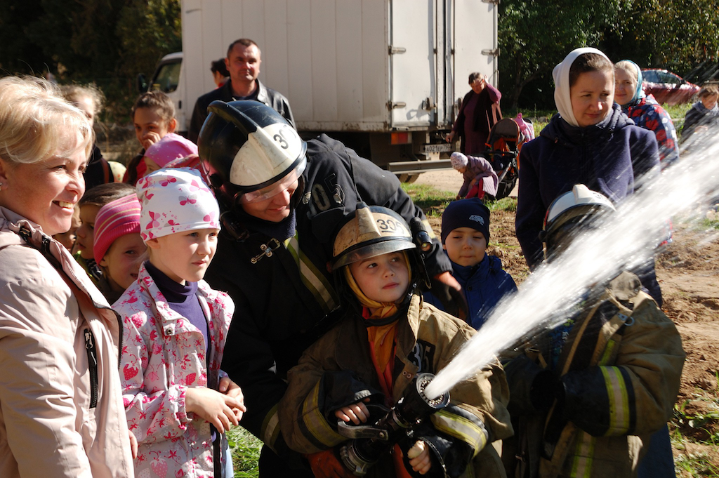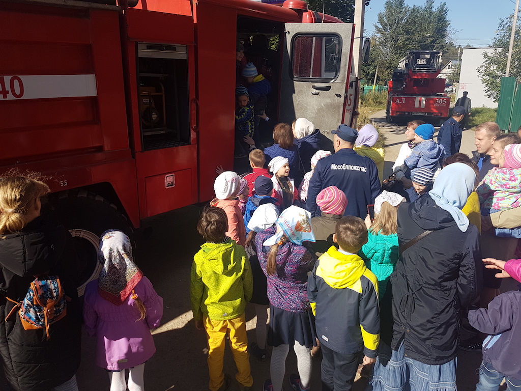Пожарные провели профилактическую беседу с детьми, продемонстрировали пожарные машины, рассказали об их устройстве и работаете на пожарах. В конце беседы всем желающим предоставили возможность осмотреть машины изнутри и попробовать себя в роли пожарных: одеть снаряжение и полить водой из брандспойта. Ребята и их родители поблагодарили пожарных за интересную и поучительную беседу, а настоятель Державного храма города Фрязино священник Димитрий Поповский пожелал огнеборцам сухих рукавов и подарил на память книги.