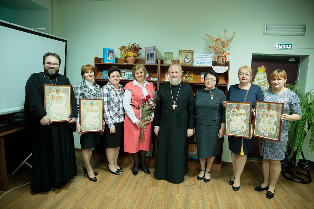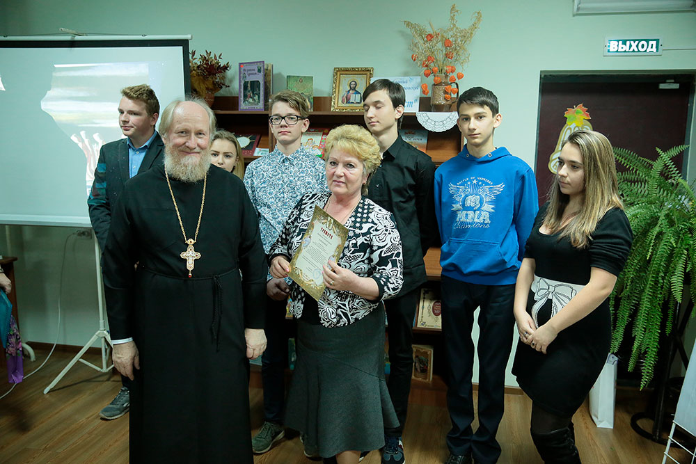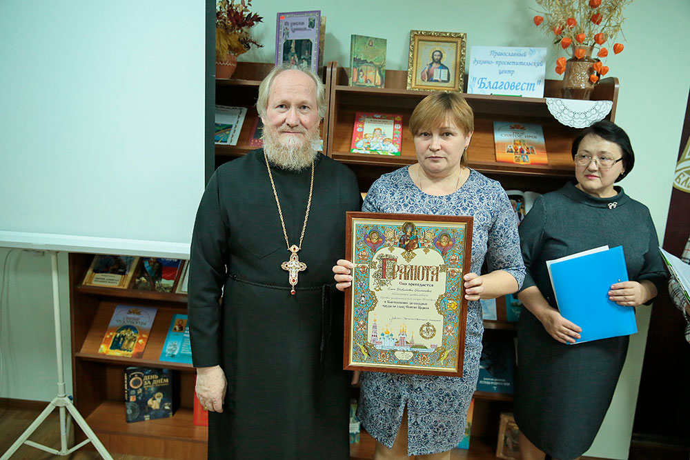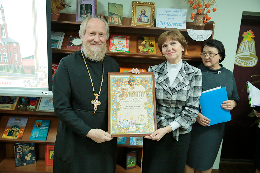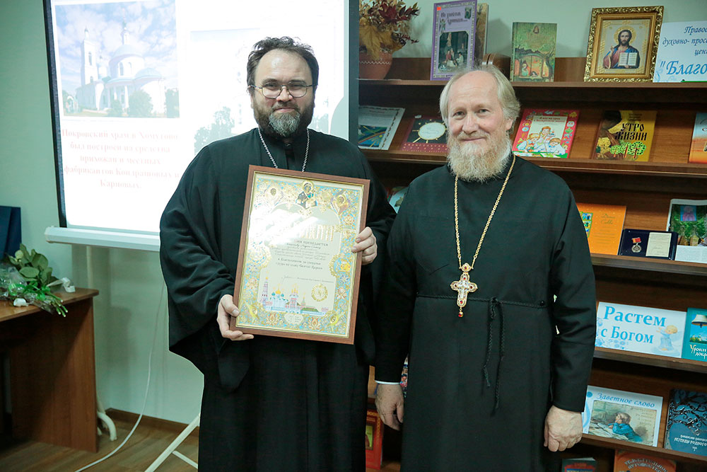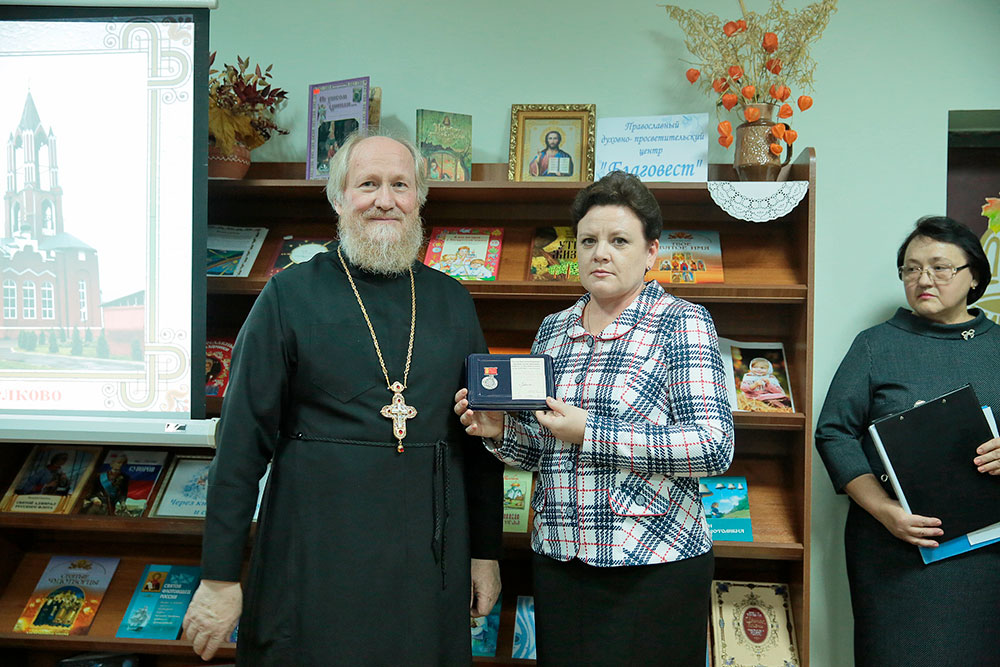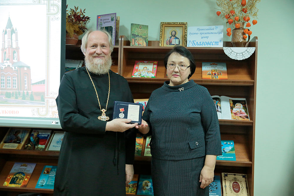 Отец Андрей поздравил коллектив центра «Благовест» с юбилеем и вручил медали Московской епархии Русской Православной Церкви «За жертвенные труды» III степени: заведующей Районной библиотекой семейного чтения - руководителю Православного духовно-просветительского центра «Благовест» Ивановой Светлане Александровне, заведующей сектором православной литературы Районной библиотекой семейного чтения Воронковой Татьяне Васильевне; Благословенные грамоты митрополита Крутицкого и Коломенского Ювеналия: духовнику центра «Благовест» священнику Андрею Семину и сотрудникам центра Колгановой Елене Николаевне, Тощевой Маргарите Александровне и Мастерских Марине Викторовне.