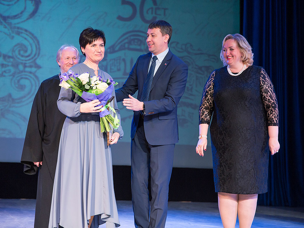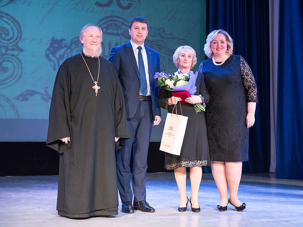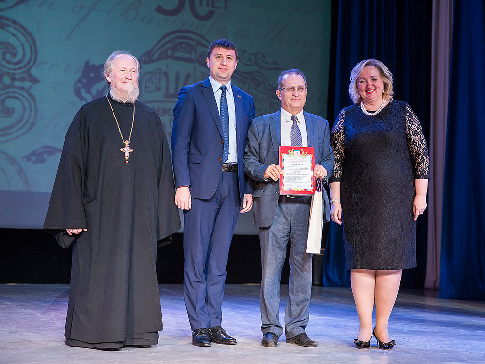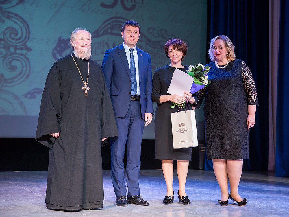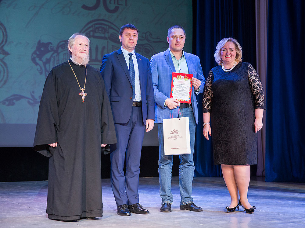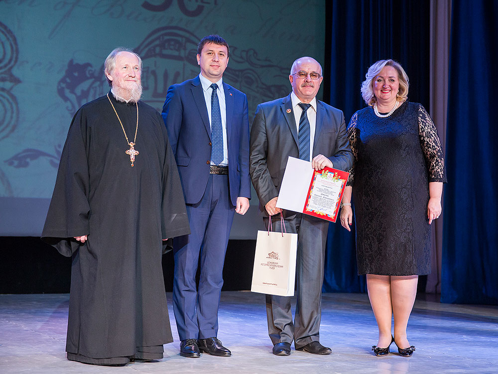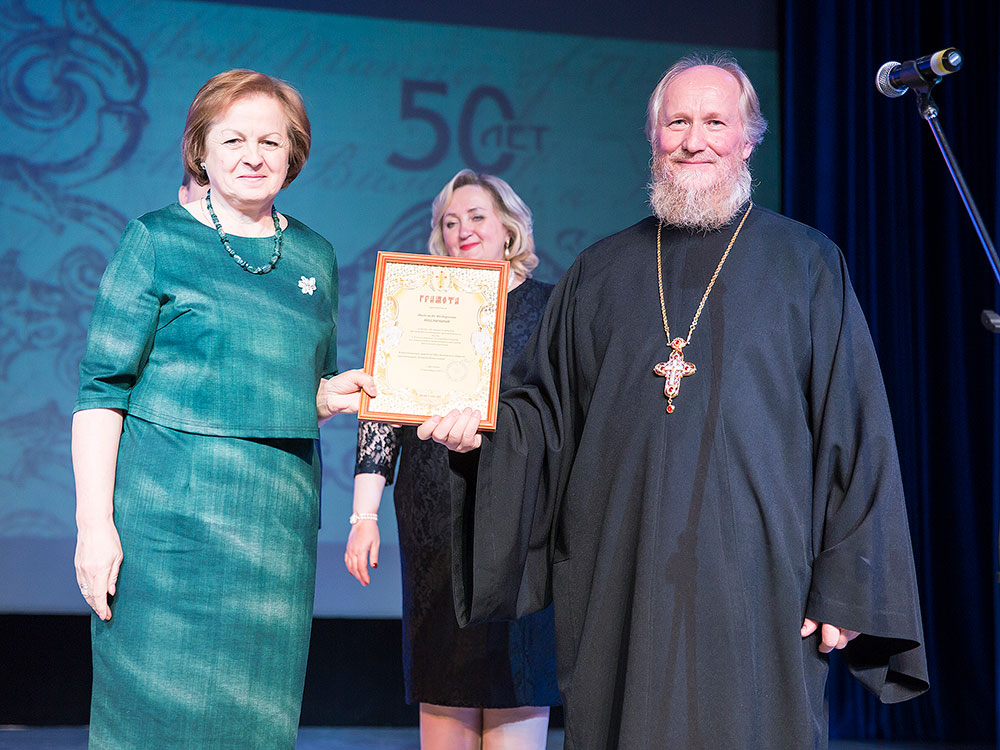 Отец Андрей поздравил коллектив музея с юбилеем и вручил Благодарственную грамоту митрополита Крутицкого и Коломенского Ювеналия директору Щелковского музея Наталье Владимировне Богдановой и грамоту Щелковского благочиния научному сотруднику музея Надежде Федоровне Подзоровой.