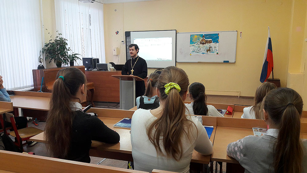 Настоятель Богородицерождественского храма пос. Образцово священник Димитрий Выдумкин провел в 6 классе беседу со школьниками о важности призвания молодого человека быть защитником Родины. В конце беседы был показан мультфильм "Солдатская песня".