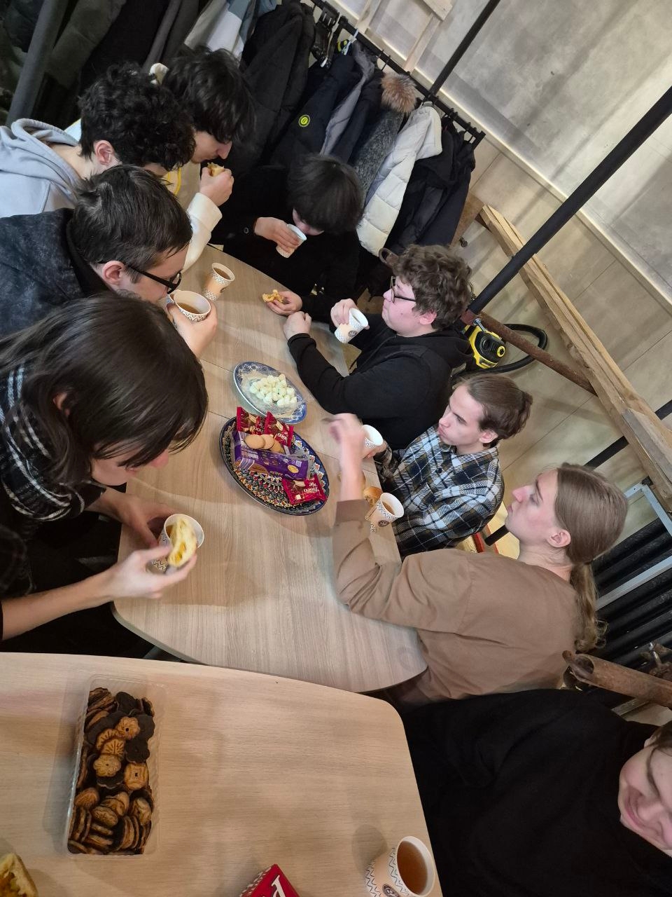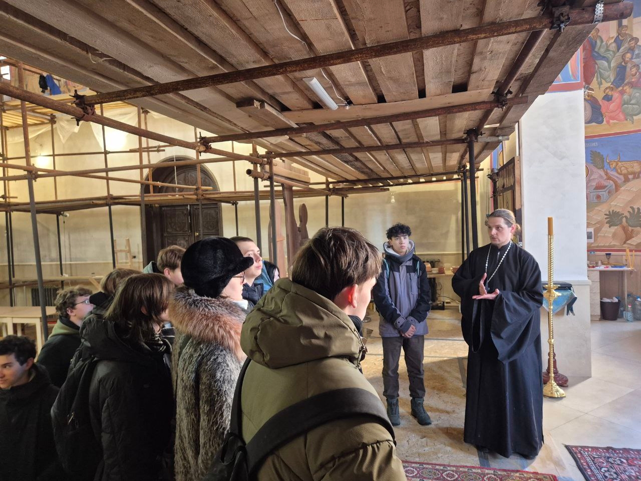Отец Владимир рассказал ребятам историю возникновения храма и показал храм изнутри, где все еще продолжаются отделочные работы, но уже ведутся службы, рассказал об устройстве храма, особое внимание уделив алтарной части. Затем в уголке храма состоялась душевная беседа за чашкой чая, где ребята делились с отцом Владимиром рассказами о студенческой жизни и специальности, которую они получают, вызвав у священника живой интерес.