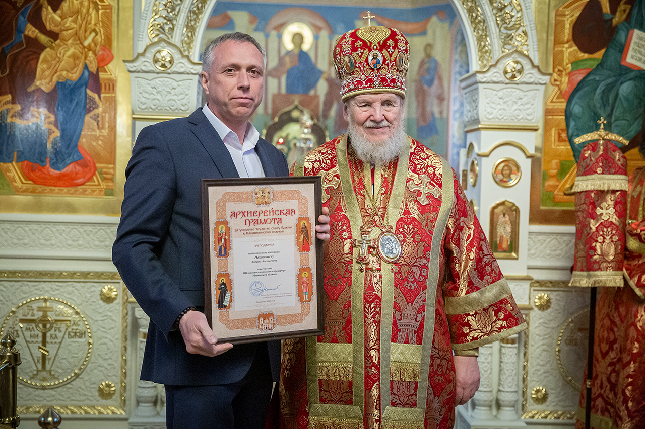 Затем Его Преосвященство обратился к духовенству и молящимся с архипастырским словом и вручил грамоты Балашихинской епархии начальнику управления территориальной безопасности Администрации города Щёлково Александру Сергеевичу Колесникову, советнику Главы городского округа Щёлково по вопросам безопасности и противодействию коррупции Андрею Геннадьевичу Сальникову и военному комиссару городских округов Щёлково, Фрязино, Звёздный городок и Лосино-Петровский, капитану Александру Николаевичу Рыжову.