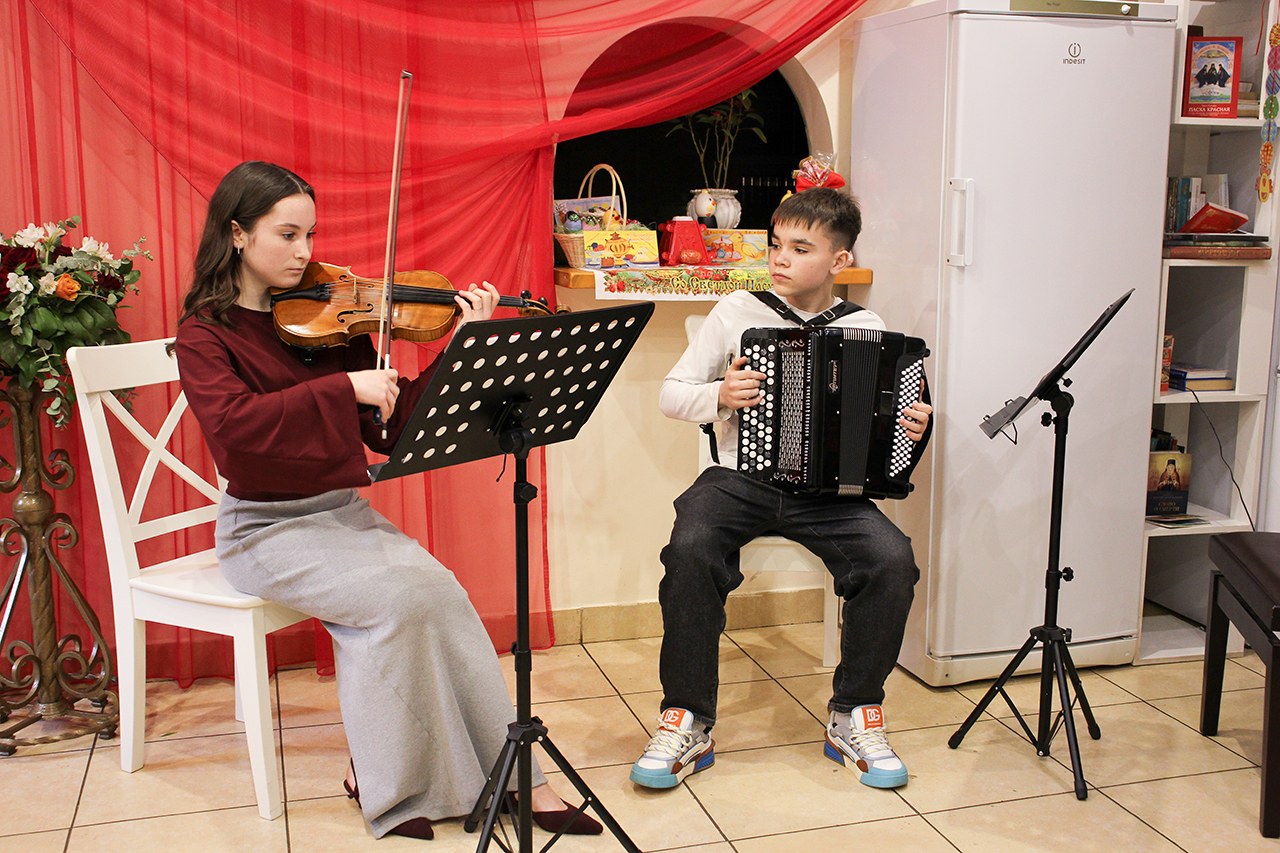 После Божественной литургии и раздачи артоса, по благословению настоятеля храма священника Виктора Долгих и торжественного пения «Христос Воскресе…», начался концерт. Со сцены звучали стихи и песни о Воскресении Господнем, о храмах, о святынях, о Вере. На вполне профессиональном уровне детьми были исполнены несколько классических музыкальных произведений и театральных сцен, прозвучали стихи собственного сочинения. Выступали все с большим воодушевлением, зрители от души благодарили юных артистов аплодисментами.